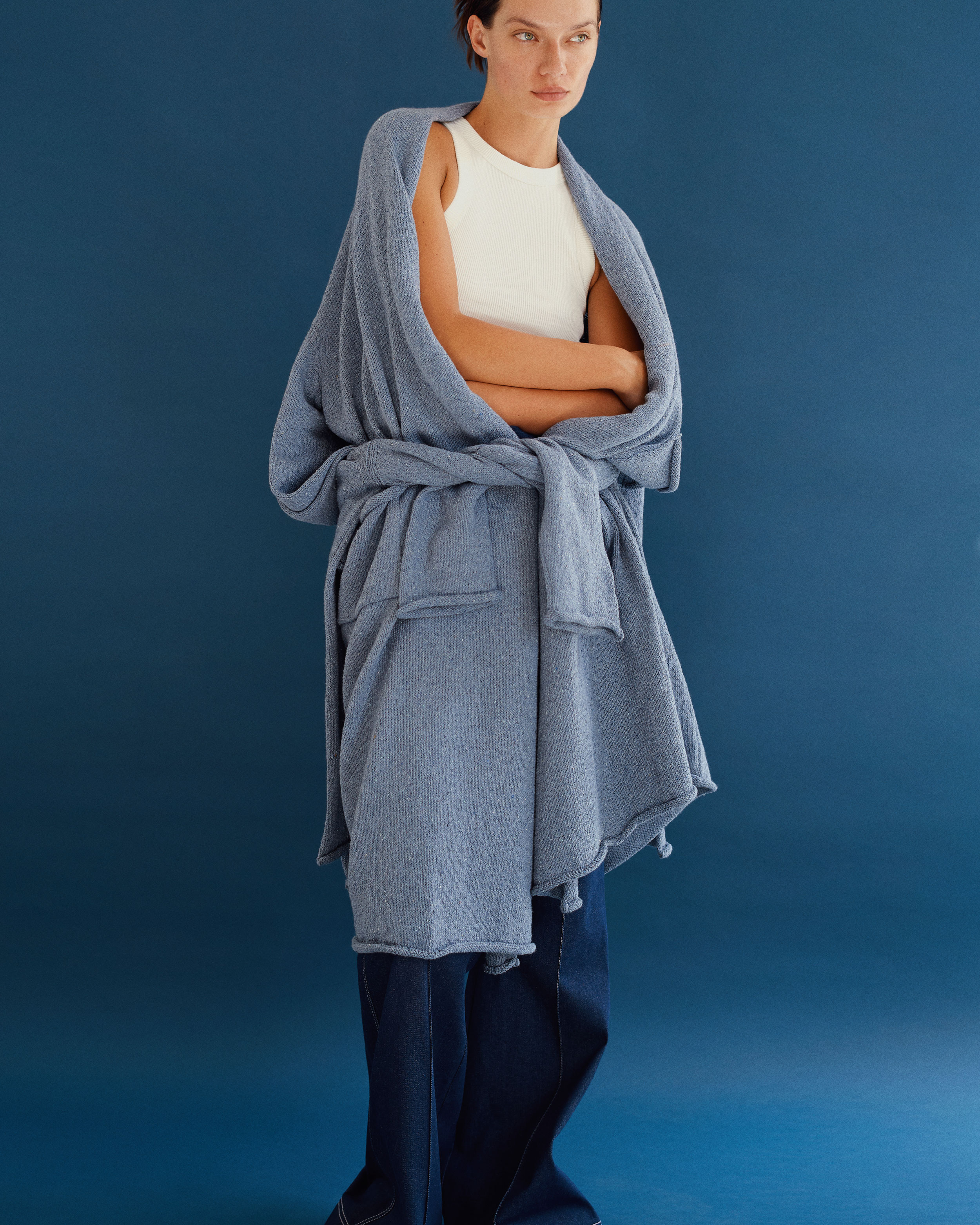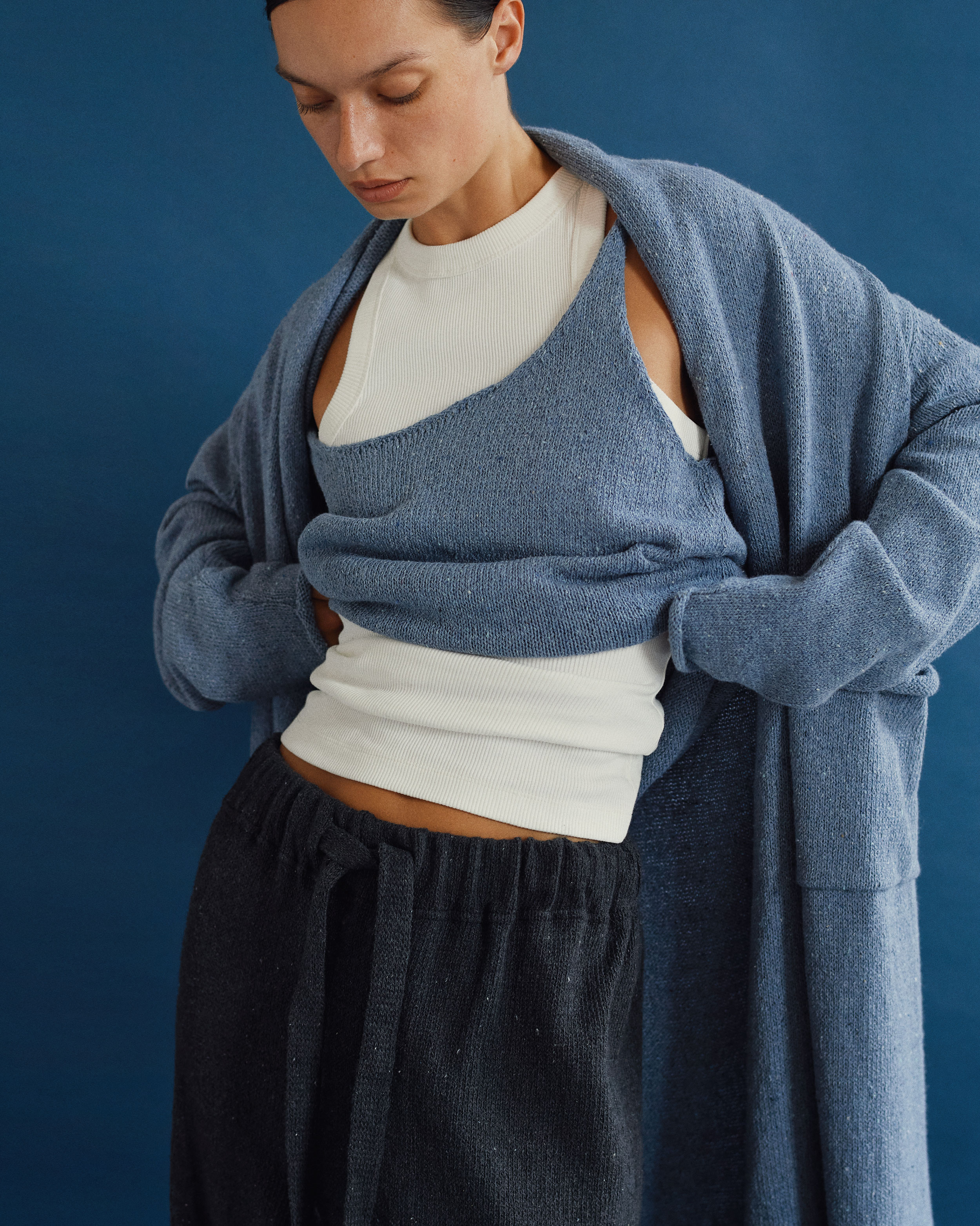 Нитка, з якої виготовлений трикотаж, створена зі старих джинсів. За допомогою спеціальних машин джинсове полотно подрібнюється та перетворюється на волокна, які далі скручуються в мотки. W8LESS зробили свій внесок в розвиток українського ресайклінгу – складного, кропіткого і дорогого процесу. Такі речі значно важче виготовляти, потрібно враховувати безліч факторів і переналаштовувати виробництво.