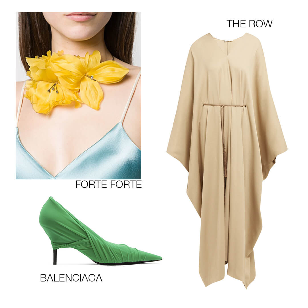 Сочетание гламура и благородства — беспроигрышный вариант и прекрасная альтернатива привычным ярким блузам, юбкам и утилитарным платьям. Не стоит опасаться излишней грандиозности, её нивелируют неочевидные туфли с драпировками сочного оттенка и изящное цветочное колье.