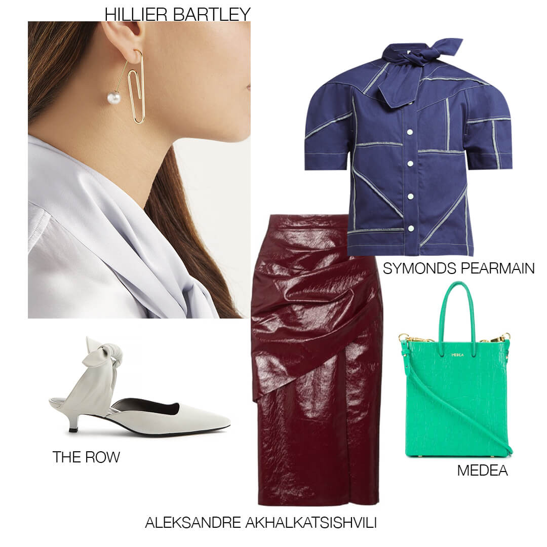 Игривый бант на блузе из денима, серьга-скрепка с деликатной жемчужинкой и сексуальная кожаная юбка будут выглядеть не скучно и в то же время элегантно. Дополнить образ небольшой сумочкой яркого оттенка и светлыми туфлями — всё это придаст наряду весенней свежести и лёгкости.