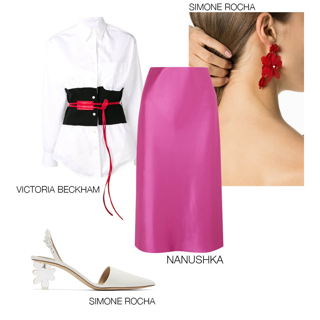 Строгая белая рубашка давно перестала быть атрибутом делового дресс-кода, и теперь её можно надевать даже на самые развесёлые мероприятия. С широким корсажным поясом, в сочетании с шелковой юбкой оттенка цикламена и туфлями с необычным каблуком, такая блуза станет отличным аккомпанементом к вашей женственности — образ получится не слишком жеманным и при этом экстравагантным.
