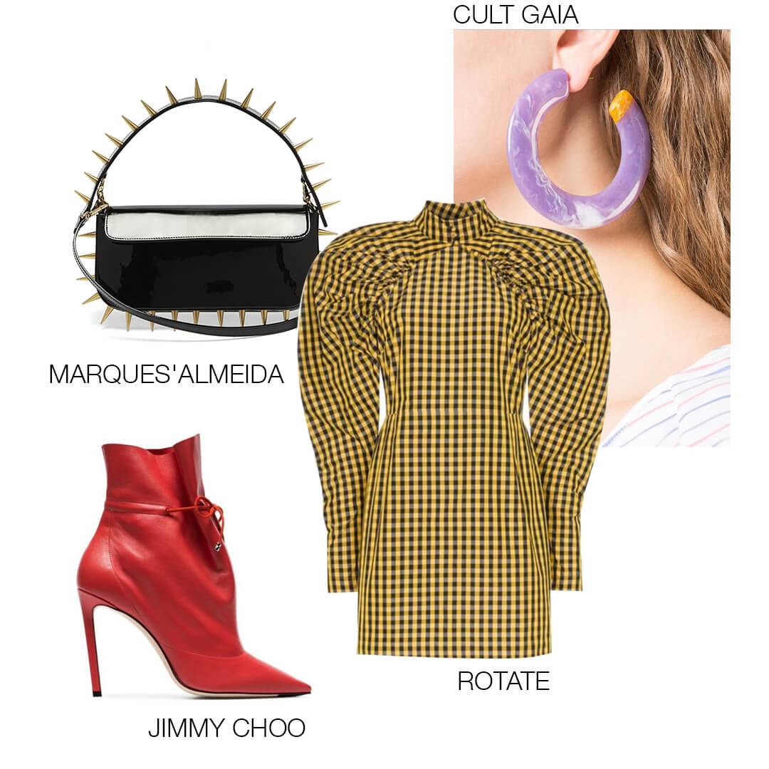 Ультрамодное мини в стиле 80-х, лаковая сумочка, отсылающая к панк-культуре, в которой и мужчины, и женщины всегда равны, и яркие ботильоны — отличный способ выразить внутреннюю свободу, желание повеселиться и природное обаяние. Необычные серьги придадут образу изысканности.
