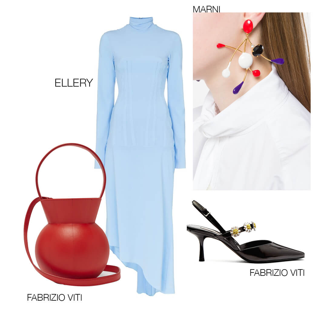 Сдержанное платье небесного оттенка с асимметричным низом идеально дополнит разноцветные серьги в стиле абстрактного искусства прошлого века, ироничная сумка, напоминающая не то вазу, не то восьмёрку или даже гантель, и по-девичьи весёлые туфли с нежными ромашками на ремешках. Главный принцип, по которому можно составить и любой другой образ, сохранив описанную структуру: соединить сексуальность, авангард и немного наивности.