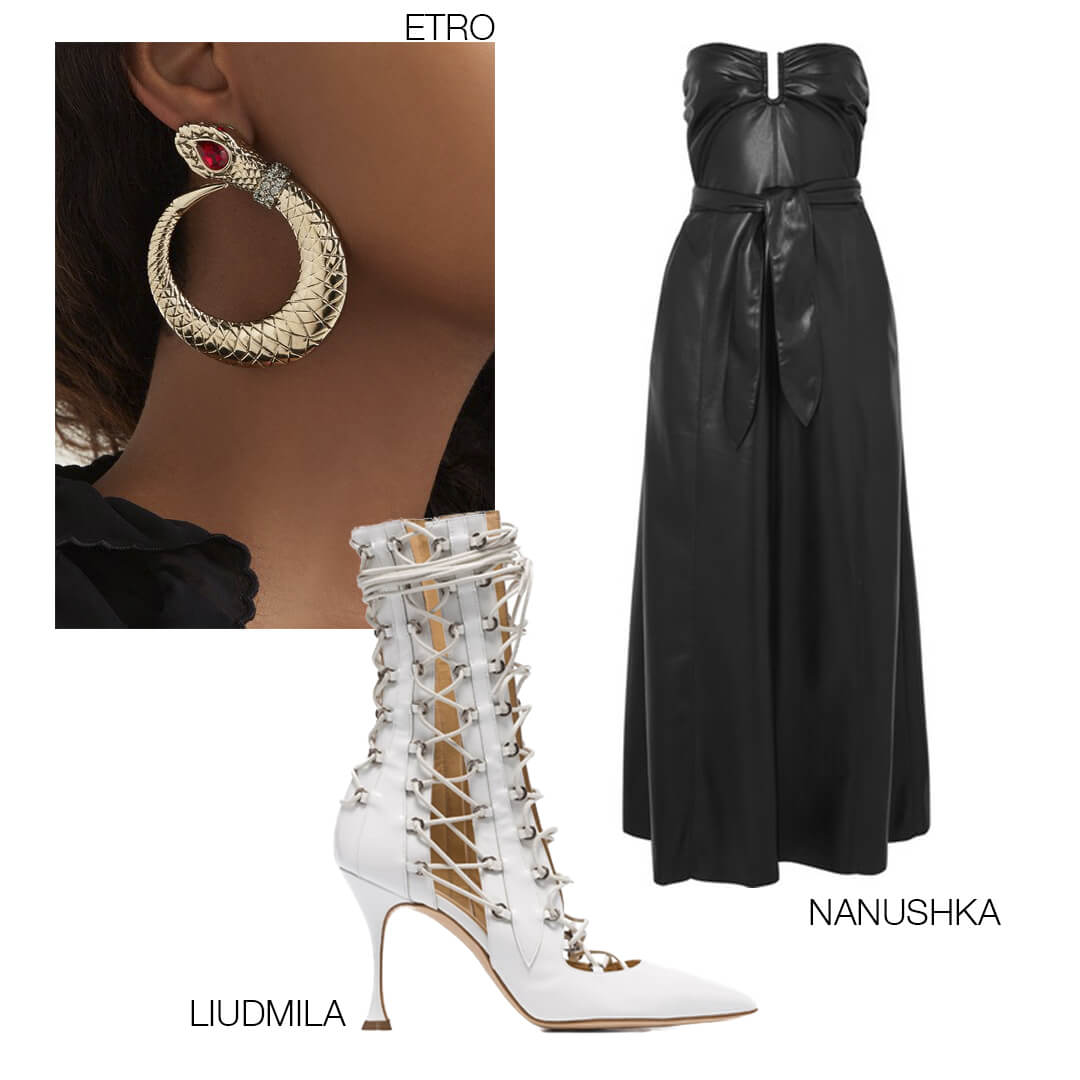 Остро гламурный, сексуальный и вместе с тем изысканный образ — то, что нужно для фундаментального доминирования. Бескомпромиссно роскошные серьги, платье из кожи неочевидного фасона (лучше не выбирать короткие или слишком открытые) и фетишистская обувь контрастного цвета со множеством шнуровок — в таком наряде можно не просто чувствовать себя богиней, но и быть ею.