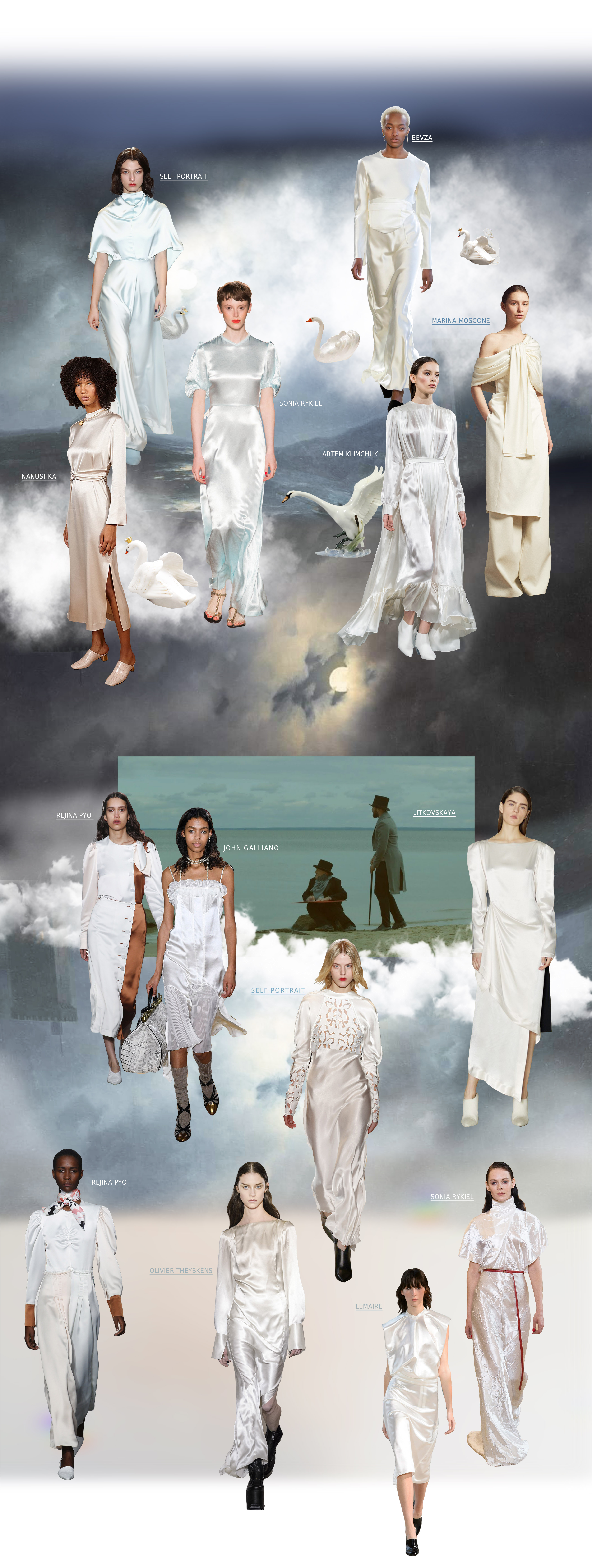 Говорят, в основу сюжета балета «Лебединое озеро» Петра Чайковского легла немецкая легенда о прекрасной девушке, которую колдун превратил в лебедя. Мотивы колдуна не уточняются – думаем, он решил сделать это просто потому, что может. Главная героиня истории и балета – Одетта, та самая принцесса, что по воле злых чар живет в озере и в перьях. И именно она, на наш взгляд, может олицетворять один из микротрендов, который мы заметили на подиумах во время показов осенне-зимних коллекций: дизайнеры представили целую серию белоснежных атласных платьев, романтичных и немного трагичных, как и история об Одетте.