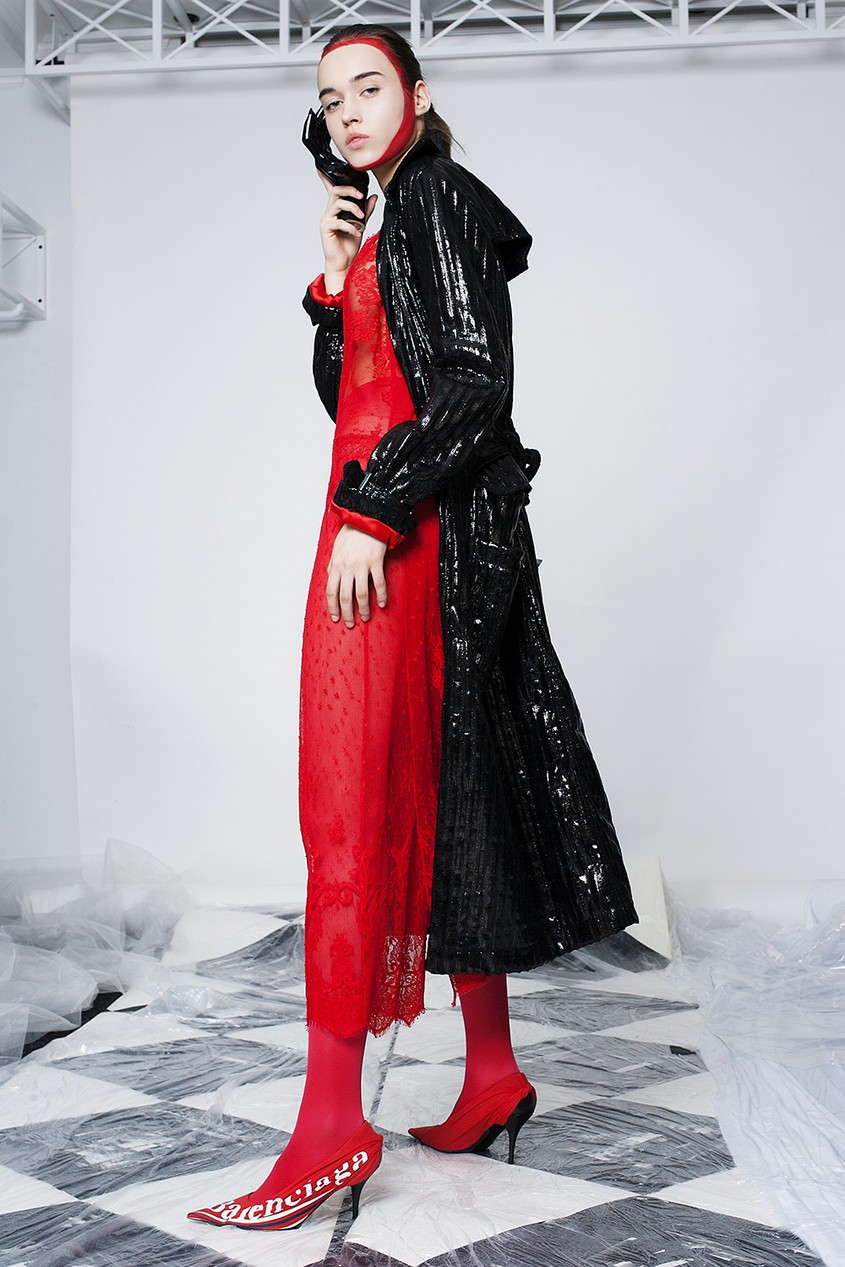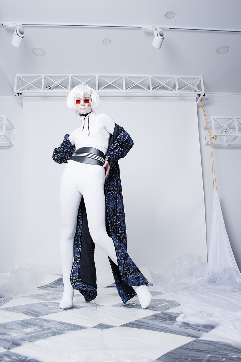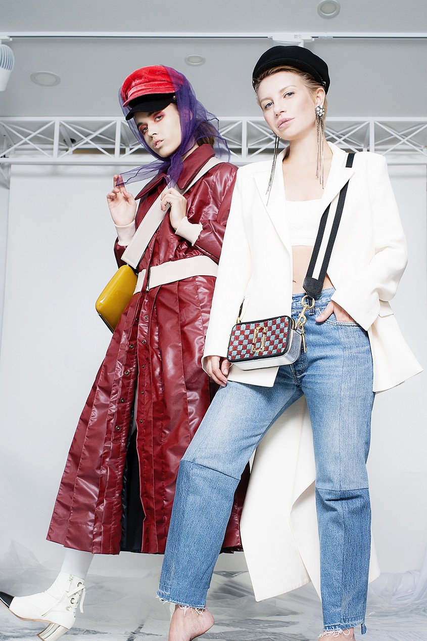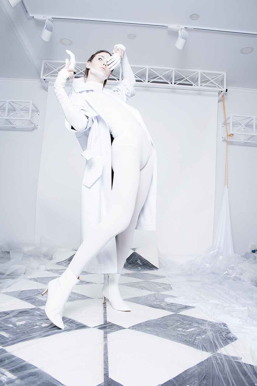 В съемке легко уловить аллюзию на сказочных героев Льюиса Кэрролла: модель в белом виниловом тренче с отчетливой улыбкой на лице — модная интерпретация Чеширского Кота, смелые контрастные луки отсылают к образам королевской стражи, у «гусеницы» — синие румяна и головной убор в тон, а Таня-Алиса — в бело-голубом брючном костюме, который дополняет «кошачьими» очками, и платье-бюстье с инфантильно-розовой водолазкой, яркой обувью и длинными перчатками. Why don't you — как говорила легендарный редактор американского Vogue Диана Вриланд в своей знаменитой рубрике.