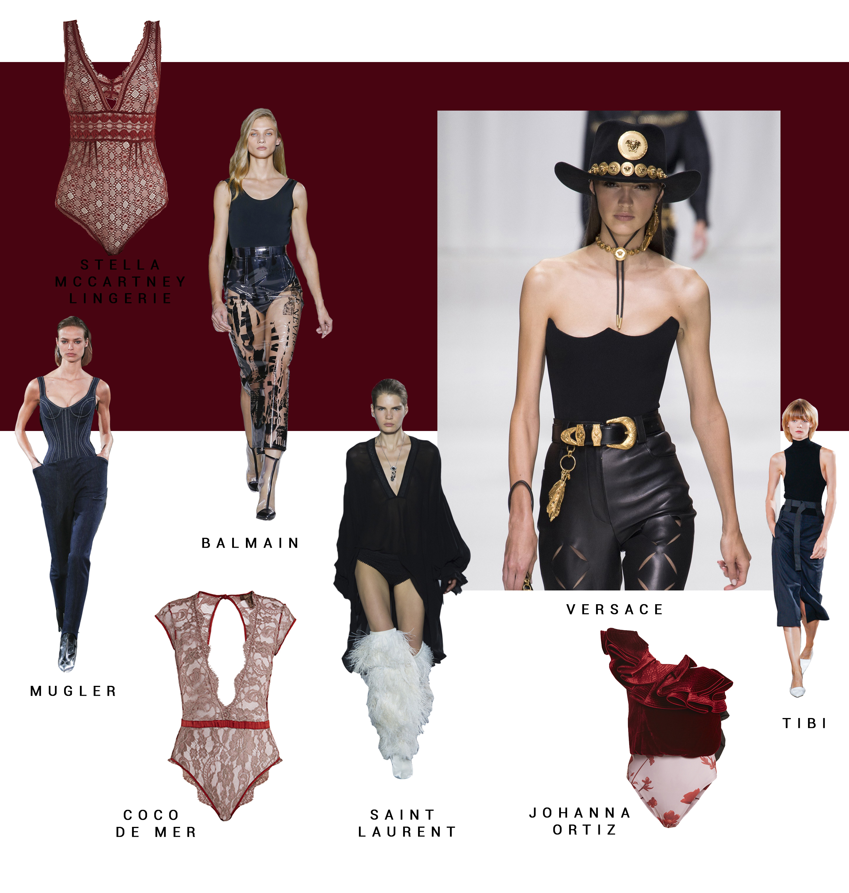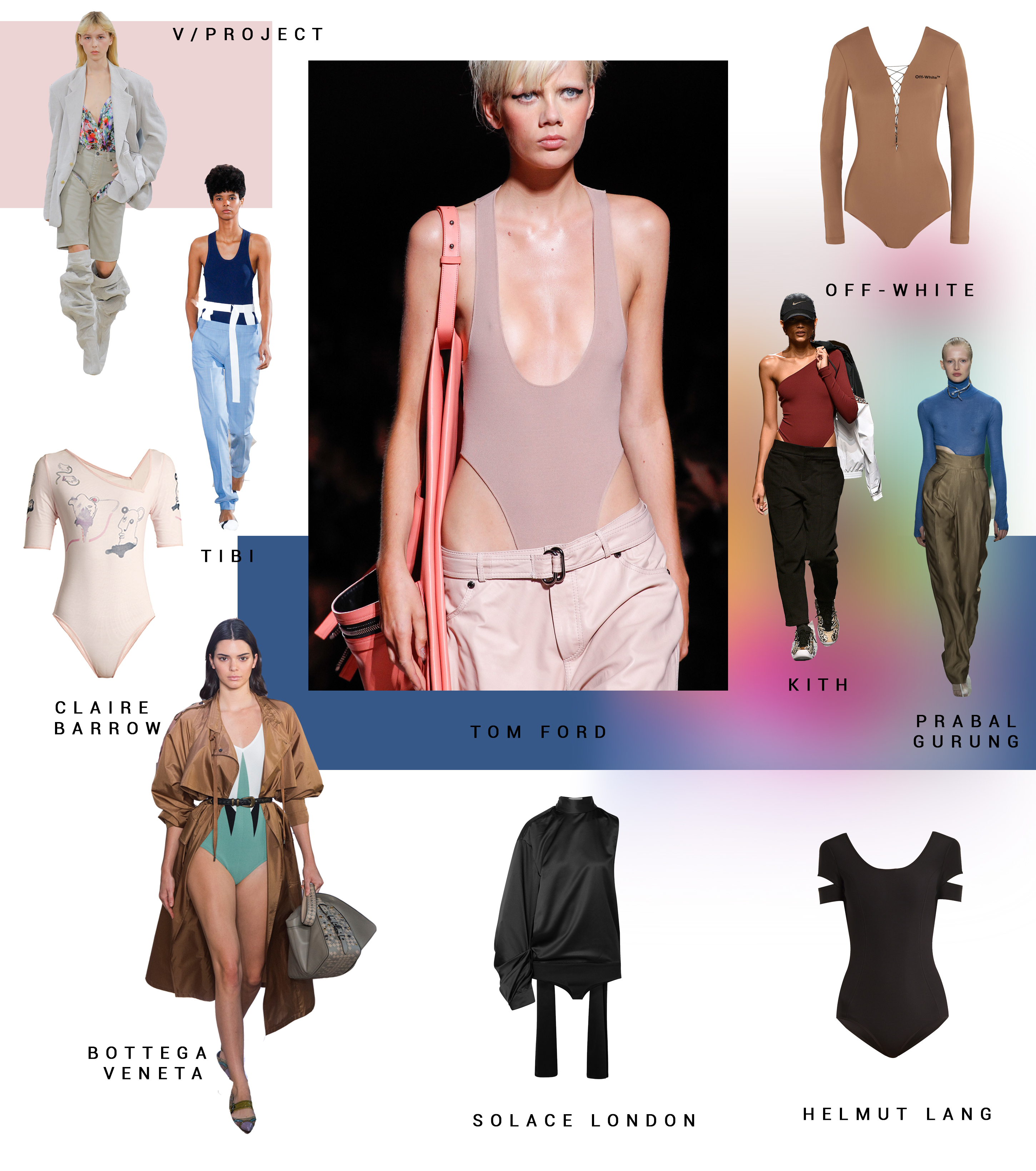 Близкий родственник слитных купальников, боди уже давно перестало быть скрытым предметом одежды. Например, Стелла Маккартни утверждает, что это одновременно просто и очечь сексуально. Ей вторят Том Форд, который предлагает носить боди с брюками ультранизкой посадки, чтобы оголить линии бедер, и Вирджил Абло в Off-White, который вставляет декоративную шнуровку, приоткрывая декольте. Кстати, Форд популяризировал этот прием еще в 1990-х, когда трудился над созданием нового имиджа для умирающего Gucci. На показе Balmain модель и вовсе шла лишь в черном «купальнике» и прозрачной пластиковой юбке, а Mugler показывали, как носить его с мини-юбкой и не выглядеть вульгарно. Здесь и вправду нужно быть осторожным: боди — это в первую очередь предмет из категории нижнего белья, и, выставляя его напоказ, переборщить очень просто. Чтобы этого не случилось, берите пример с Versace, Y/Project или Tibi: приглушенная цветовая гамма + любопытные аксессуары.