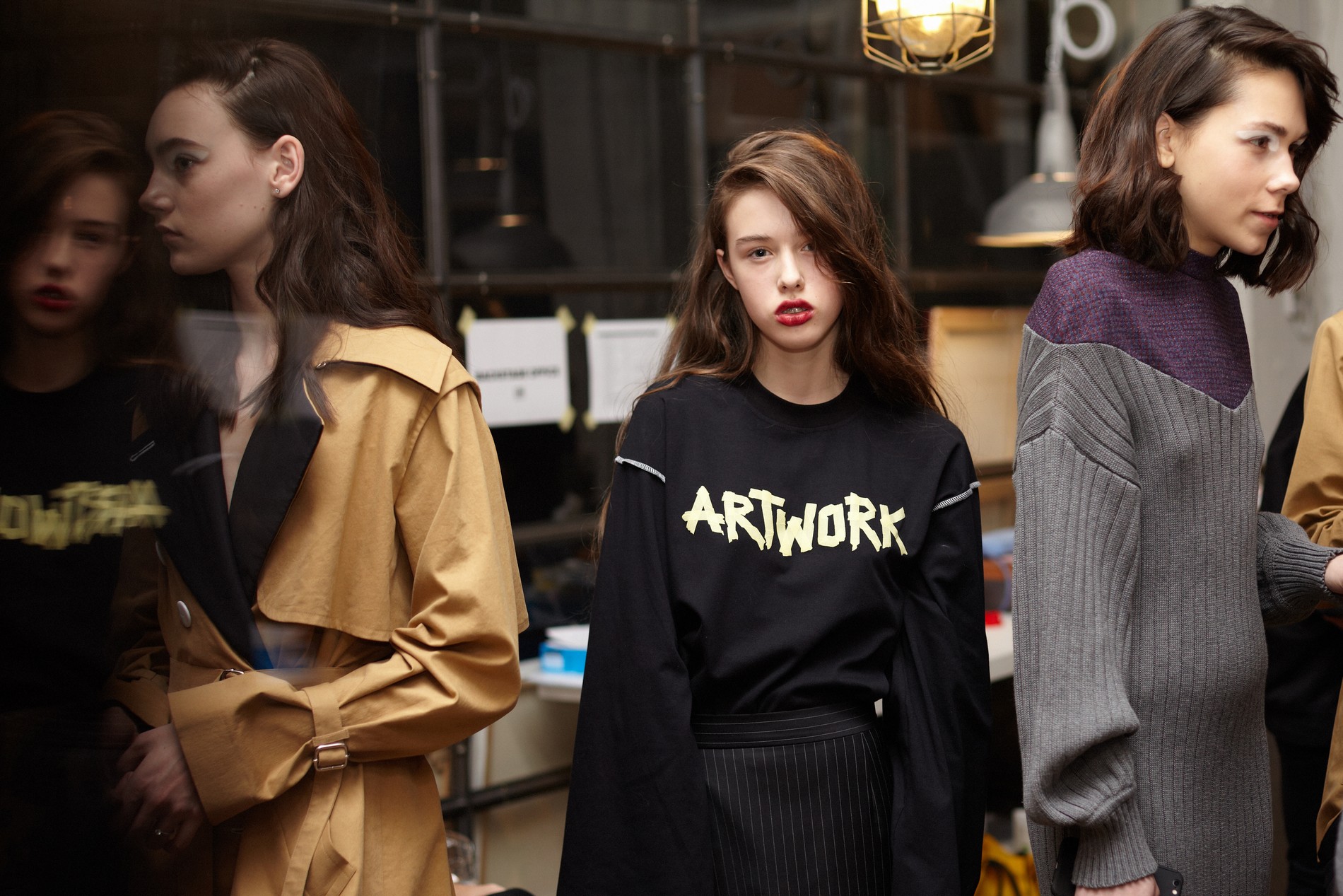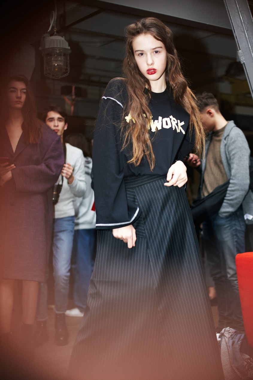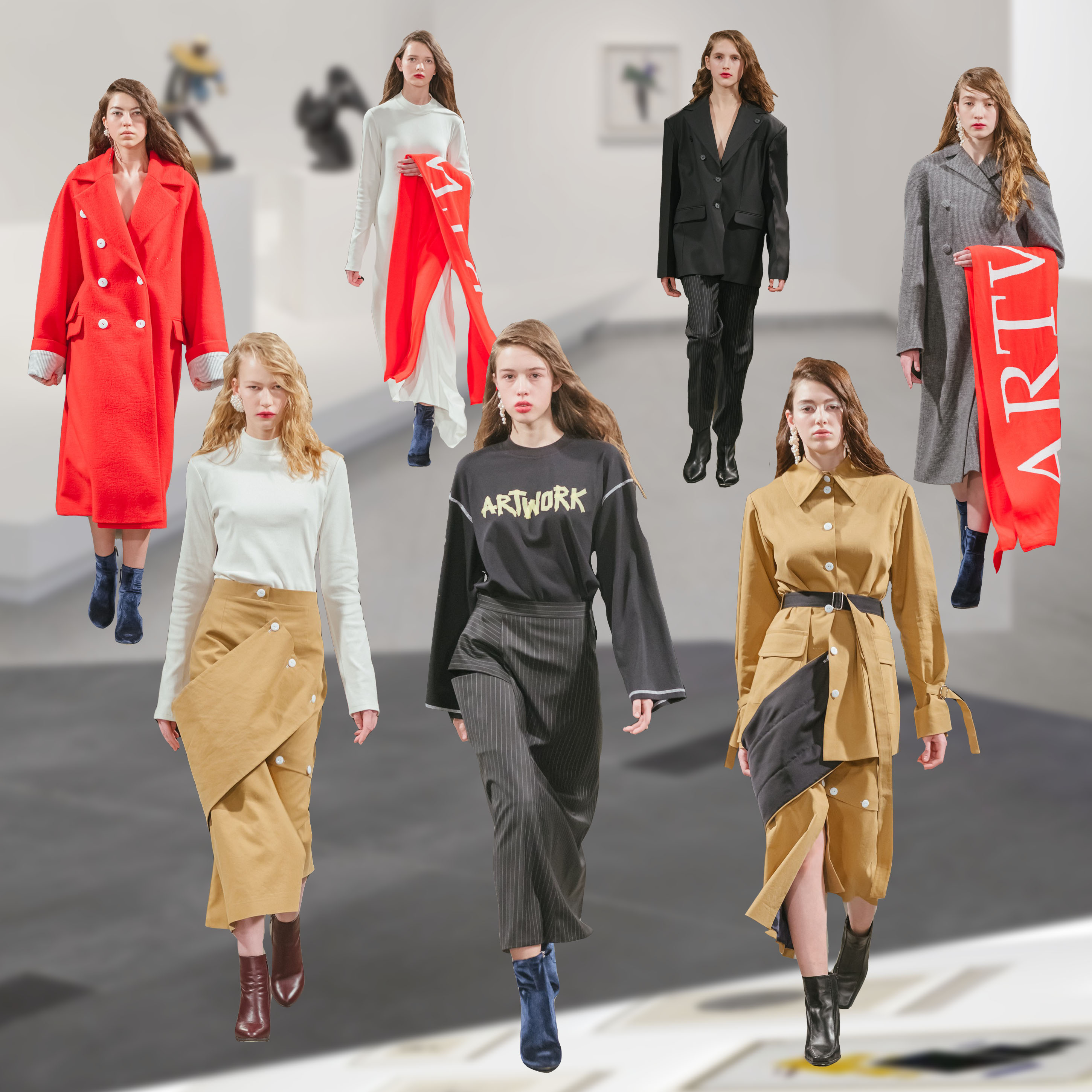 Коллекция вдохновлена искусством, музеями и разнообразными направлениями в живописи: чтобы продемонстрировать это, на свитшотах и ярких алых шарфах в руках у моделей было написано ARTWORK. Кроме того, к этой же теме отсылали одновременно точеные и богемные силуэты, макияж, состоящий из крупных белых, будто алебастровых, мазков на веках и чуть размазанной помады насыщенного цвета, и весь бьюти-лук, включая аккуратно встрепанные волосы.