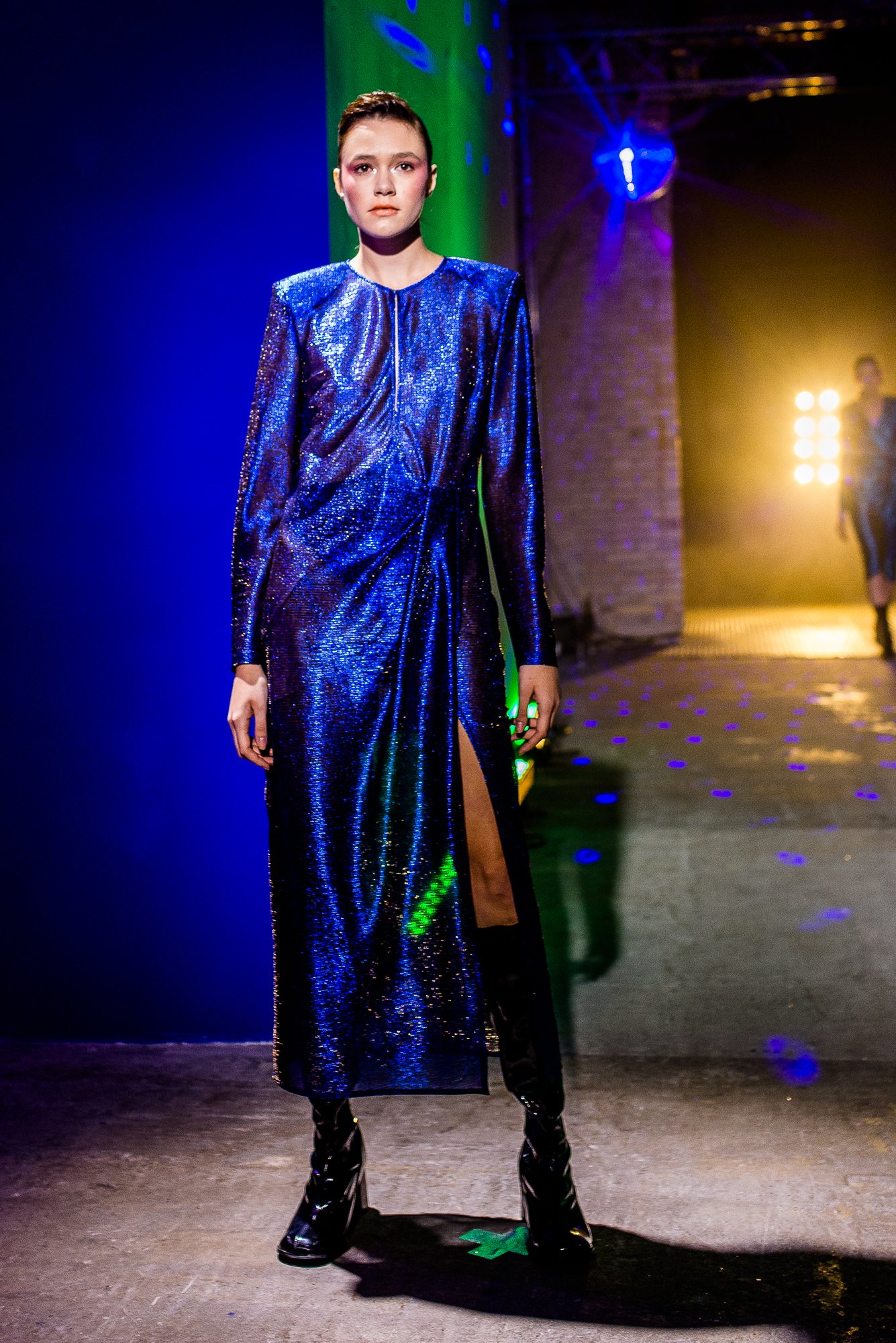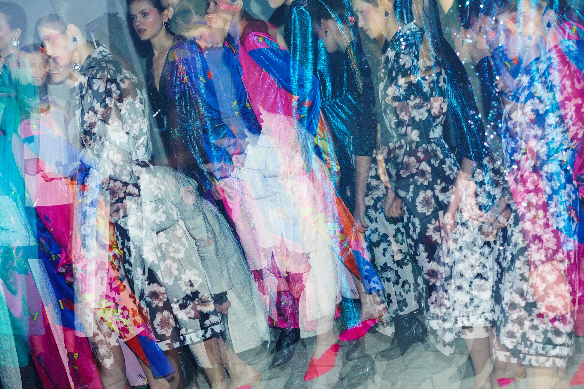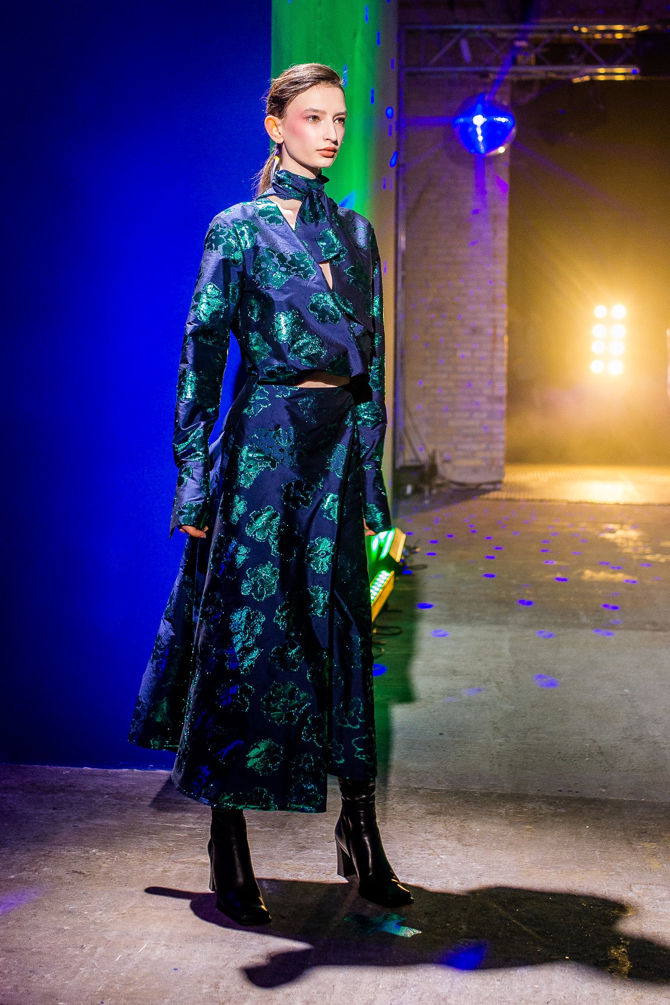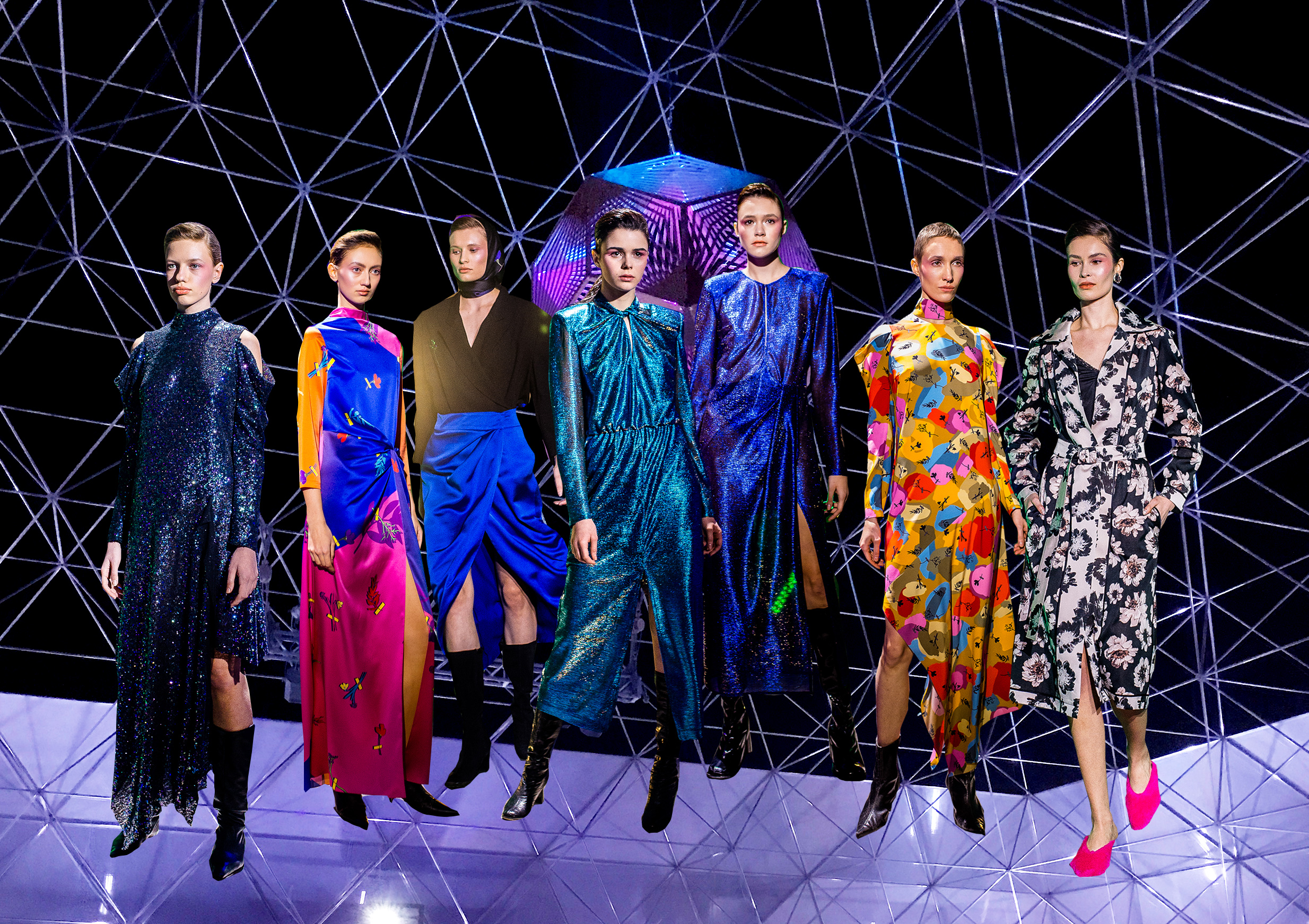 Коллекция посвящена искрящемуся, «люминесцирующему» человеку – во всех возможных значениях этого слова. Это и о том, как сейчас люди пытаются повторить природу и слиться с ней или с космосом, и о внутреннем сиянии, и о желании украшать себя блестящими текстурами или глиттером. В новой коллекции Лилии много непохожего на Poustovit, много переосмыслений привычных кодов бренда: так, даже принтованные платья, обязательные для дизайнера, представлены в необычных цветовых схемах. Платья в принципе стали основой коллекции, хотя любимый лук редакции – это все равно мерцающий сине-зеленый комбинезон. Платья-халаты, платья с высоким разрезом, яркие модели насыщенных цветов длиной в пол – и везде по-прежнему цитируется природа, хотя опять-таки в непохожем на Пустовит прочтении.