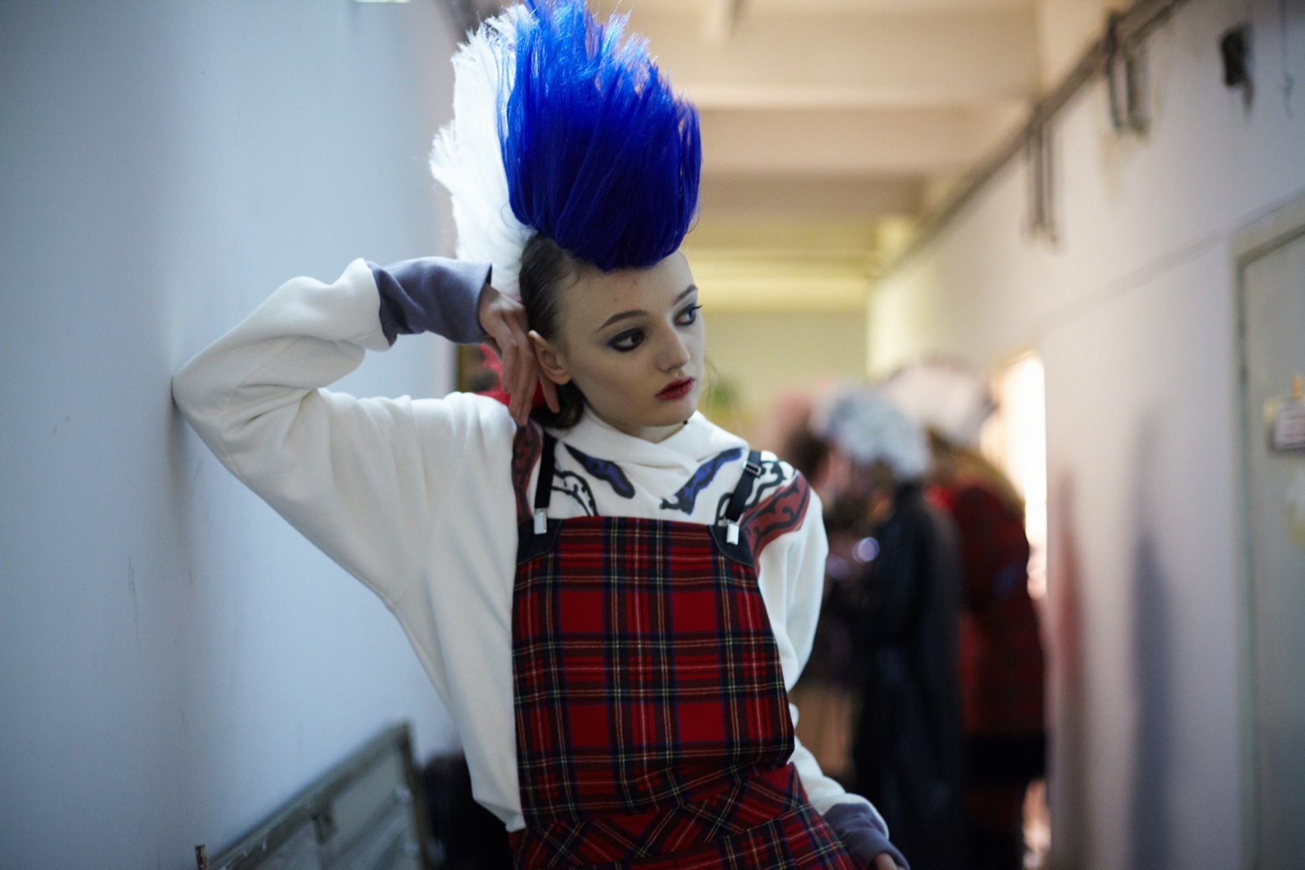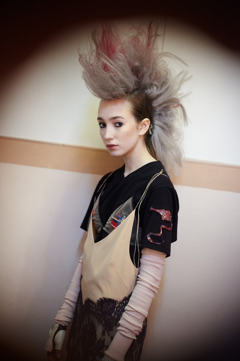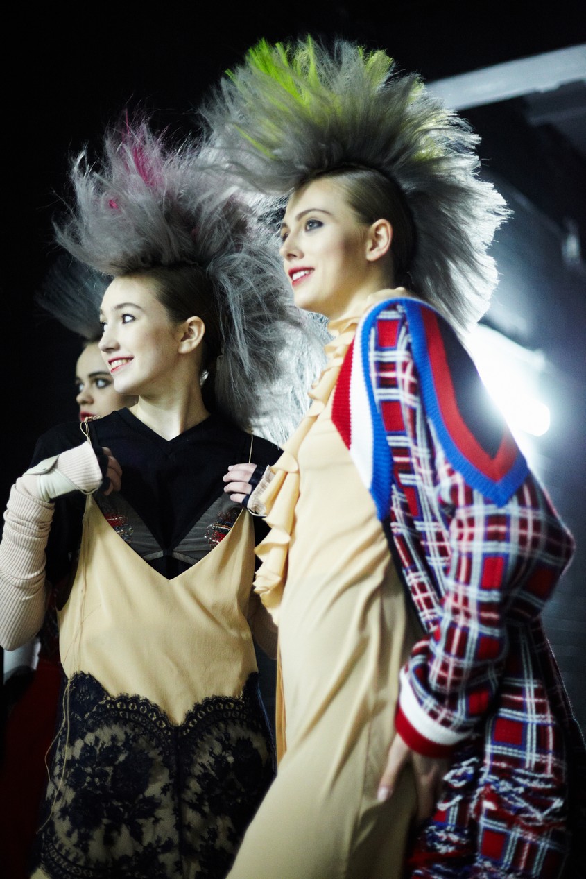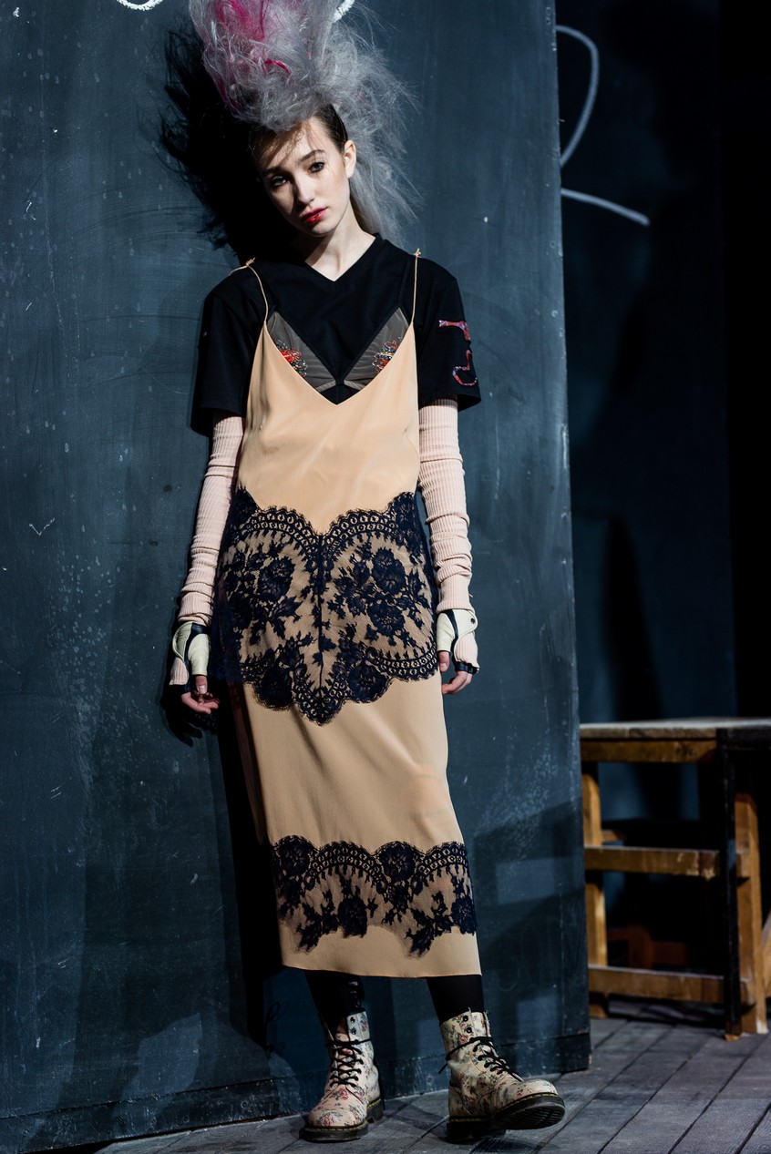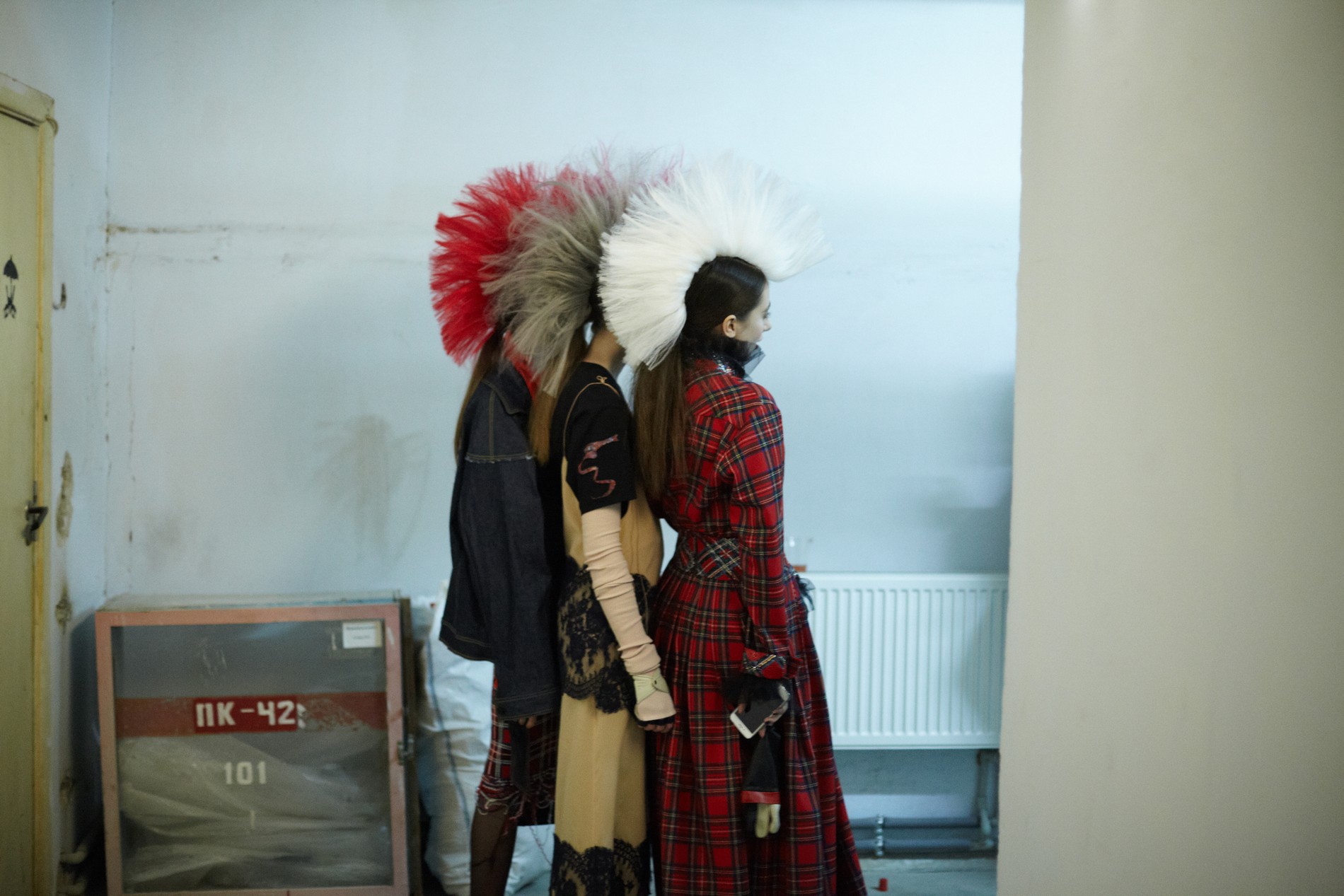 Все свои референсы Фролов пропускает через оптическое стекло своей эстетики, интеллектуальной провокации – вот и панки, субкультура, в общем-то, не самая чувственная, в его прочтении стали тонкими и сексуальными благодаря полупрозрачным текстурам, деталям вроде кружевных поясов для чулок, объемным курткам на обнаженное тело, корсетам и платьям-комбинациям. Битва двух исторических эпох, викторианства и панка, происходила не только в поле одежды, но и бьюти: модели появлялись то с грандиозными ирокезами работы Юлии Стець, то с высокими припудренными париками и выбеленными лицами. Все происходящее завершал аккомпанемент пианиста Олега Безбородько и сопрано Инны Галатенко, которые исполняли произведения Валентина Сильвестрова. И все же шоу и его зрелищность не смогли отвлечь от одежды: в этом сезоне она носибельна, разнообразна и отражает состояние современной моды, где происходит сумасшедшее броуновское движение, – впрочем, как раз это и интересно.