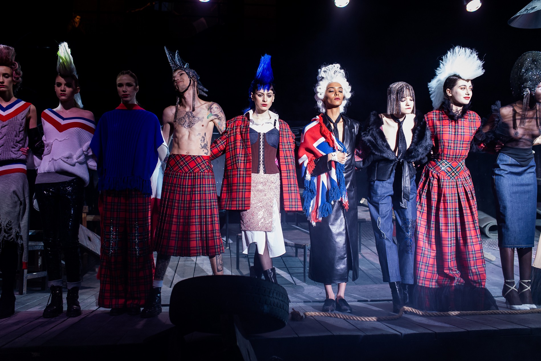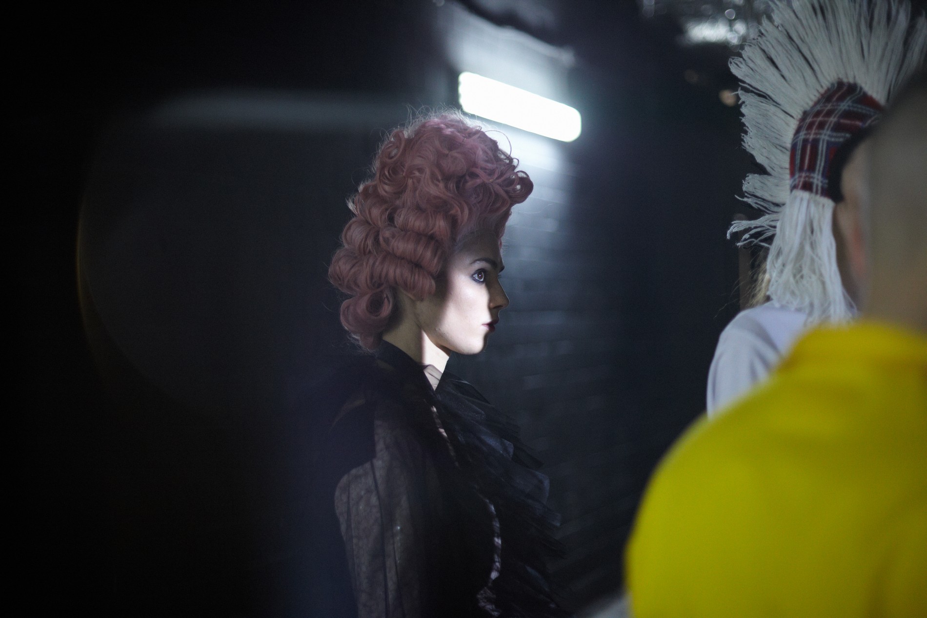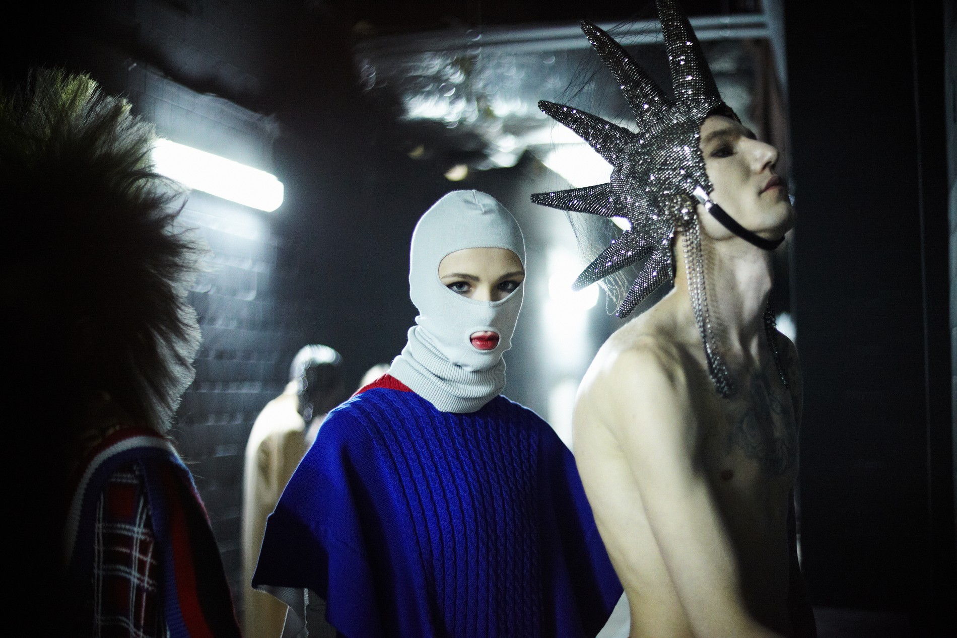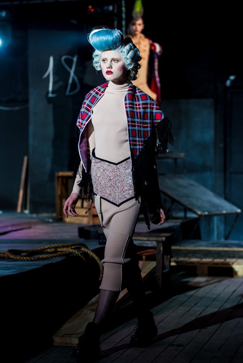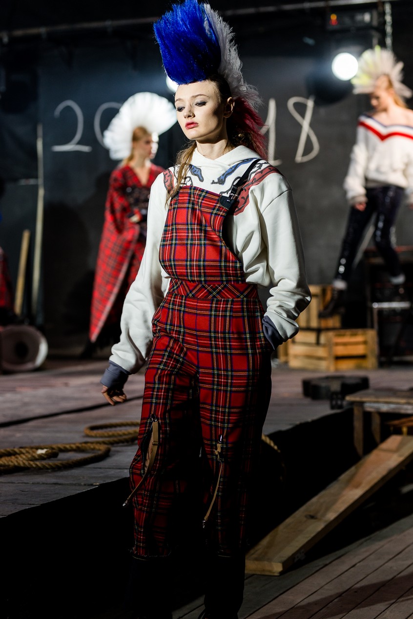 Идеи дизайнера Ивана Фролова всегда подкупают своей многоуровневостью и сложностью. Судите сами: взяв за основу коллекции британский панк, Иван развивает тему свободомыслия и свободного духа, возвращается в викторианскую эпоху с ее порой легкомысленными нравами и добавляет и эту историю в общий котел референсов. Дальше мысль дизайнера движется в сторону интрижек горничных из этой исторической эпохи: он представляет себе их ночные побеги и скоропалительные романы в садовых лабиринтах и вдохновляется и самой концепцией лабиринта с его бесконечными запутанными ходами. Это отправляет Фролова в Древнюю Грецию, где лабиринты были и архитектурными формами, и деталью росписей, и важной частью мифотворчества, – и там дизайнер обнаруживает театр. Именно поэтому шоу прошло на Сцене 6 в центре Довженко – это оплот современного панковского театра, что завершает этот цикл референсов. Простите за долгое предисловие, но такой полет мысли и правда впечатляет.