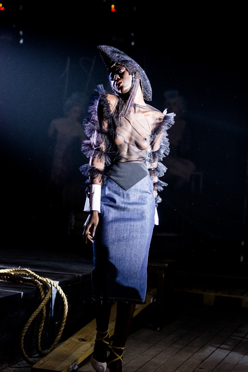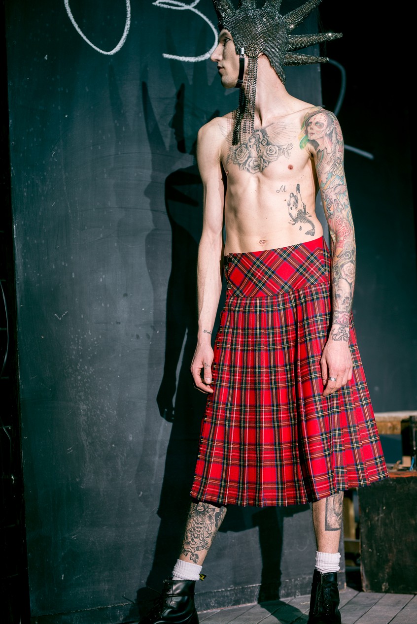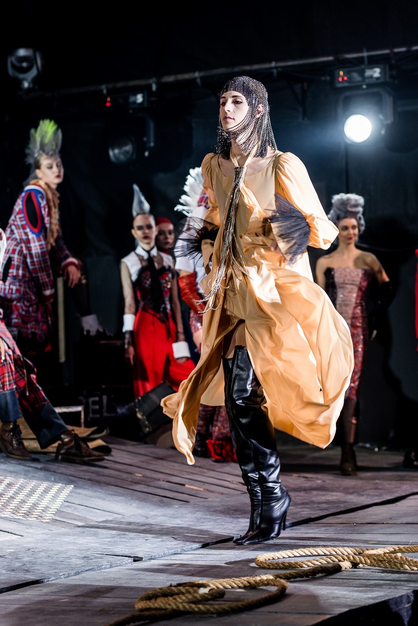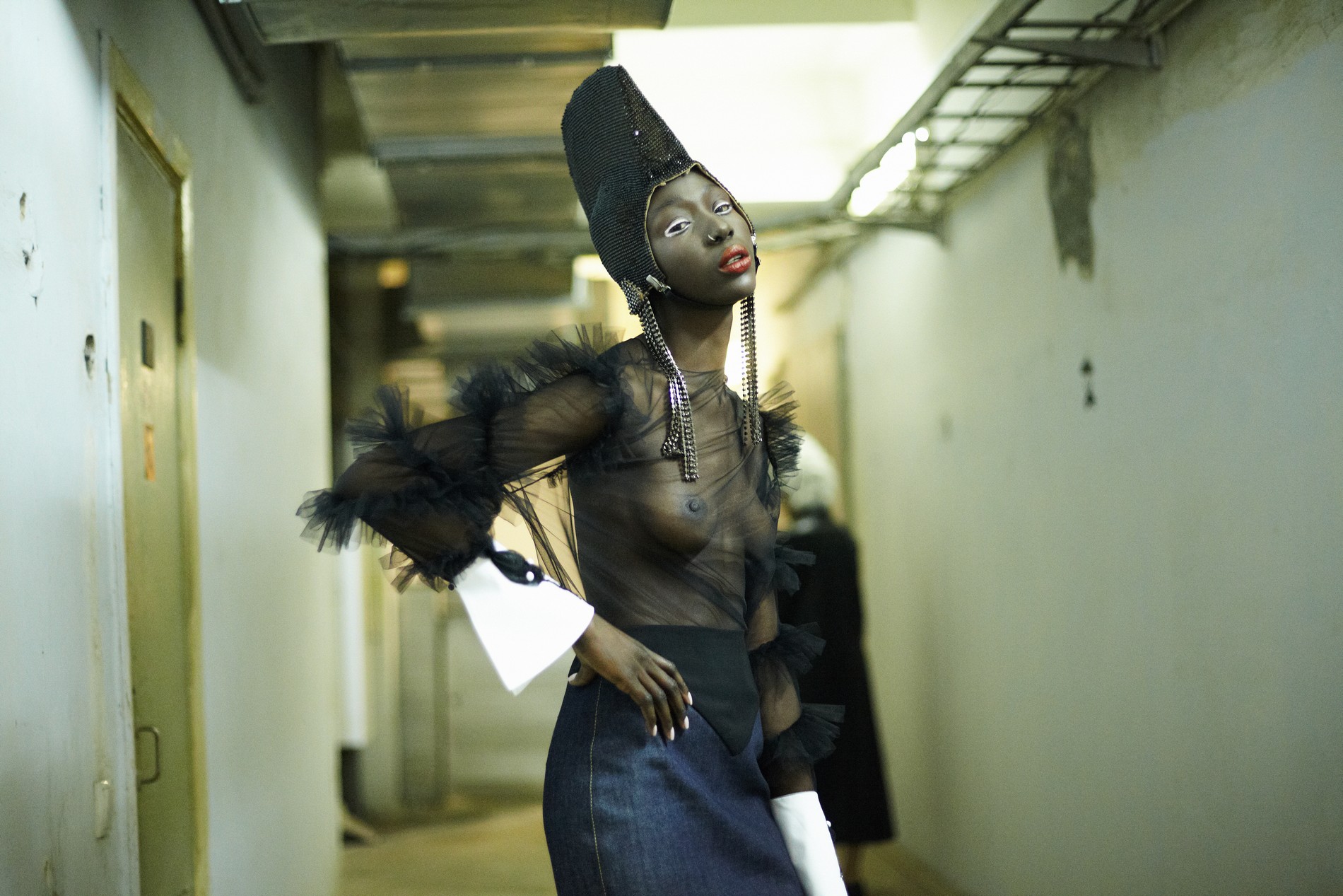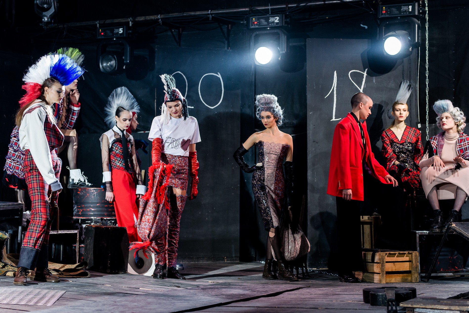 Идеи дизайнера Ивана Фролова всегда подкупают своей многоуровневостью и сложностью. Судите сами: взяв за основу коллекции британский панк, Иван развивает тему свободомыслия и свободного духа, возвращается в викторианскую эпоху с ее порой легкомысленными нравами и добавляет и эту историю в общий котел референсов. Дальше мысль дизайнера движется в сторону интрижек горничных из этой исторической эпохи: он представляет себе их ночные побеги и скоропалительные романы в садовых лабиринтах и вдохновляется и самой концепцией лабиринта с его бесконечными запутанными ходами. Это отправляет Фролова в Древнюю Грецию, где лабиринты были и архитектурными формами, и деталью росписей, и важной частью мифотворчества, – и там дизайнер обнаруживает театр. Именно поэтому шоу прошло на Сцене 6 в центре Довженко – это оплот современного панковского театра, что завершает этот цикл референсов. Простите за долгое предисловие, но такой полет мысли и правда впечатляет.