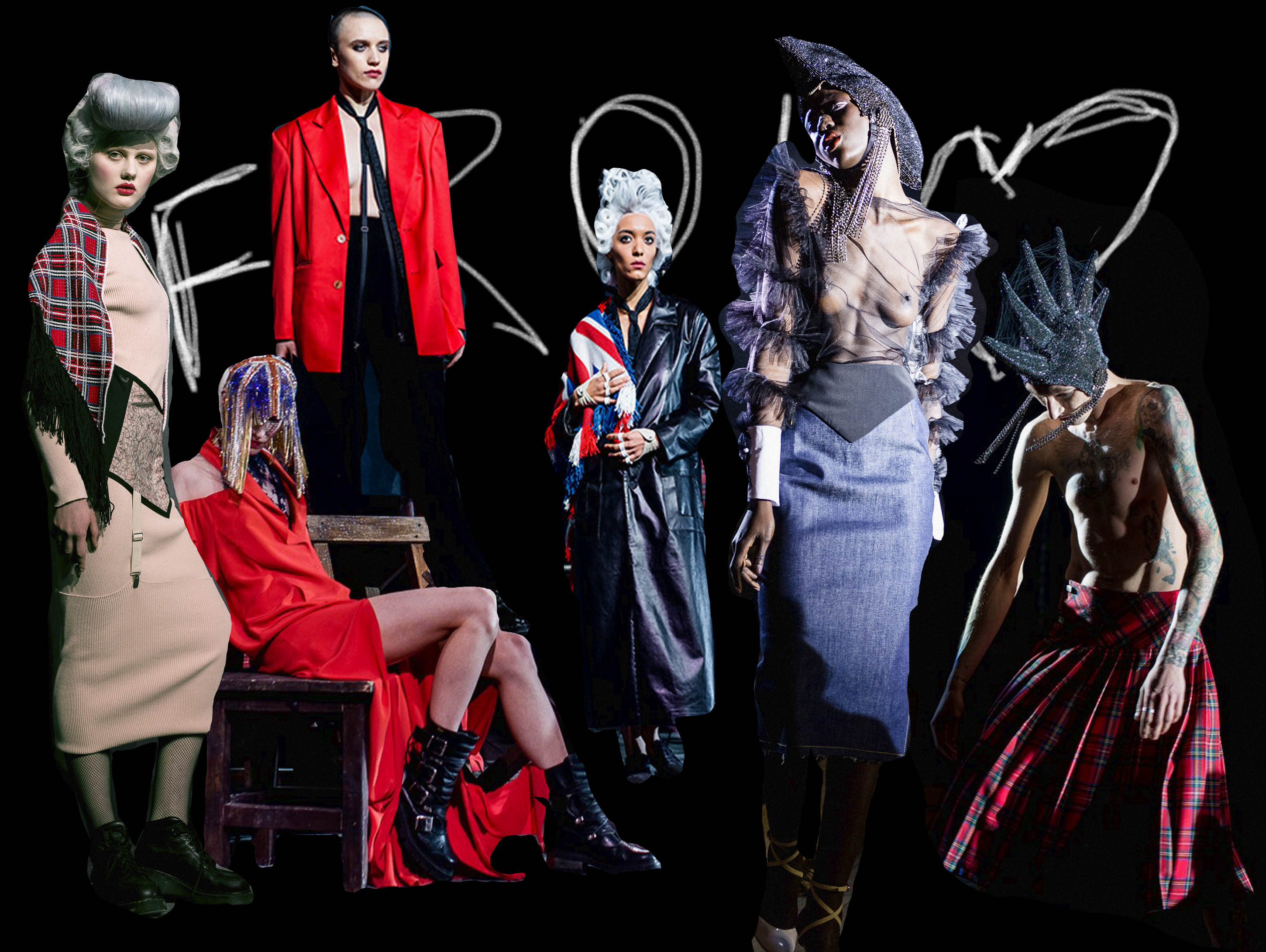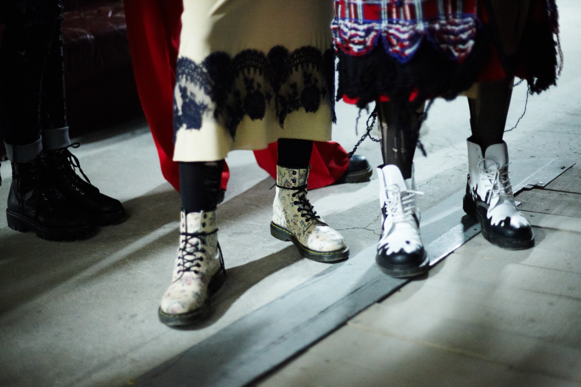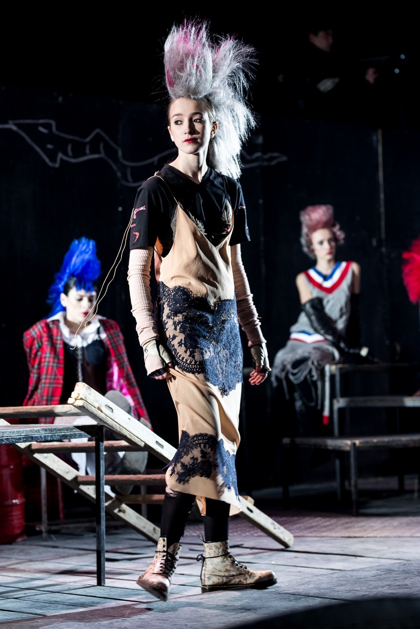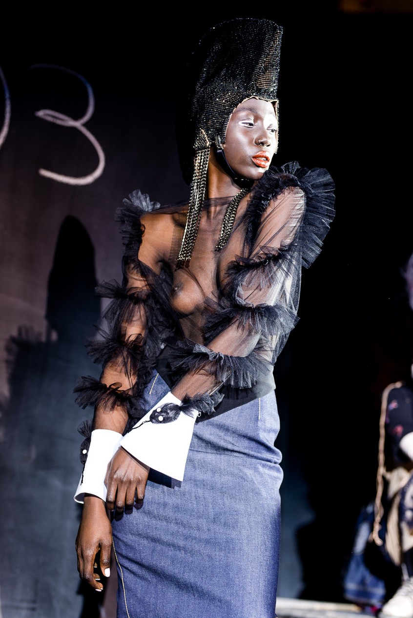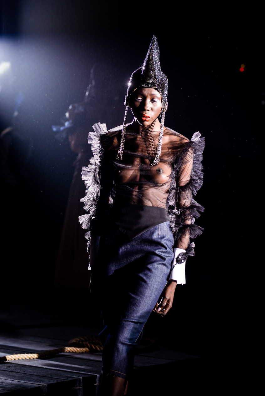 Идеи дизайнера Ивана Фролова всегда подкупают своей многоуровневостью и сложностью. Судите сами: взяв за основу коллекции британский панк, Иван развивает тему свободомыслия и свободного духа, возвращается в викторианскую эпоху с ее порой легкомысленными нравами и добавляет и эту историю в общий котел референсов. Дальше мысль дизайнера движется в сторону интрижек горничных из этой исторической эпохи: он представляет себе их ночные побеги и скоропалительные романы в садовых лабиринтах и вдохновляется и самой концепцией лабиринта с его бесконечными запутанными ходами. Это отправляет Фролова в Древнюю Грецию, где лабиринты были и архитектурными формами, и деталью росписей, и важной частью мифотворчества, – и там дизайнер обнаруживает театр. Именно поэтому шоу прошло на Сцене 6 в центре Довженко – это оплот современного панковского театра, что завершает этот цикл референсов. Простите за долгое предисловие, но такой полет мысли и правда впечатляет.
