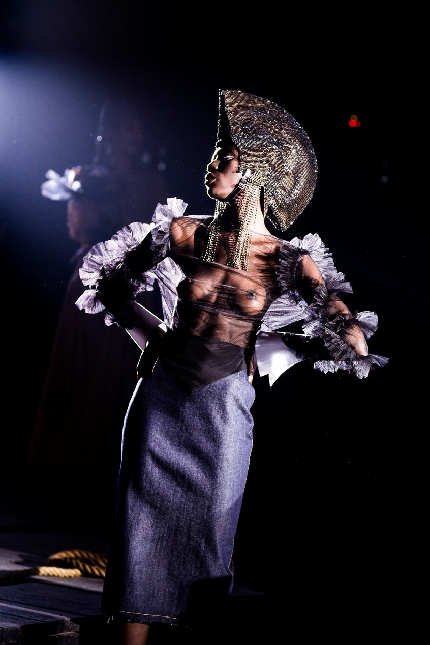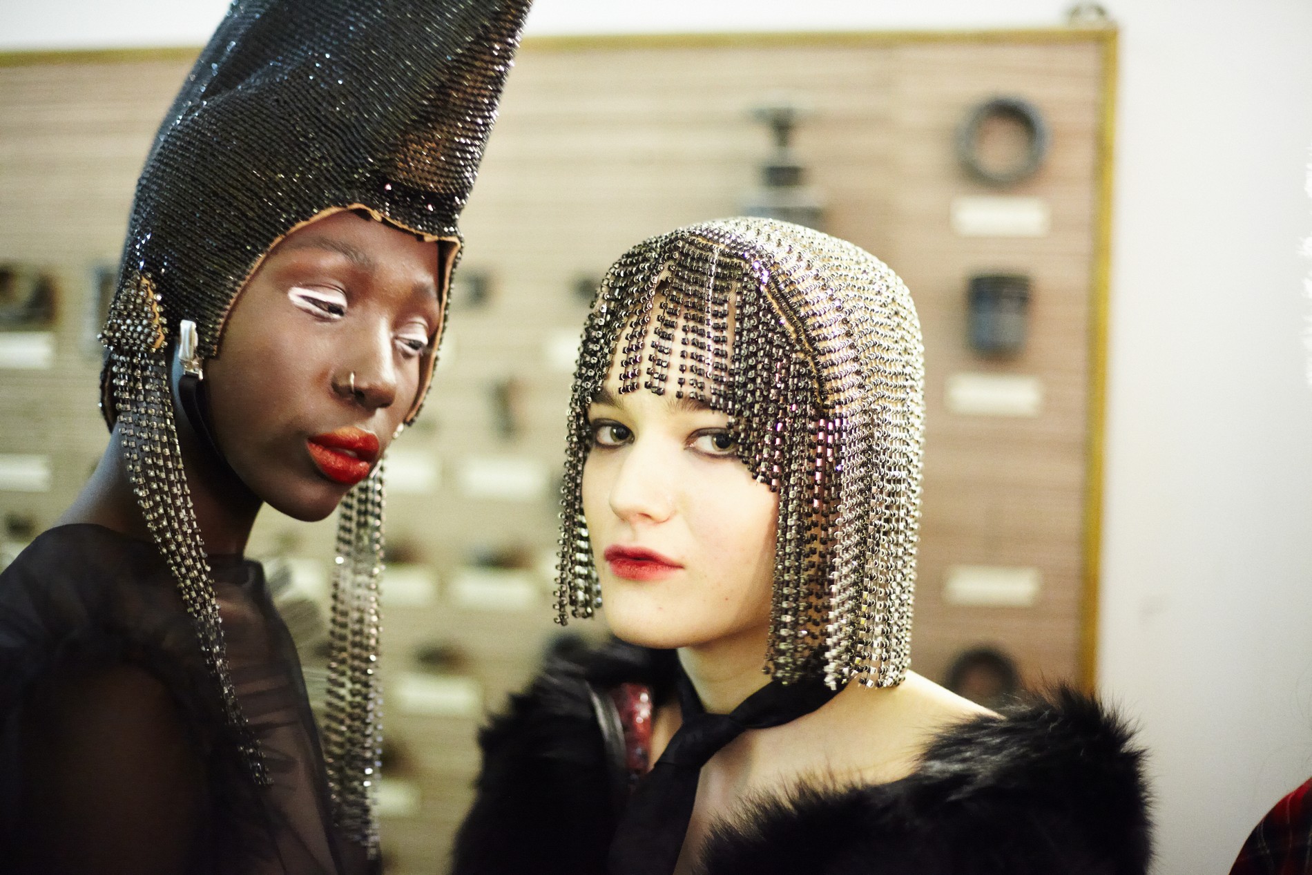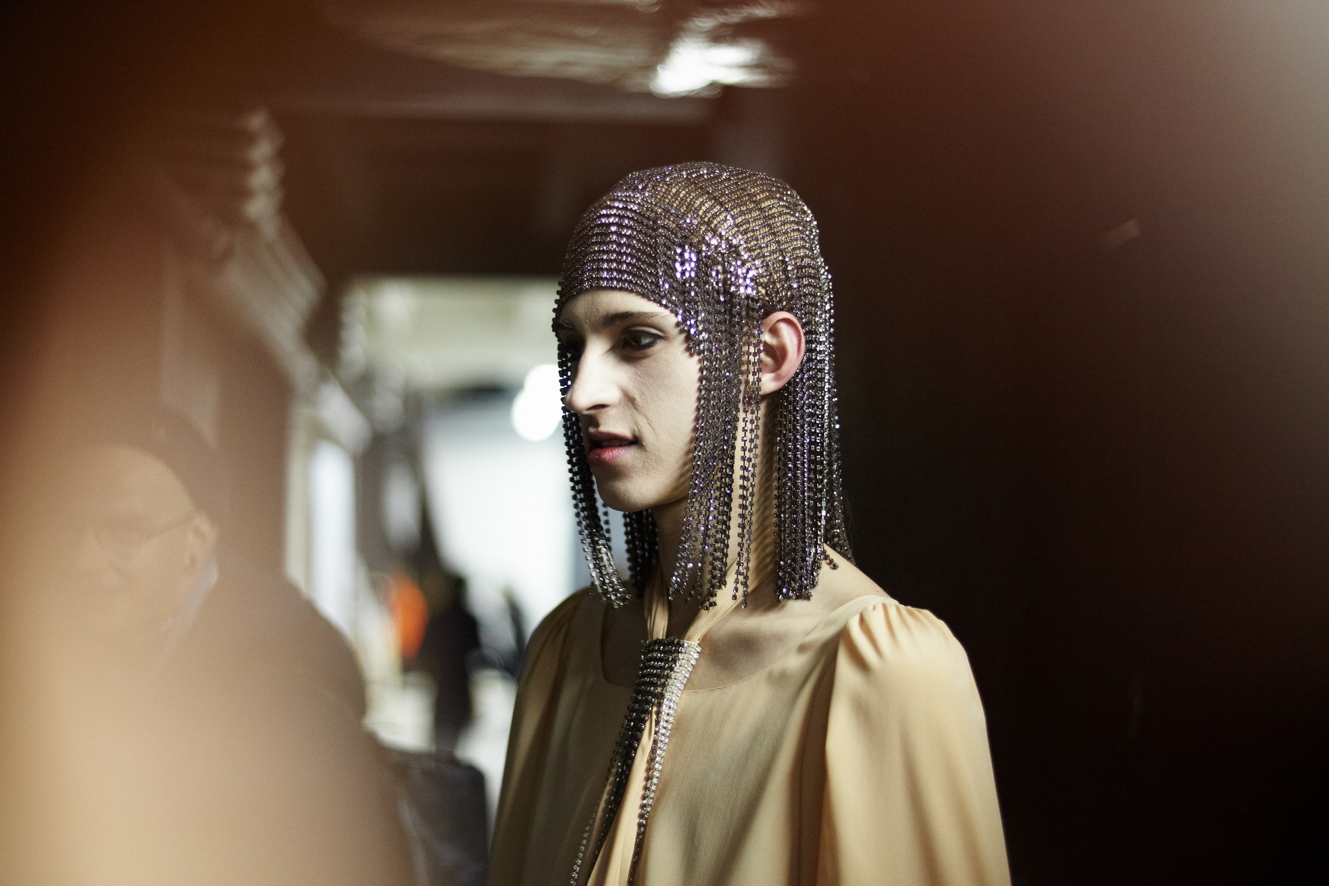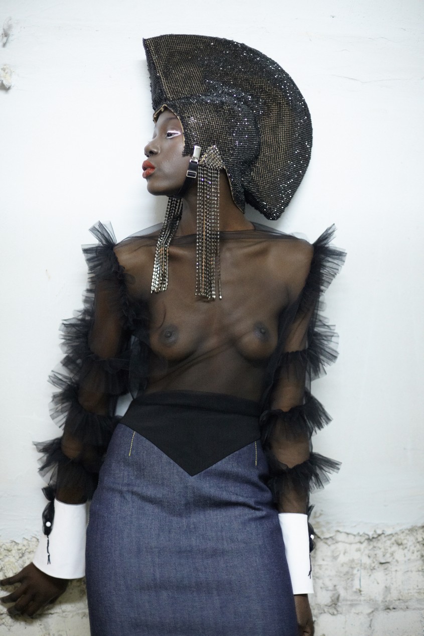 Идеи дизайнера Ивана Фролова всегда подкупают своей многоуровневостью и сложностью. Судите сами: взяв за основу коллекции британский панк, Иван развивает тему свободомыслия и свободного духа, возвращается в викторианскую эпоху с ее порой легкомысленными нравами и добавляет и эту историю в общий котел референсов. Дальше мысль дизайнера движется в сторону интрижек горничных из этой исторической эпохи: он представляет себе их ночные побеги и скоропалительные романы в садовых лабиринтах и вдохновляется и самой концепцией лабиринта с его бесконечными запутанными ходами. Это отправляет Фролова в Древнюю Грецию, где лабиринты были и архитектурными формами, и деталью росписей, и важной частью мифотворчества, – и там дизайнер обнаруживает театр. Именно поэтому шоу прошло на Сцене 6 в центре Довженко – это оплот современного панковского театра, что завершает этот цикл референсов. Простите за долгое предисловие, но такой полет мысли и правда впечатляет.