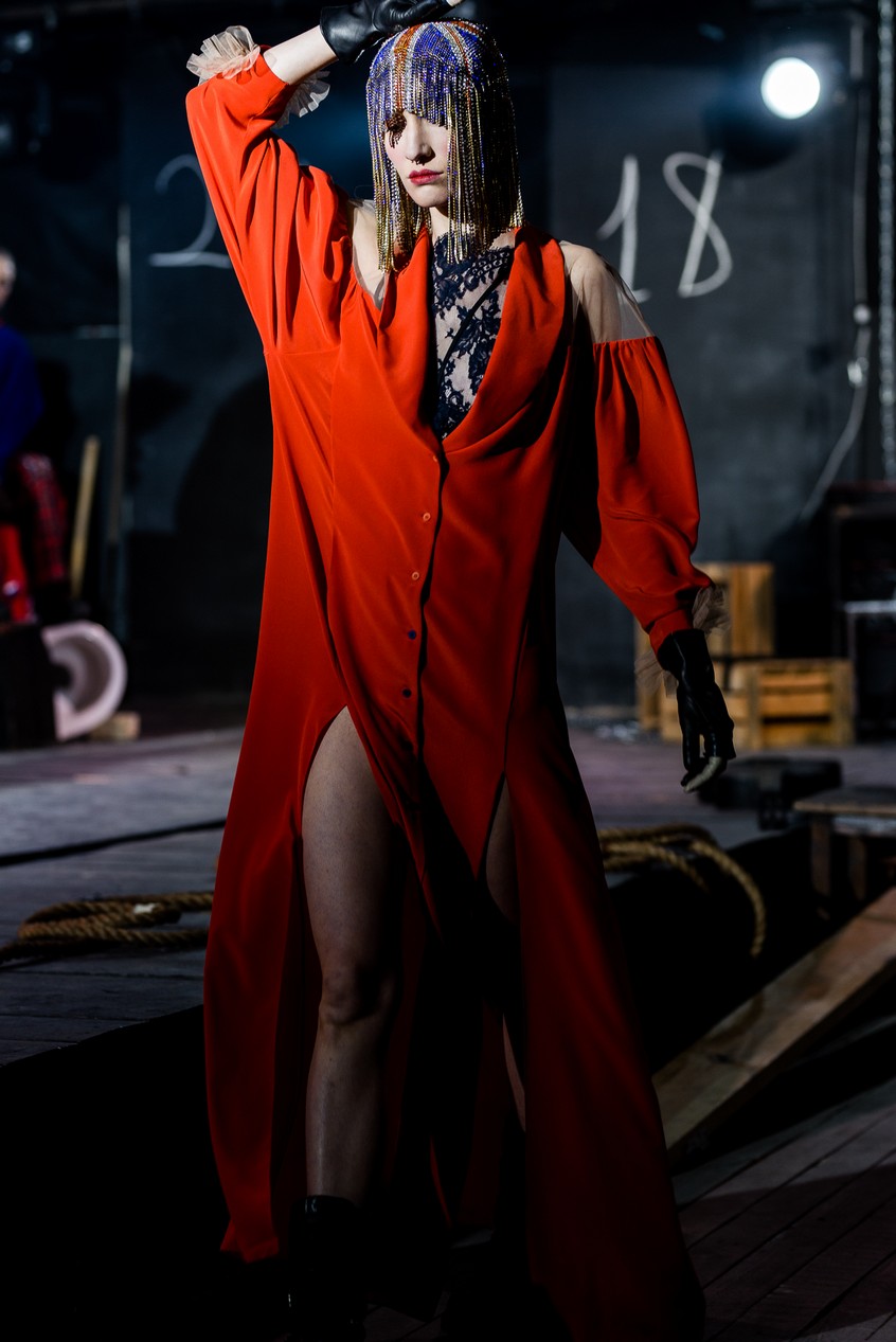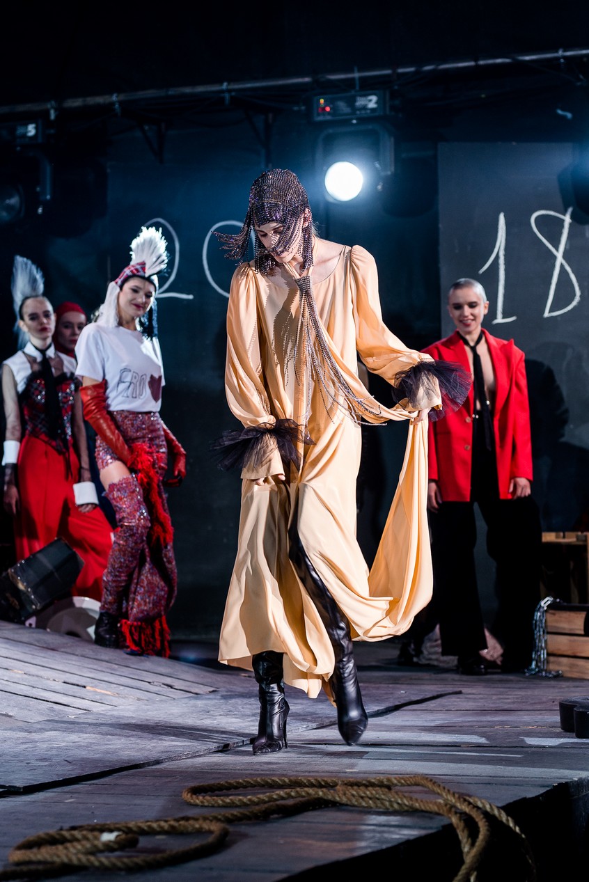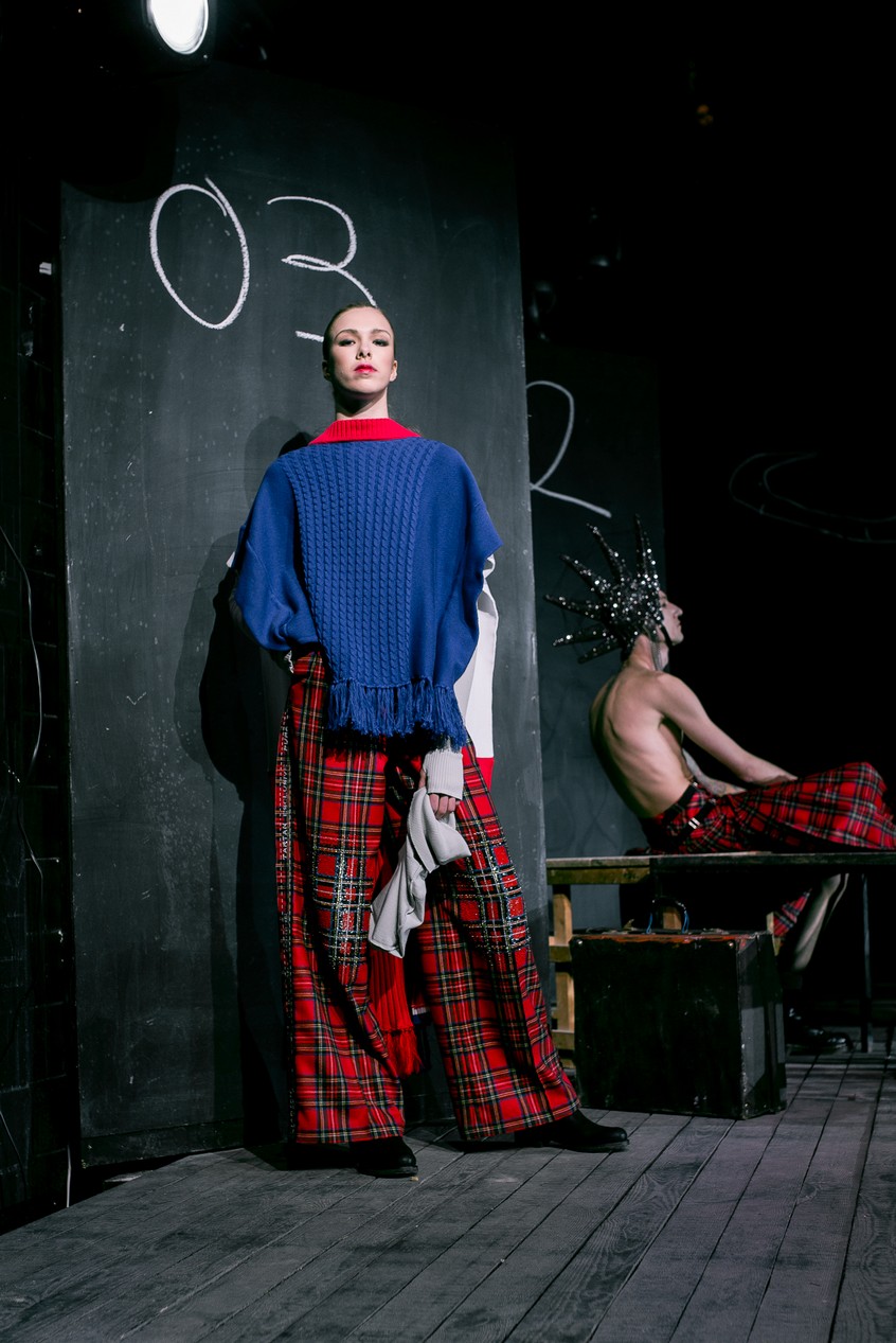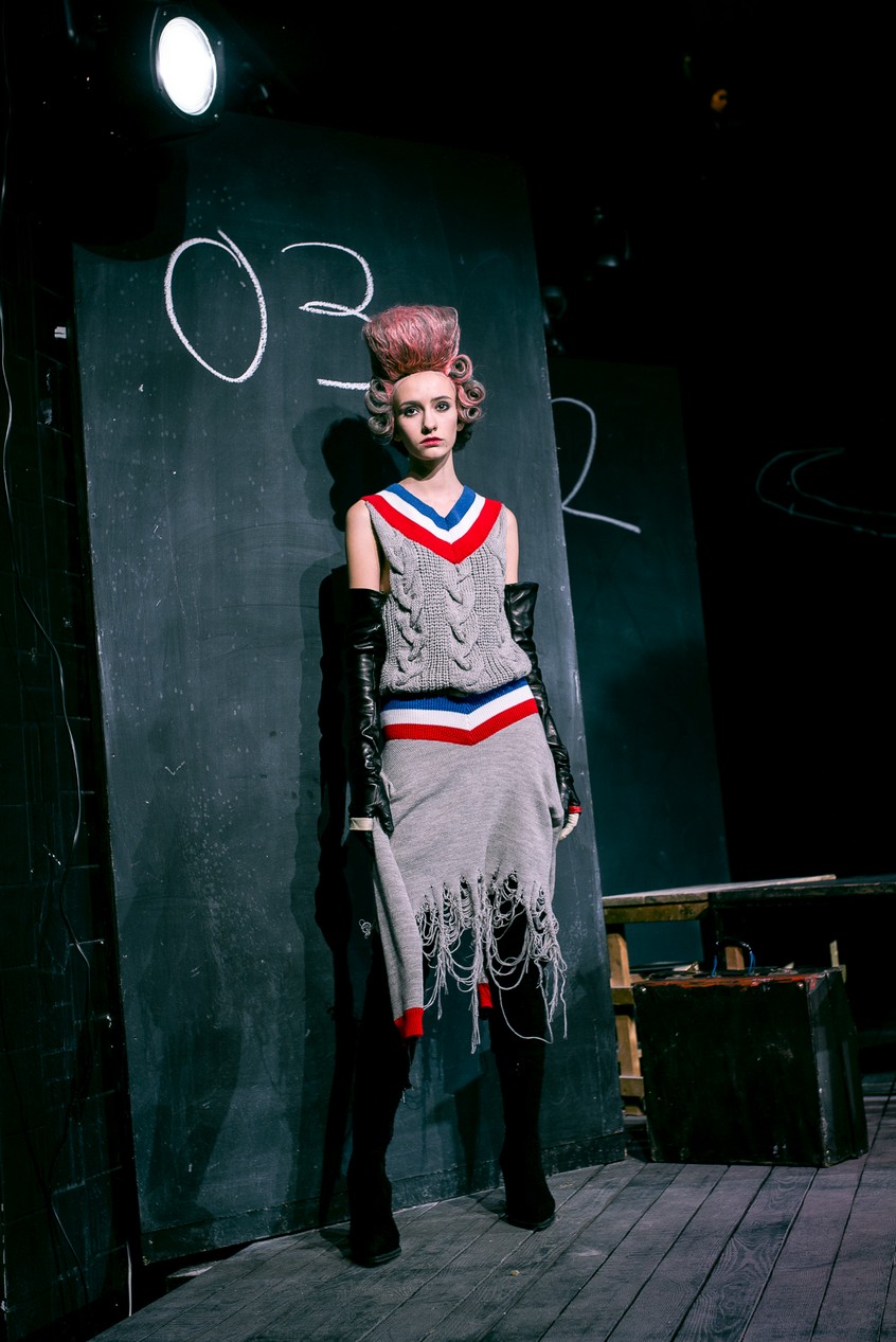 Итак, Фролов собрал гостей в небольшом помещении в Центре Довженко, где обычно проходят театральные представления. Впрочем, и само шоу прошло в этом же формате: отказавшись от привычного дефиле, дизайнер выпускает своих моделей на подмостки и просит их играть, устраивать перформанс и демонстрировать его одежду в действии.