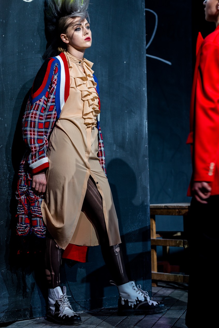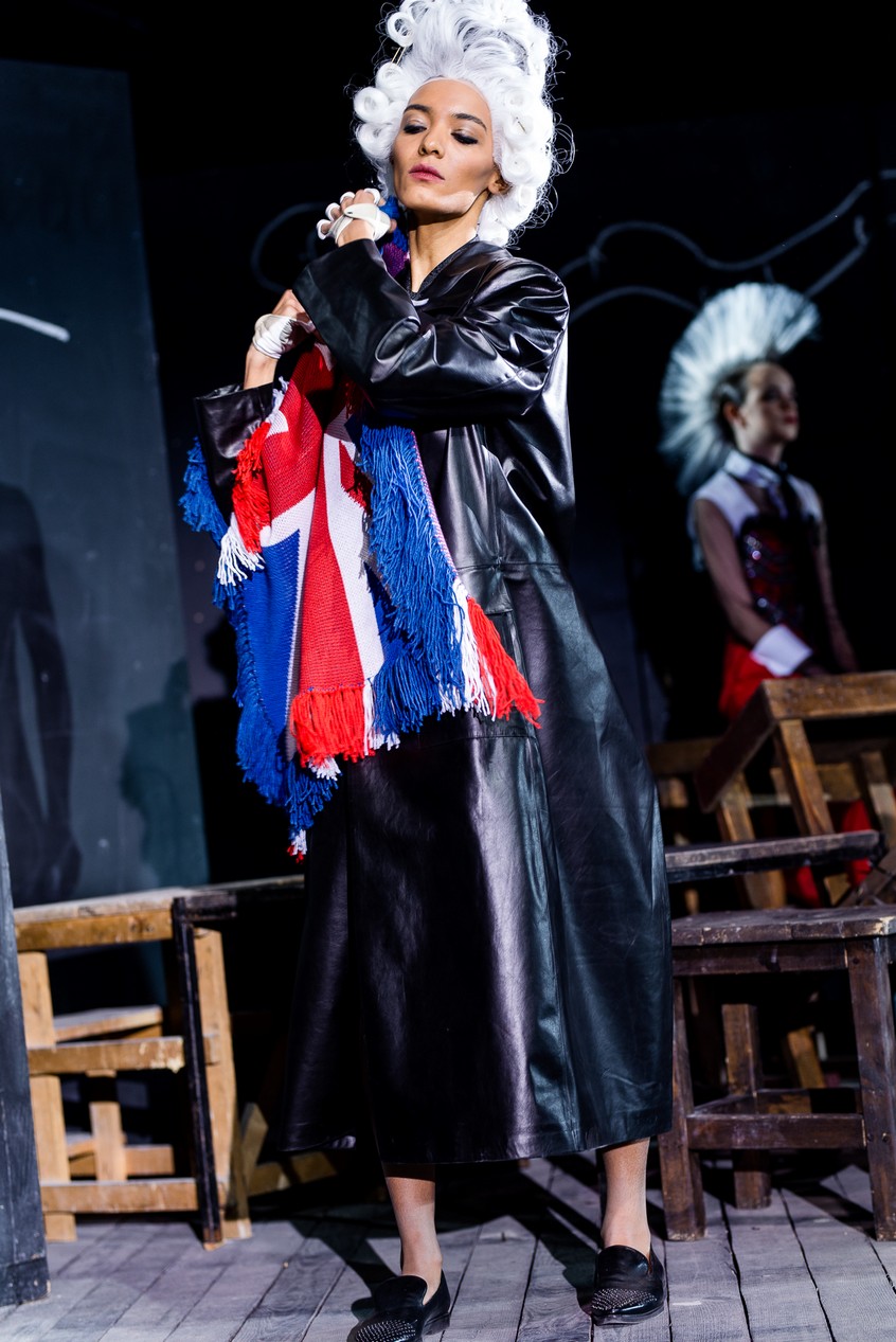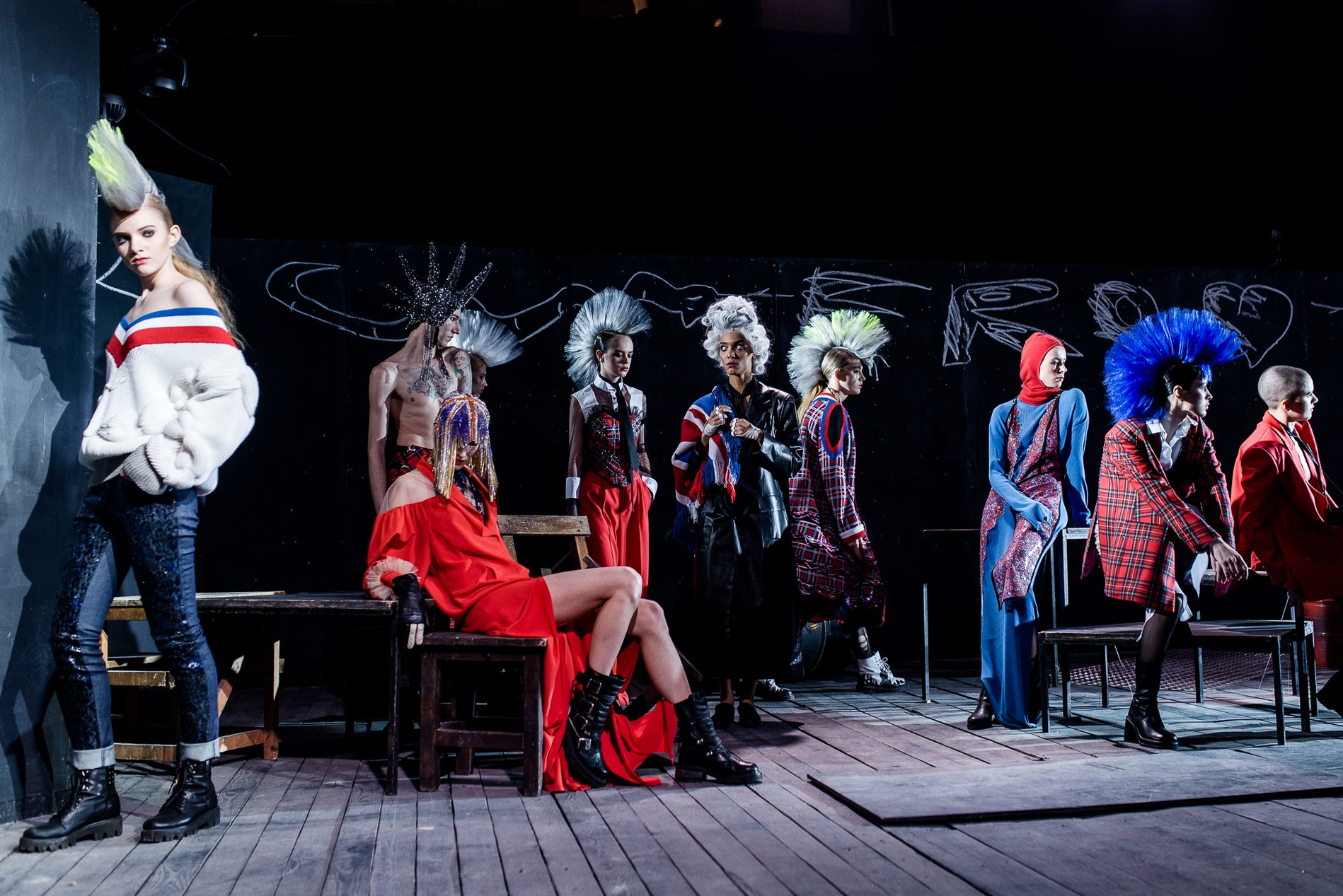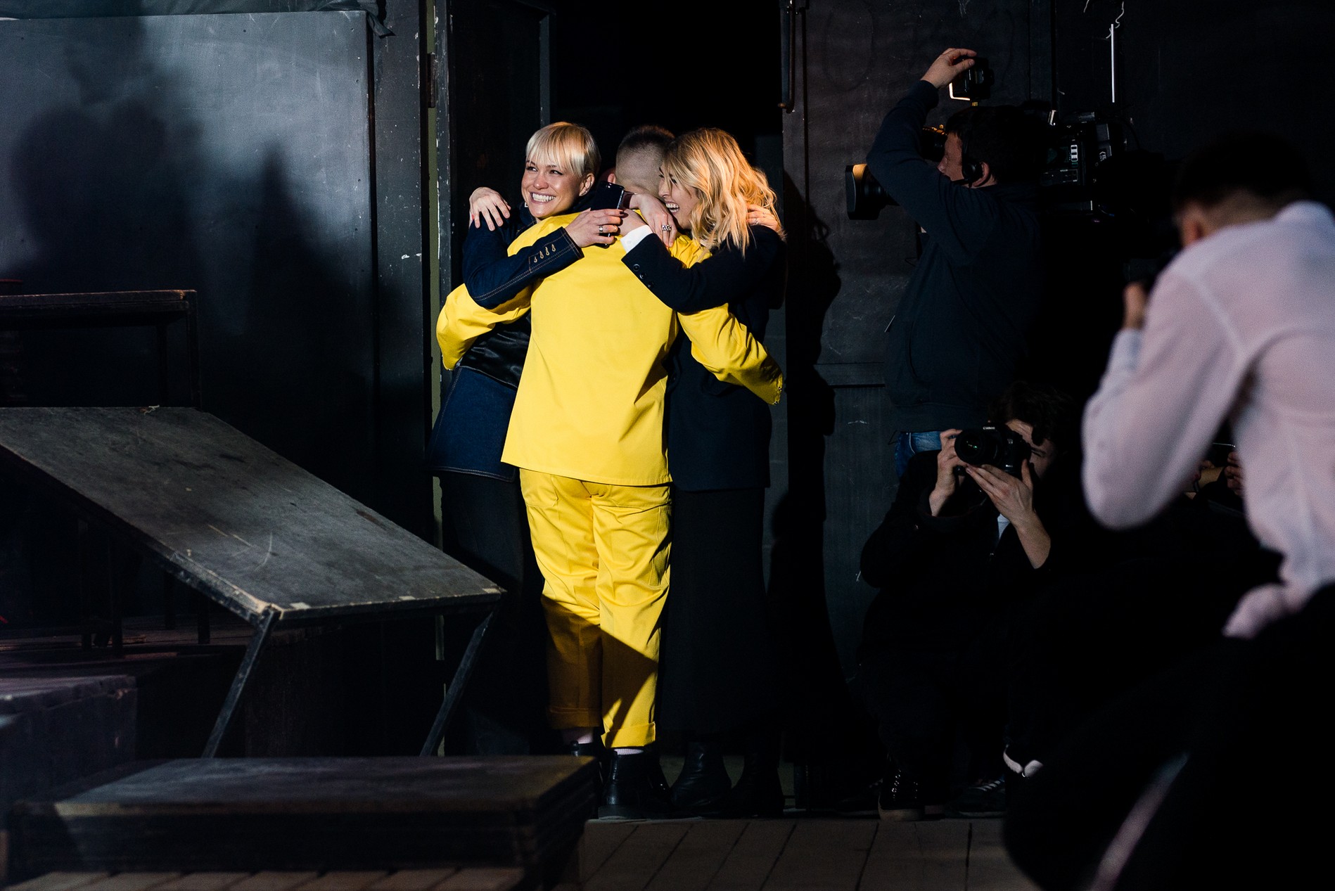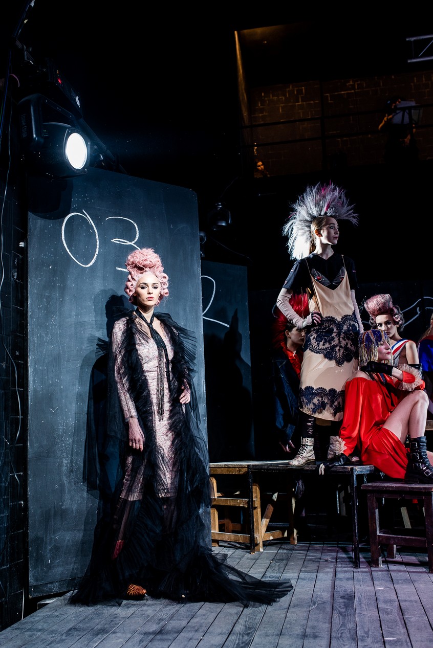Итак, Фролов собрал гостей в небольшом помещении в Центре Довженко, где обычно проходят театральные представления. Впрочем, и само шоу прошло в этом же формате: отказавшись от привычного дефиле, дизайнер выпускает своих моделей на подмостки и просит их играть, устраивать перформанс и демонстрировать его одежду в действии.