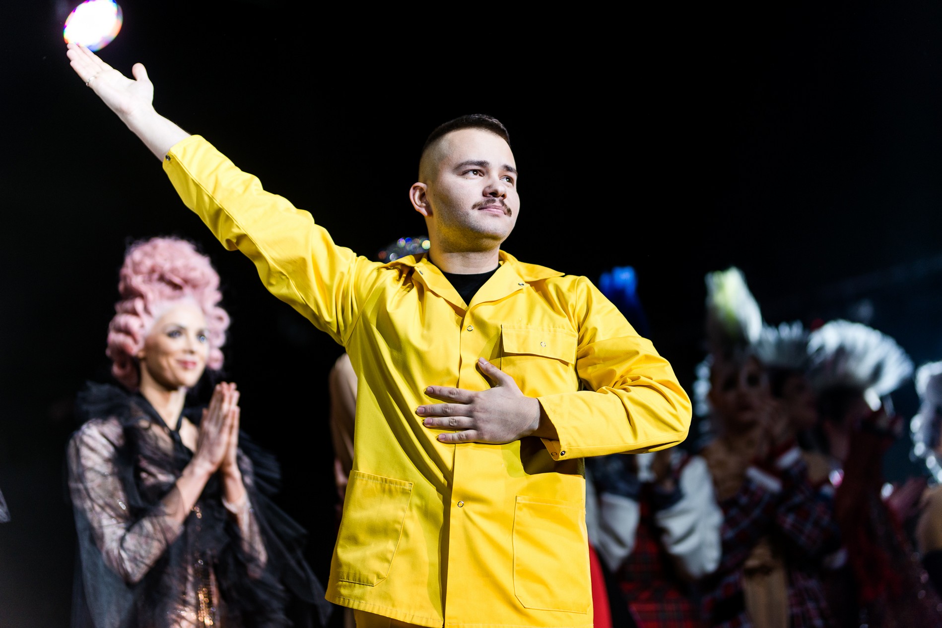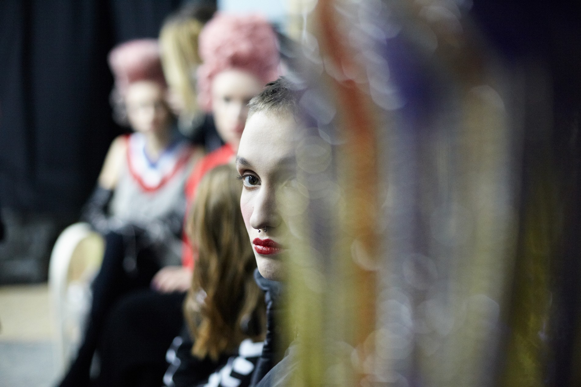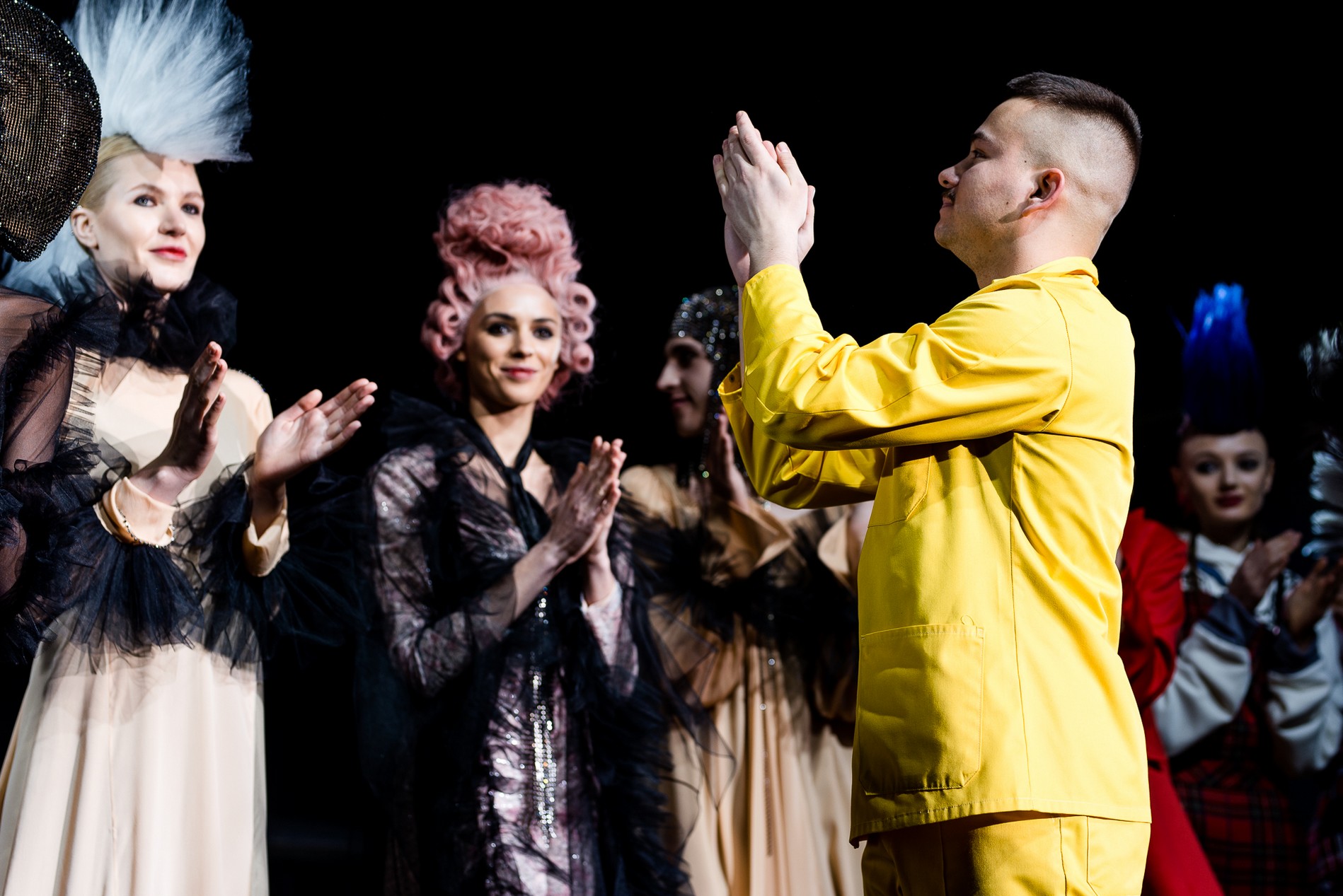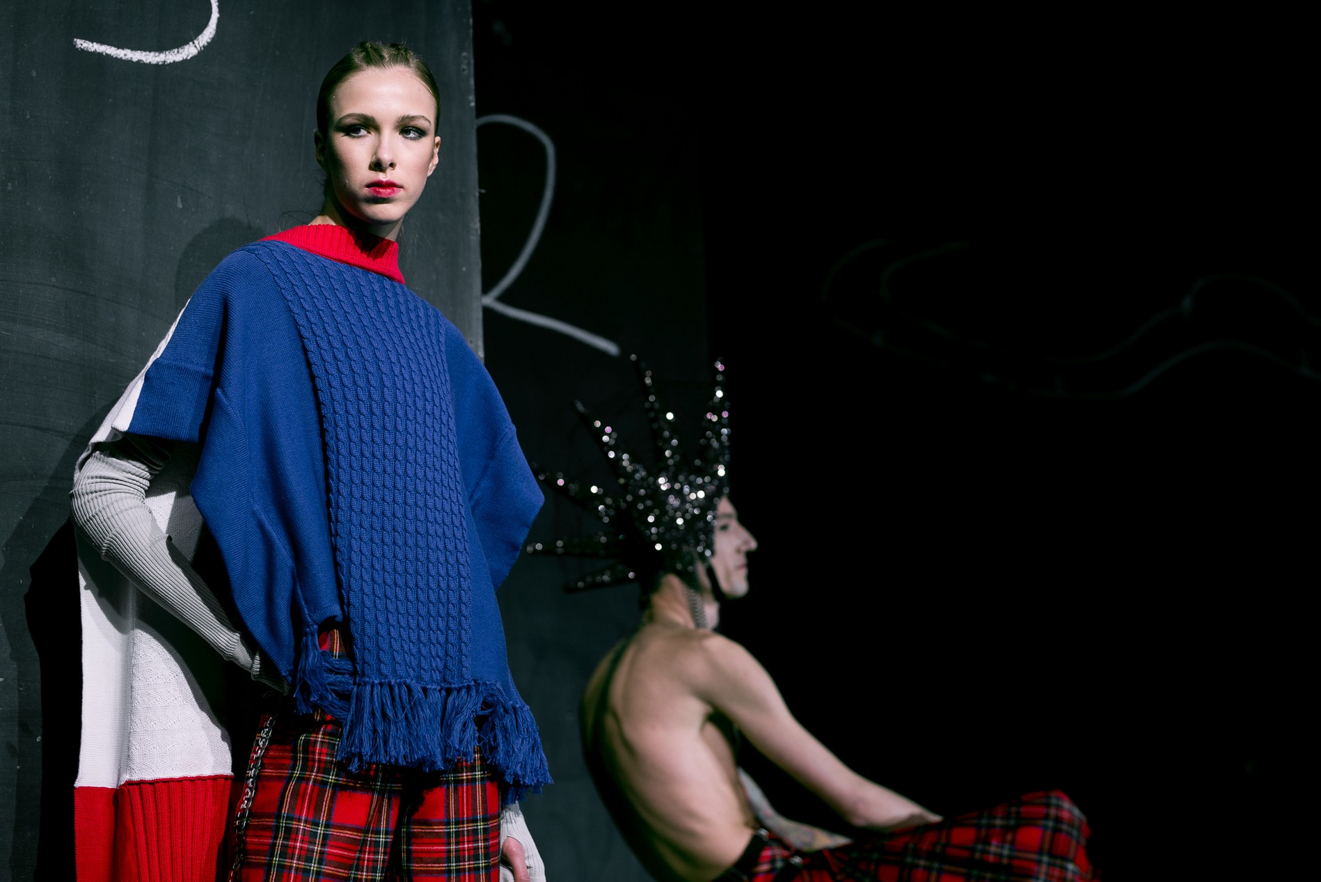 Итак, Фролов собрал гостей в небольшом помещении в Центре Довженко, где обычно проходят театральные представления. Впрочем, и само шоу прошло в этом же формате: отказавшись от привычного дефиле, дизайнер выпускает своих моделей на подмостки и просит их играть, устраивать перформанс и демонстрировать его одежду в действии.