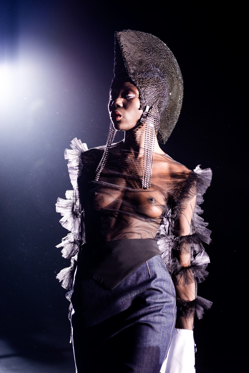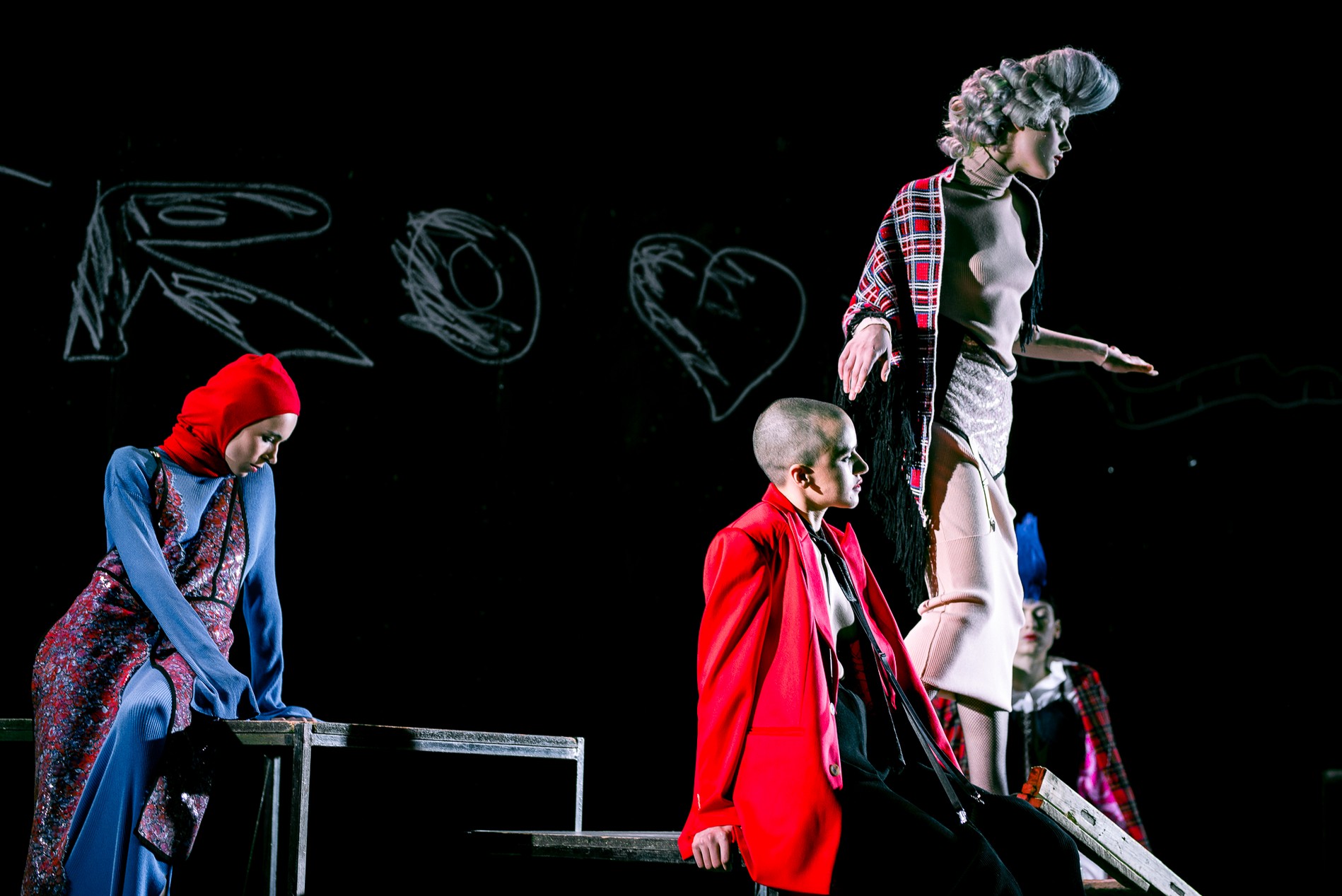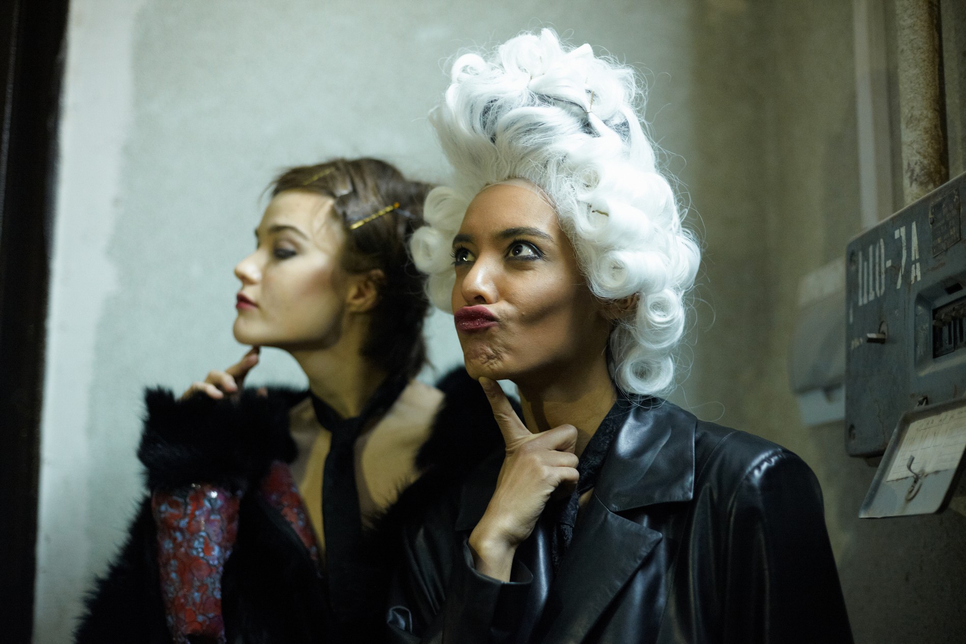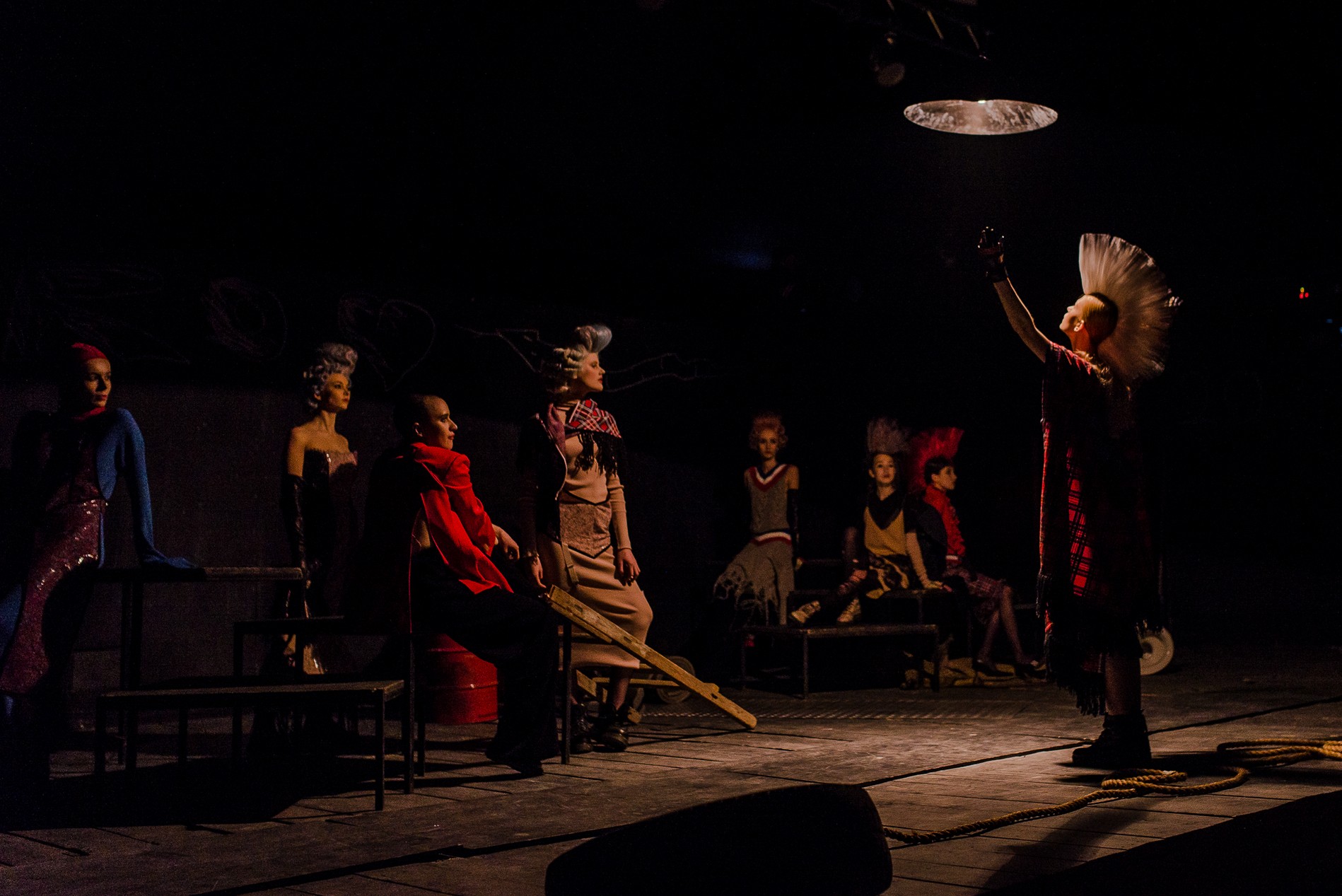 Итак, Фролов собрал гостей в небольшом помещении в Центре Довженко, где обычно проходят театральные представления. Впрочем, и само шоу прошло в этом же формате: отказавшись от привычного дефиле, дизайнер выпускает своих моделей на подмостки и просит их играть, устраивать перформанс и демонстрировать его одежду в действии.