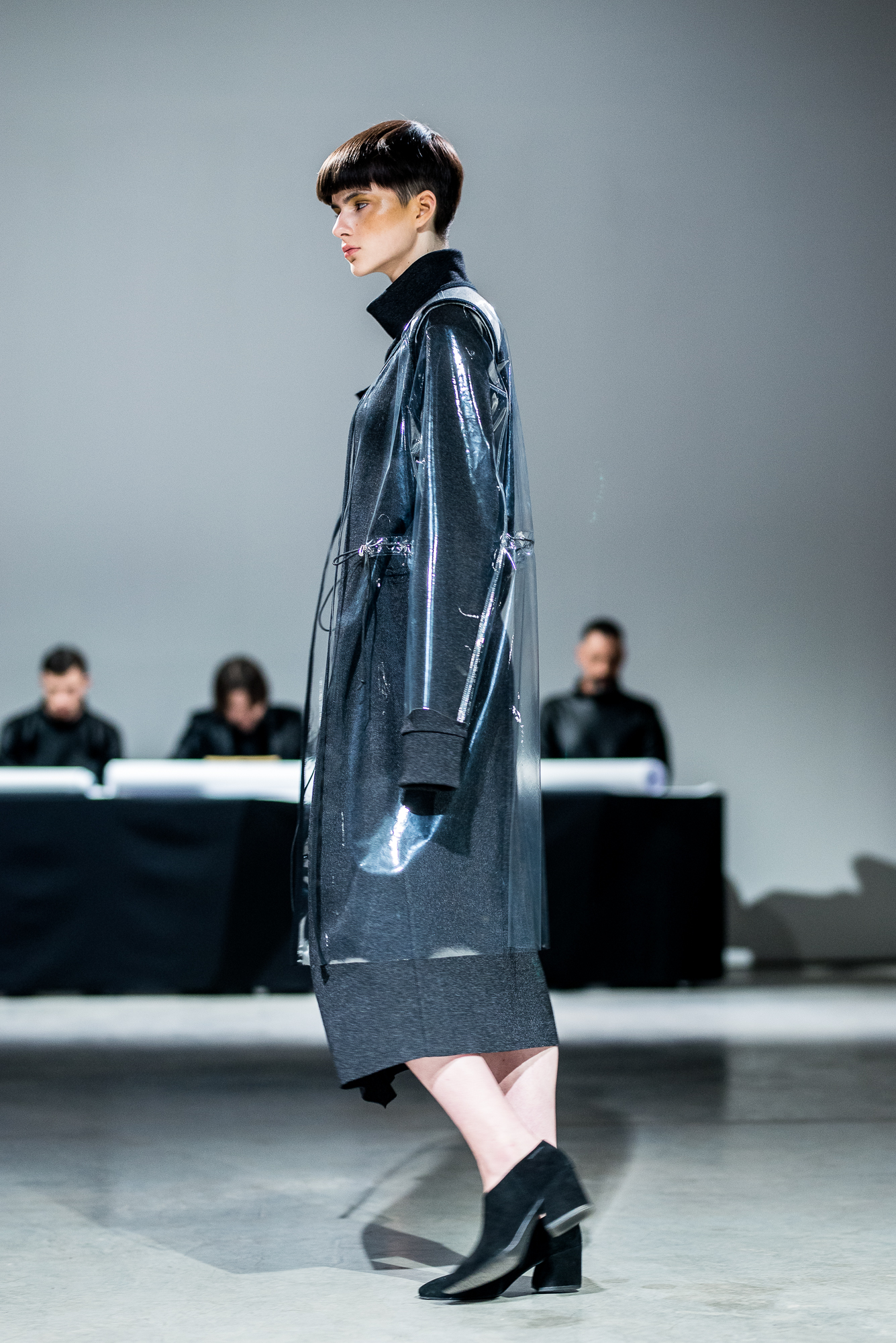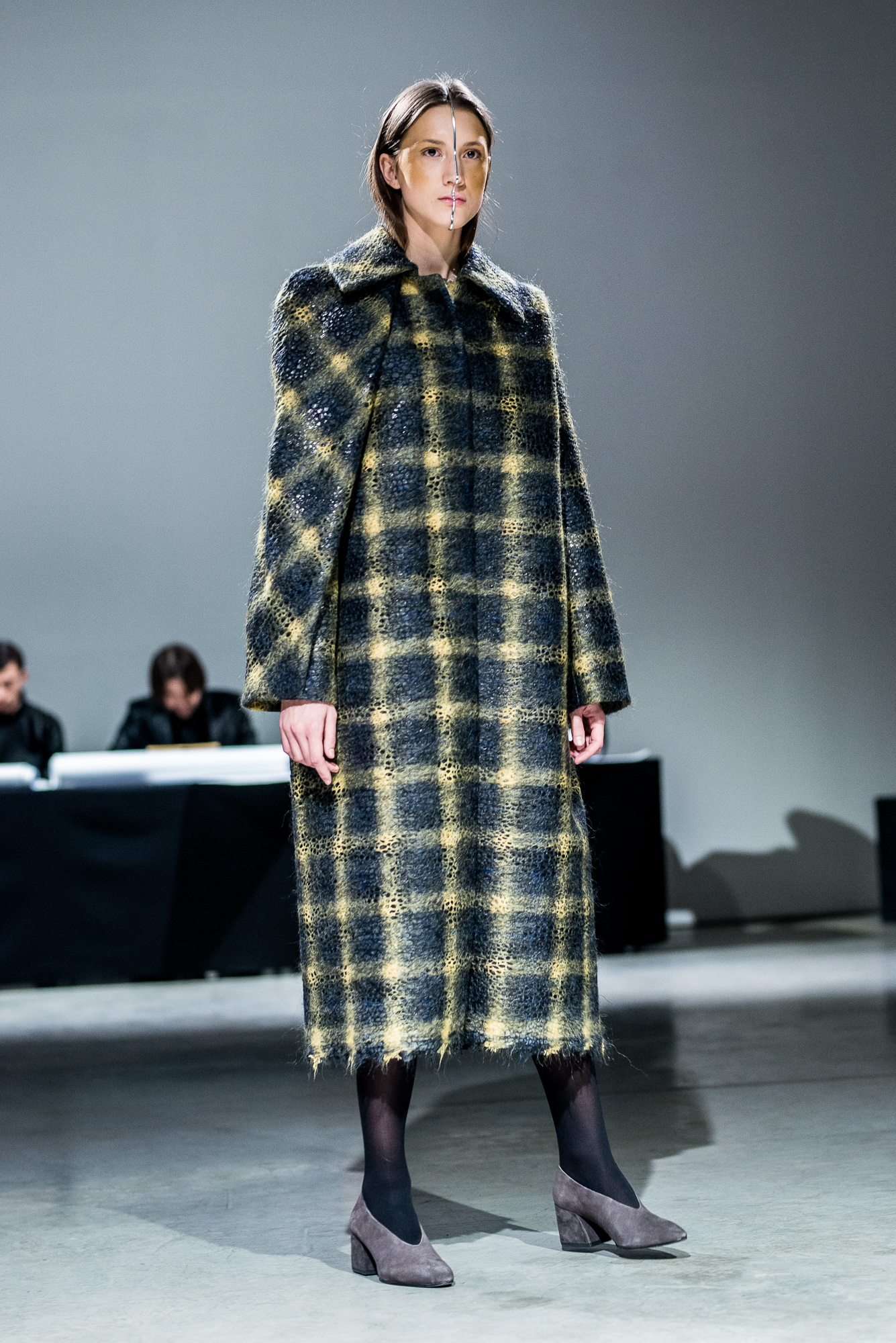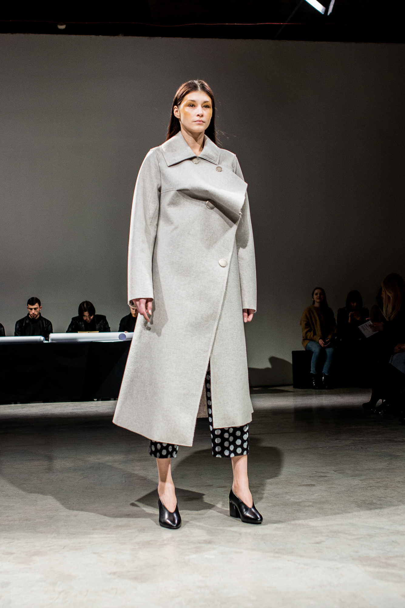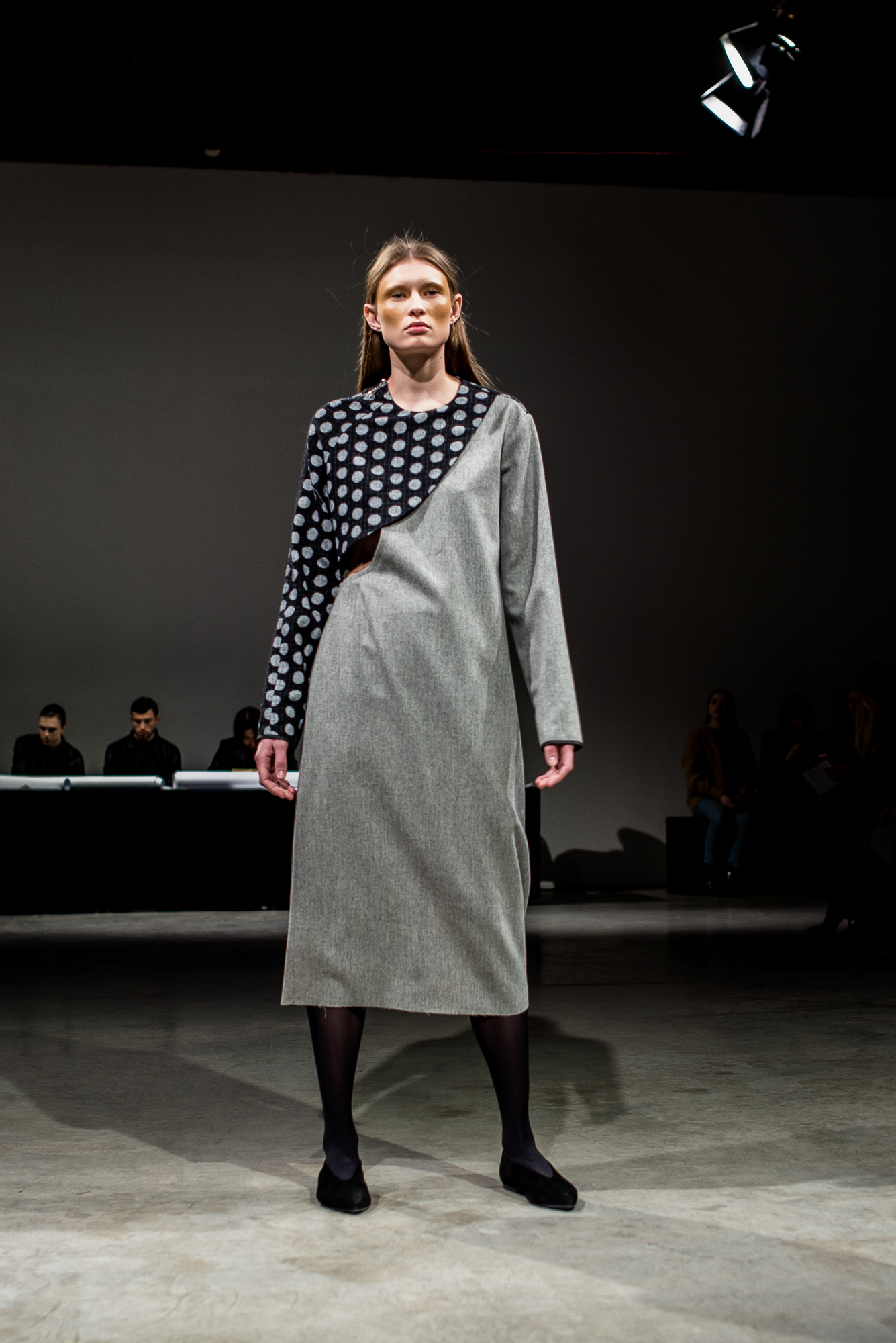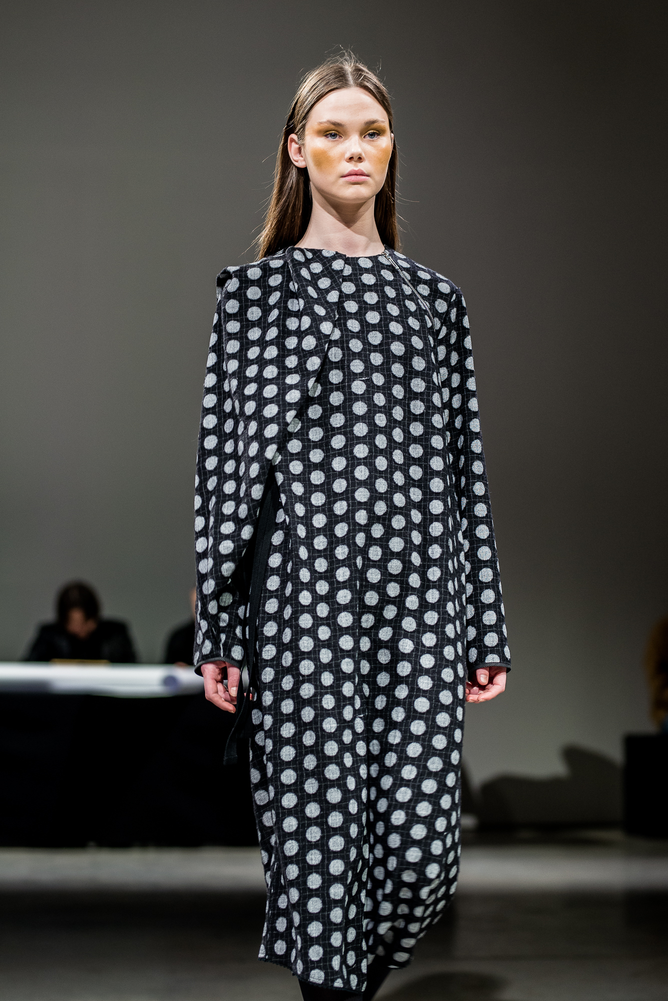 Главная роль в показе была отведена пальто – это сильная сторона Пржонской, и они действительно подкупали сочетанием утилитарности и красоты. Ткань, из которой пошиты пальто, ламинирована и водонепроницаема: что, очевидно, одновременно и практично, и красиво, потому что придавало ей блеск и мерцание, соответствующее теме футуризма. Коллекция Пржонской очень последовательна: дизайнер ничего не бросала на полпути, развивая единожды выбранное направление до конца. Так, взяв за основу косой крой рукава, Елена применяет его сразу в нескольких силуэтах: и в пальто, и в платьях, и в рубашках. Использовав горох в нескольких луках, дизайнер периодически добавляет его в качестве деталей и в других выходах – равно как не оставляет она тему с присобранным горлом и не изменяет длине миди.