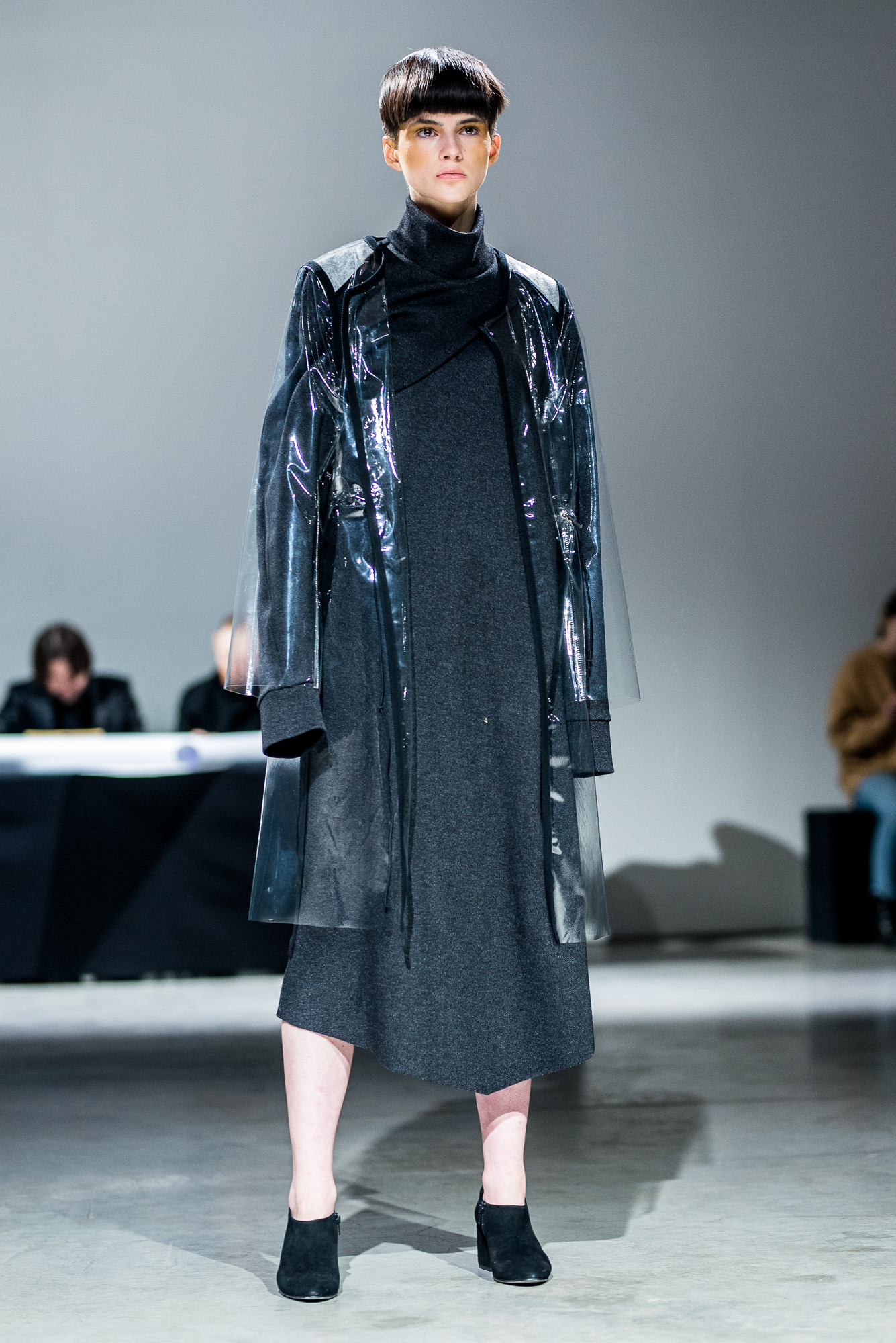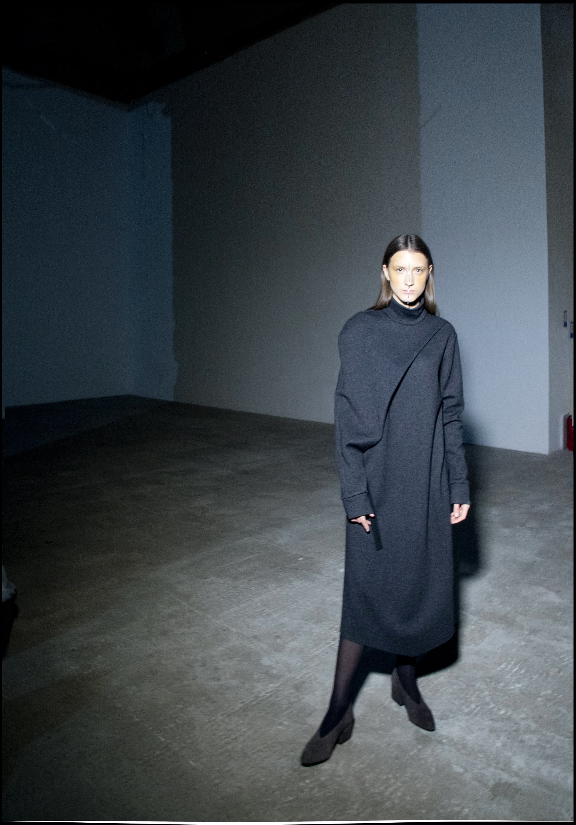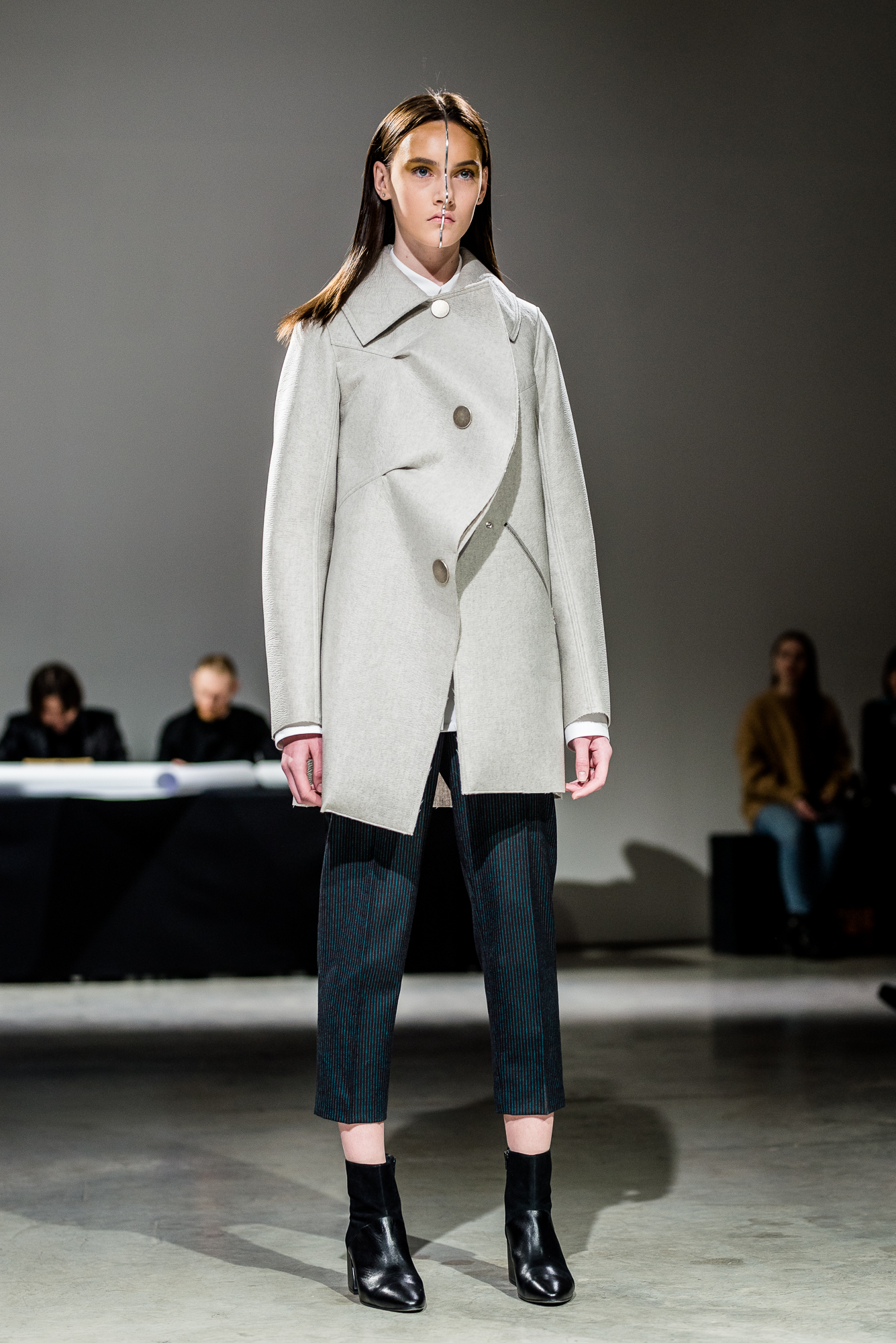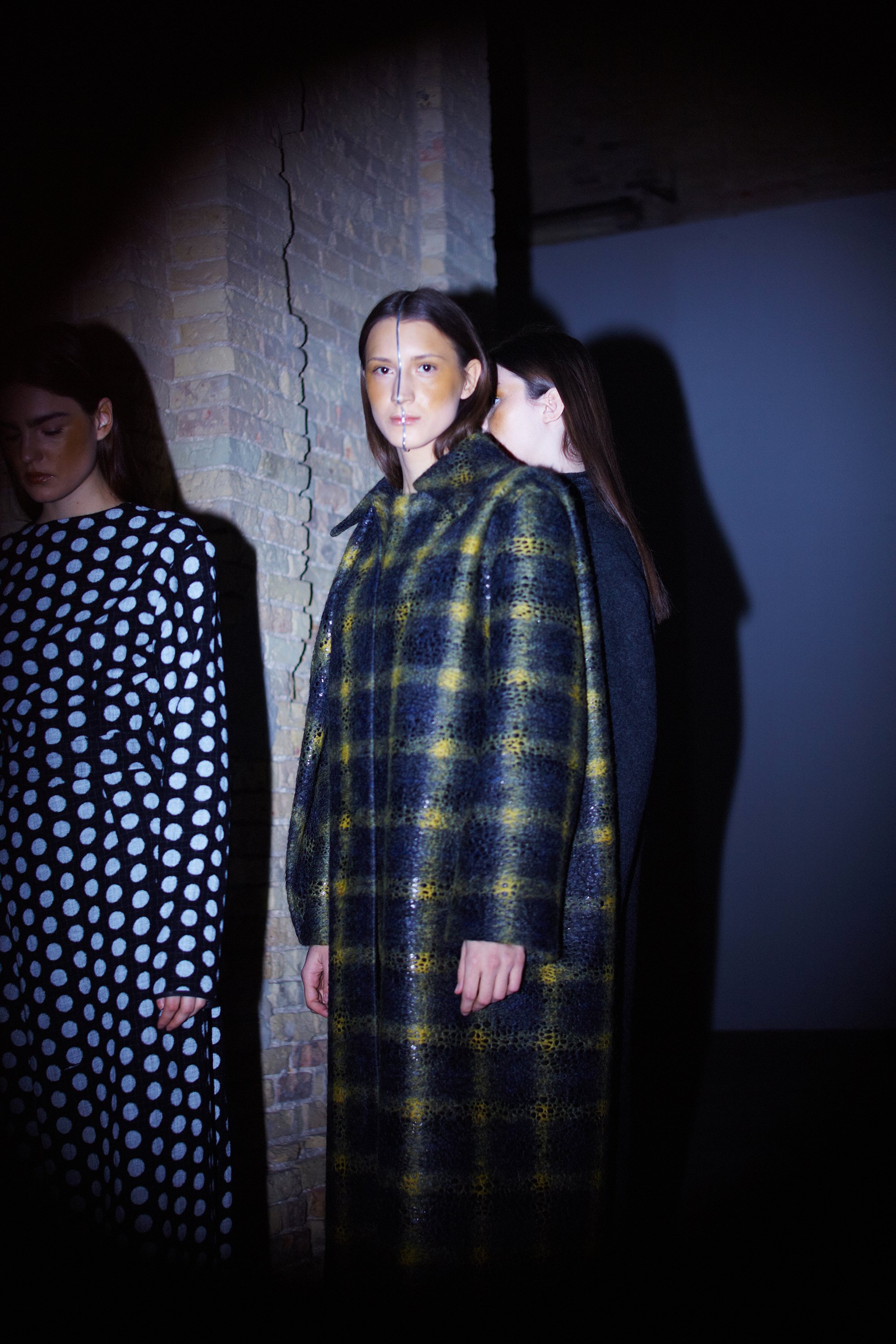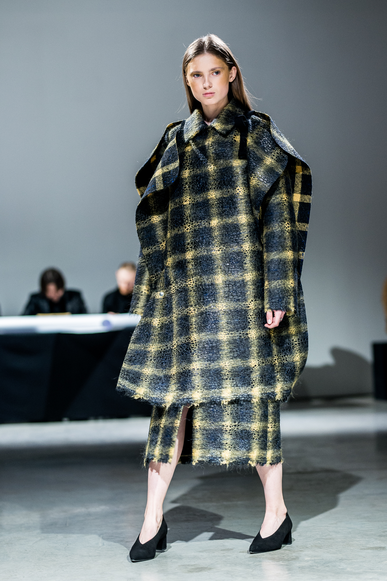 Главная роль в показе была отведена пальто – это сильная сторона Пржонской, и они действительно подкупали сочетанием утилитарности и красоты. Ткань, из которой пошиты пальто, ламинирована и водонепроницаема: что, очевидно, одновременно и практично, и красиво, потому что придавало ей блеск и мерцание, соответствующее теме футуризма. Коллекция Пржонской очень последовательна: дизайнер ничего не бросала на полпути, развивая единожды выбранное направление до конца. Так, взяв за основу косой крой рукава, Елена применяет его сразу в нескольких силуэтах: и в пальто, и в платьях, и в рубашках. Использовав горох в нескольких луках, дизайнер периодически добавляет его в качестве деталей и в других выходах – равно как не оставляет она тему с присобранным горлом и не изменяет длине миди.