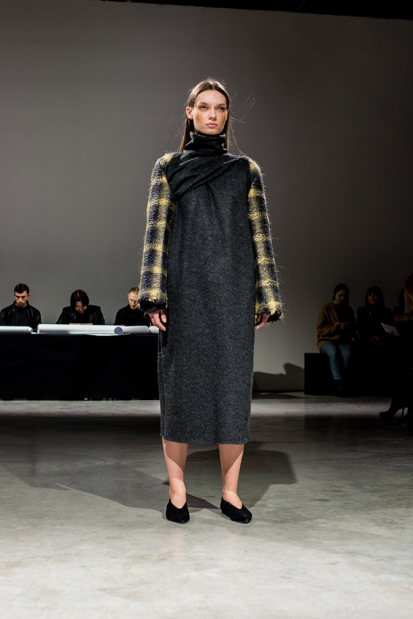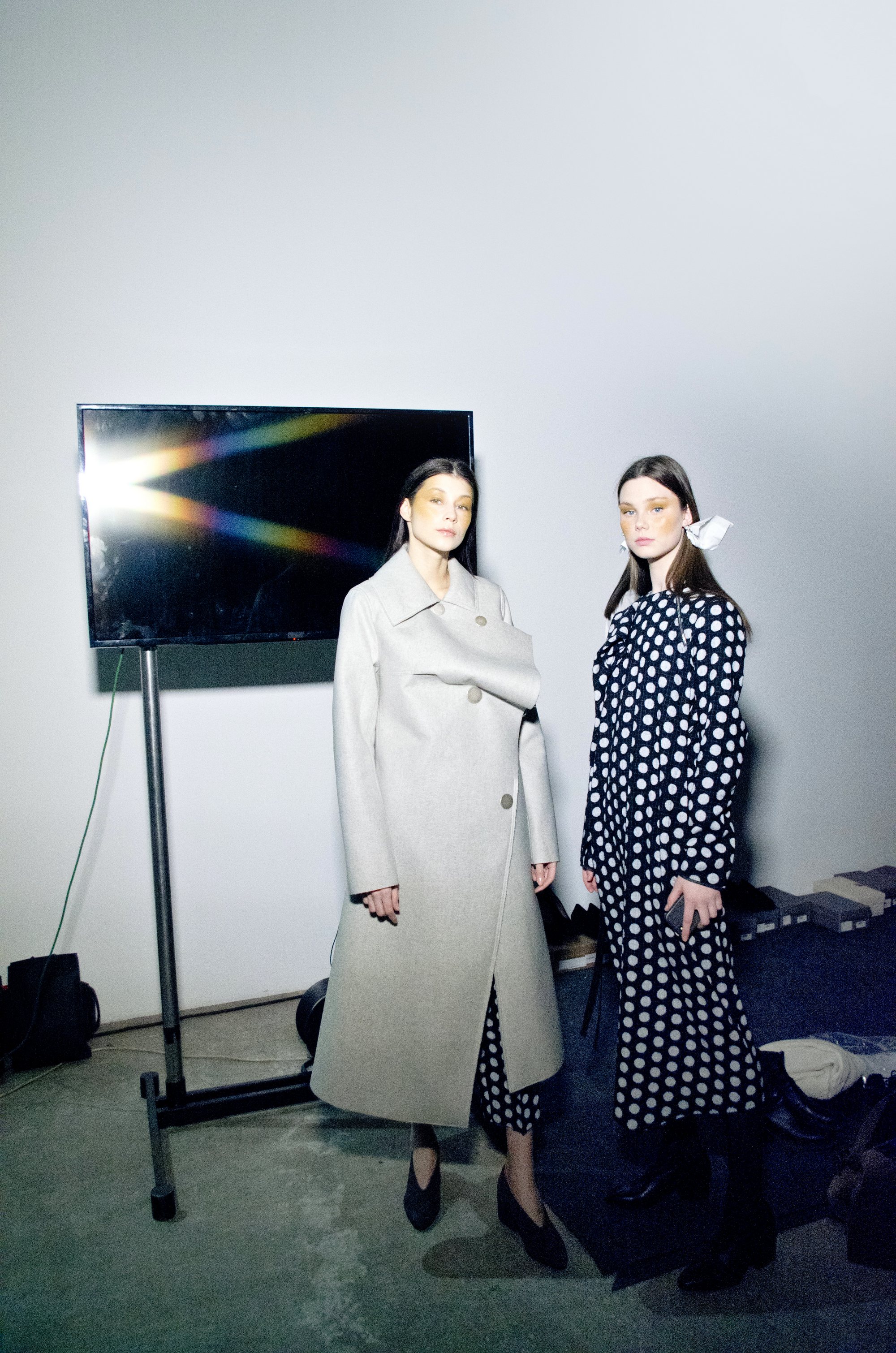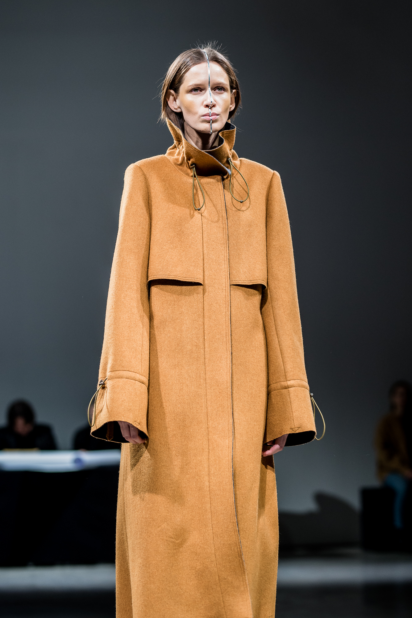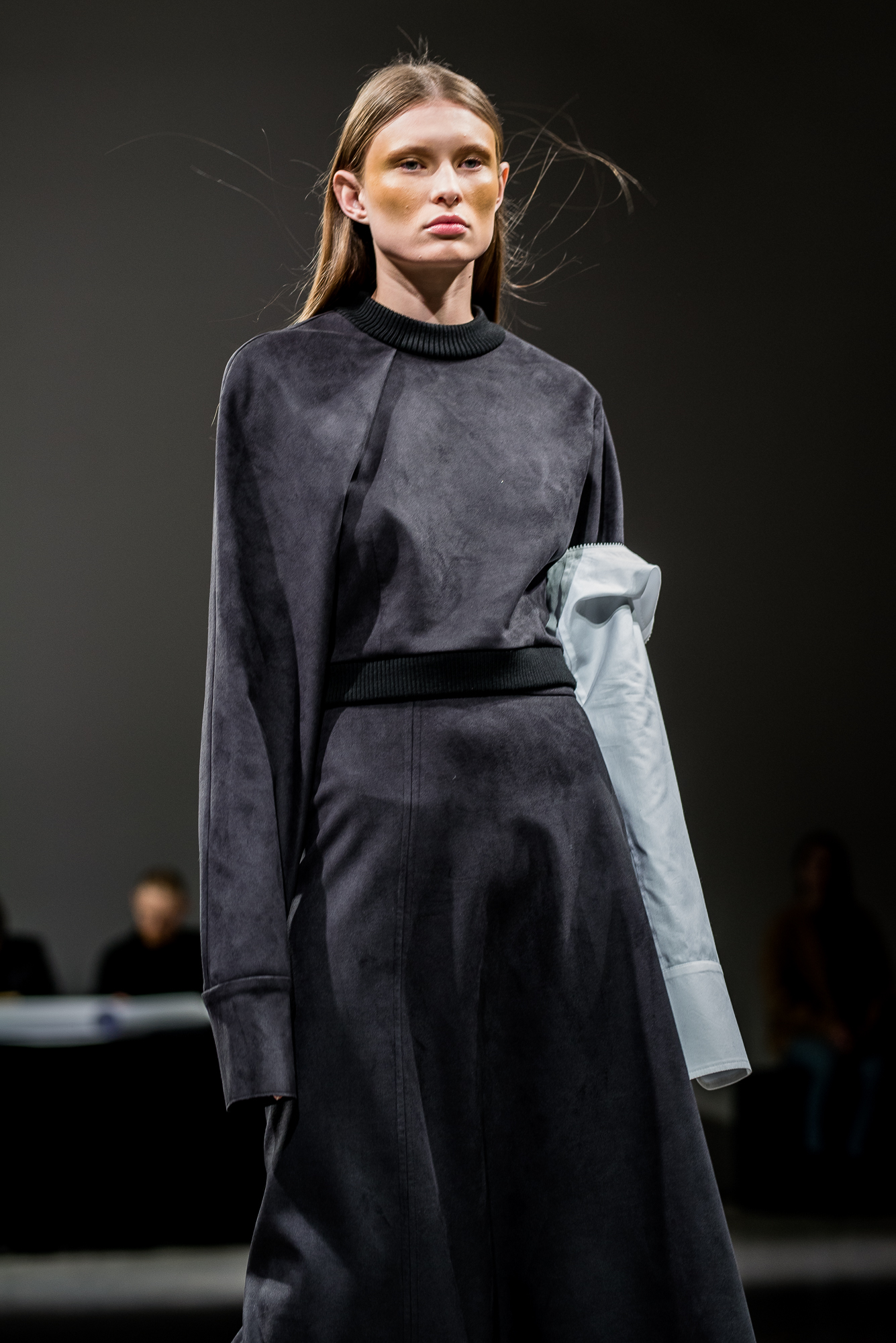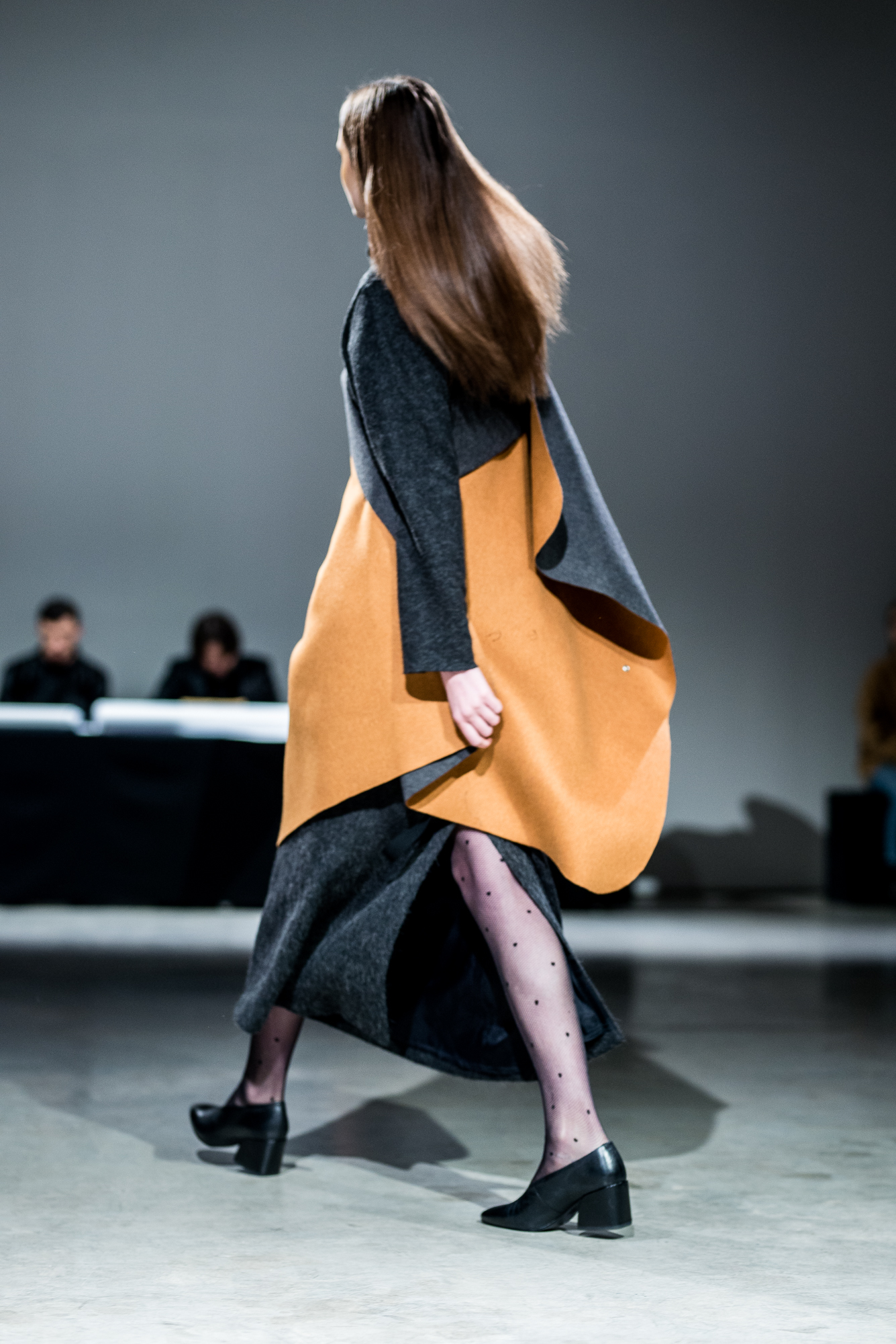 Главная роль в показе была отведена пальто – это сильная сторона Пржонской, и они действительно подкупали сочетанием утилитарности и красоты. Ткань, из которой пошиты пальто, ламинирована и водонепроницаема: что, очевидно, одновременно и практично, и красиво, потому что придавало ей блеск и мерцание, соответствующее теме футуризма. Коллекция Пржонской очень последовательна: дизайнер ничего не бросала на полпути, развивая единожды выбранное направление до конца. Так, взяв за основу косой крой рукава, Елена применяет его сразу в нескольких силуэтах: и в пальто, и в платьях, и в рубашках. Использовав горох в нескольких луках, дизайнер периодически добавляет его в качестве деталей и в других выходах – равно как не оставляет она тему с присобранным горлом и не изменяет длине миди.