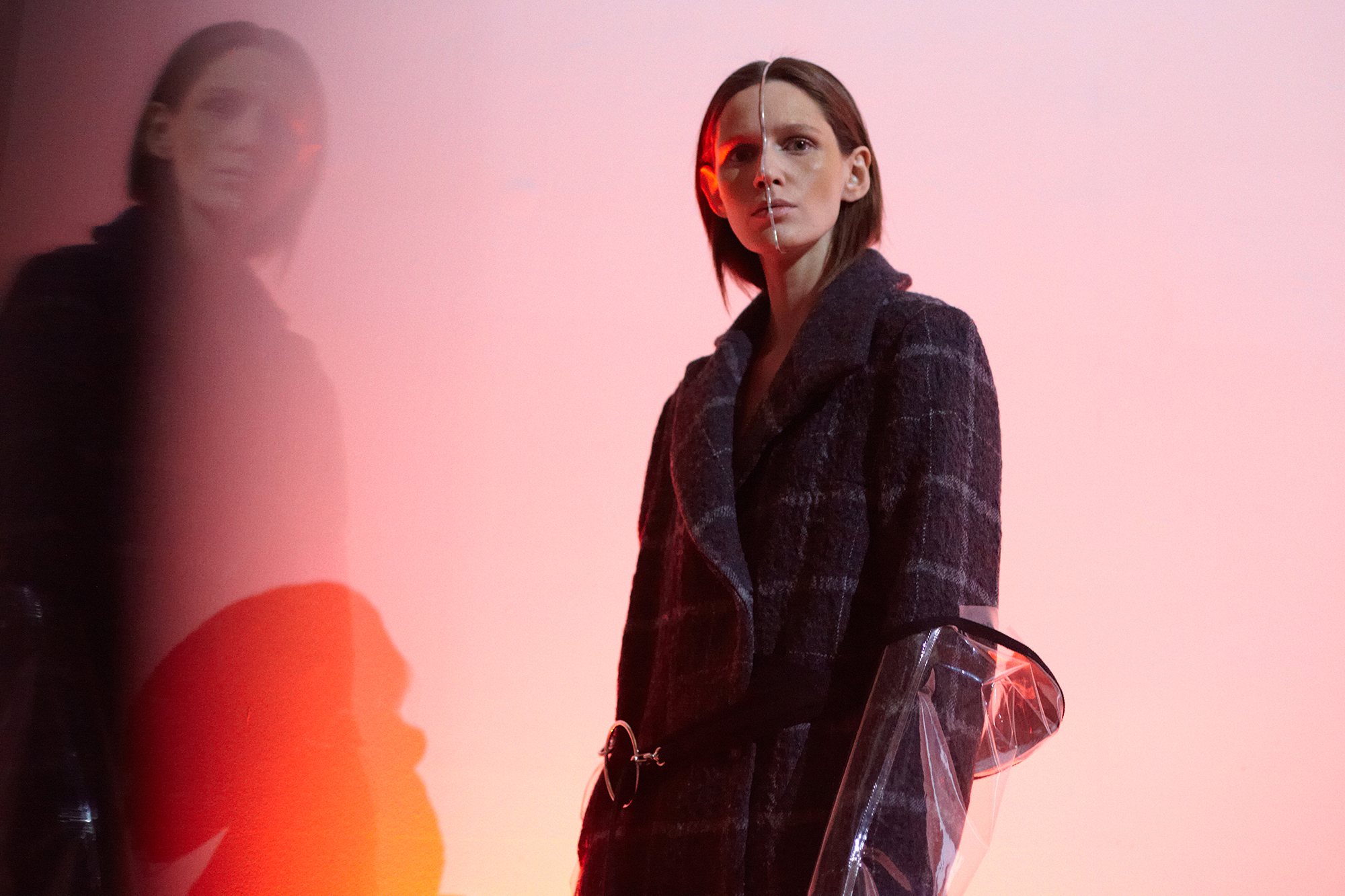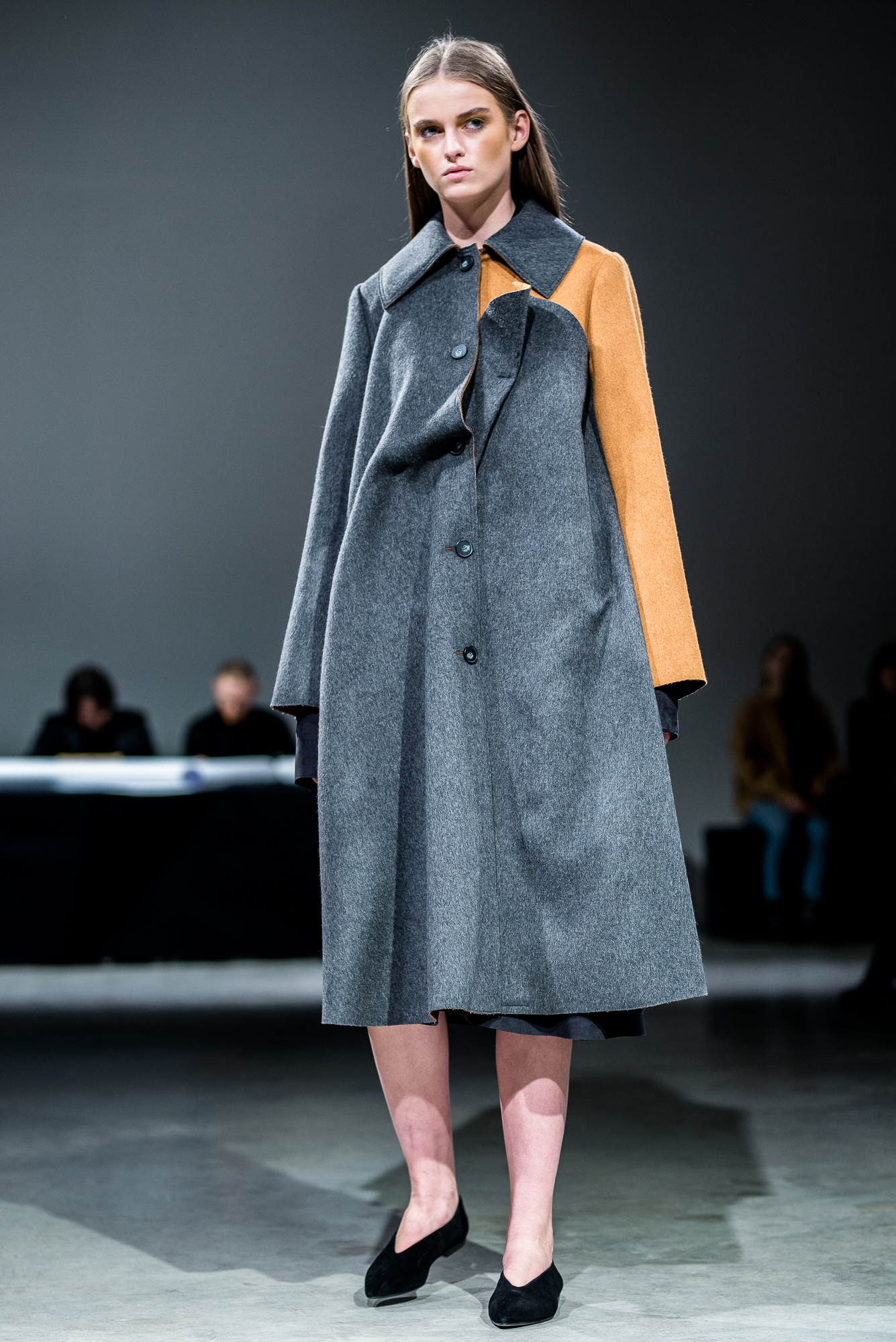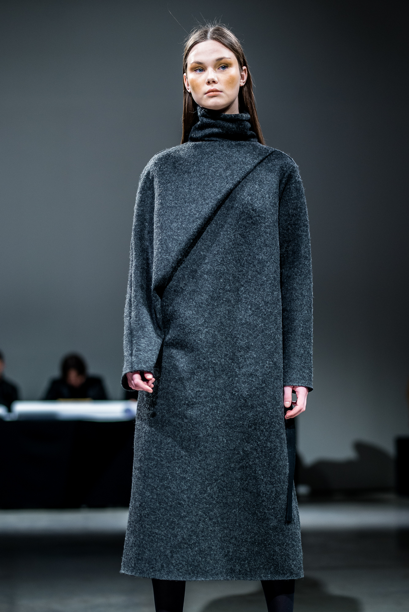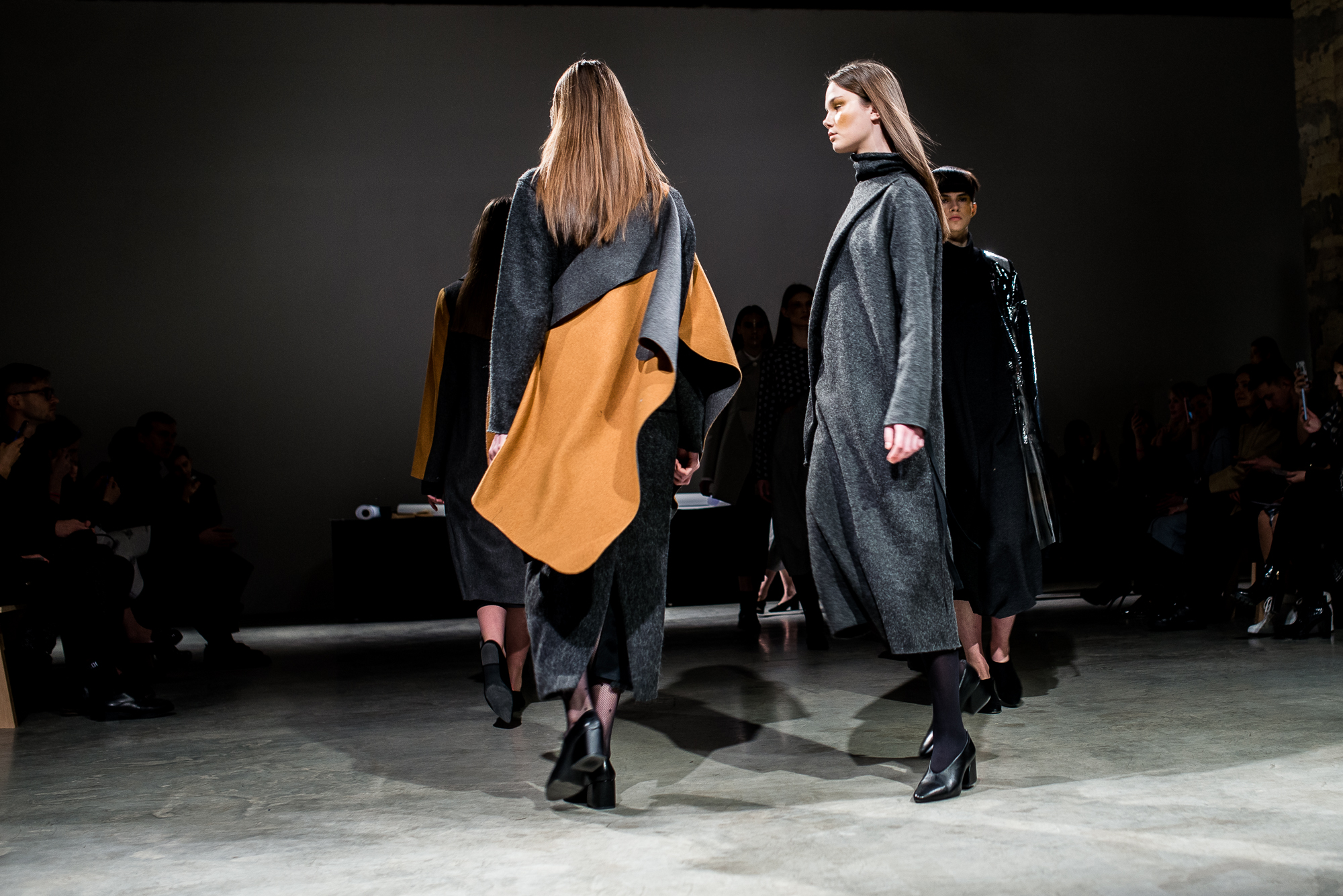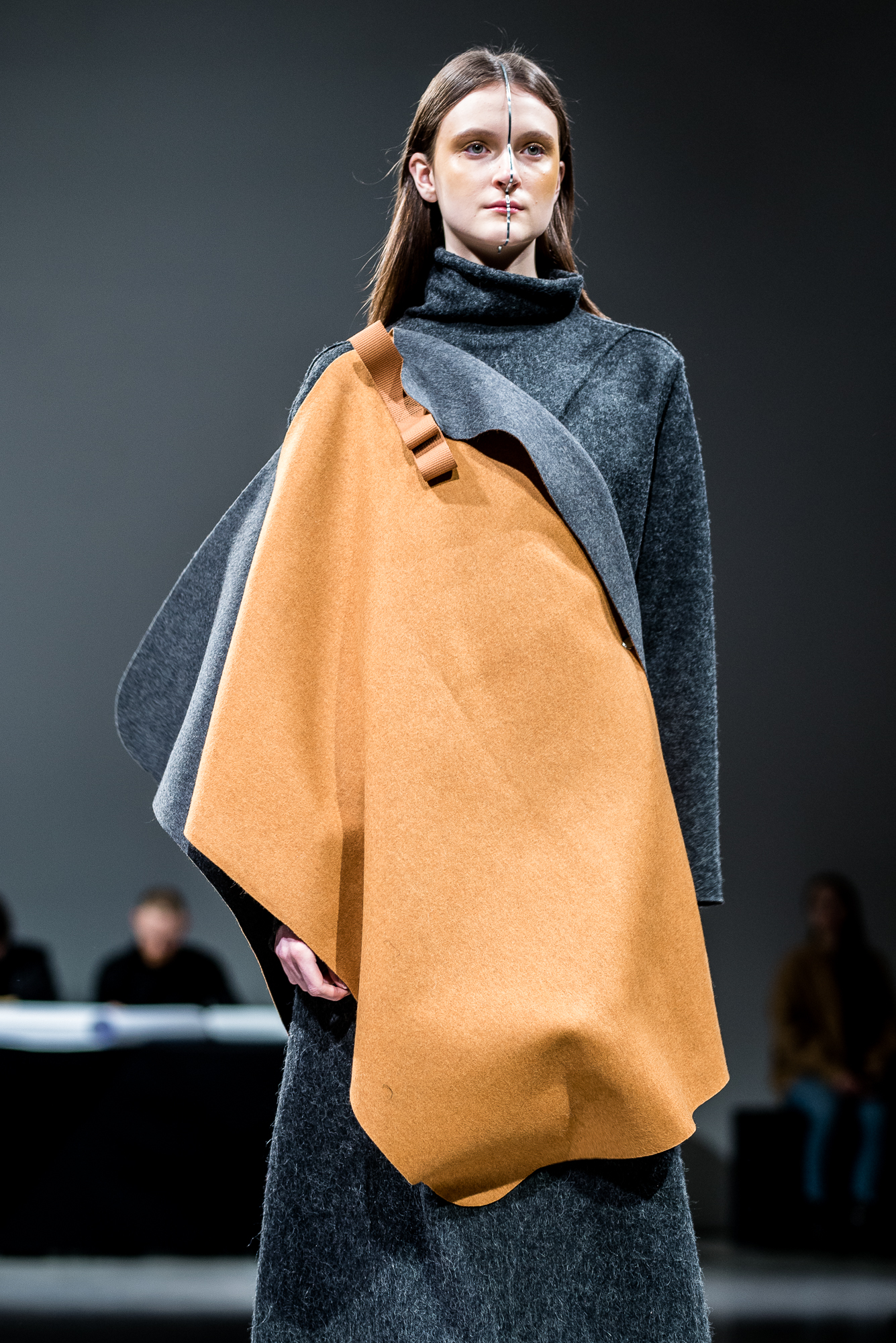 Главная роль в показе была отведена пальто – это сильная сторона Пржонской, и они действительно подкупали сочетанием утилитарности и красоты. Ткань, из которой пошиты пальто, ламинирована и водонепроницаема: что, очевидно, одновременно и практично, и красиво, потому что придавало ей блеск и мерцание, соответствующее теме футуризма. Коллекция Пржонской очень последовательна: дизайнер ничего не бросала на полпути, развивая единожды выбранное направление до конца. Так, взяв за основу косой крой рукава, Елена применяет его сразу в нескольких силуэтах: и в пальто, и в платьях, и в рубашках. Использовав горох в нескольких луках, дизайнер периодически добавляет его в качестве деталей и в других выходах – равно как не оставляет она тему с присобранным горлом и не изменяет длине миди.