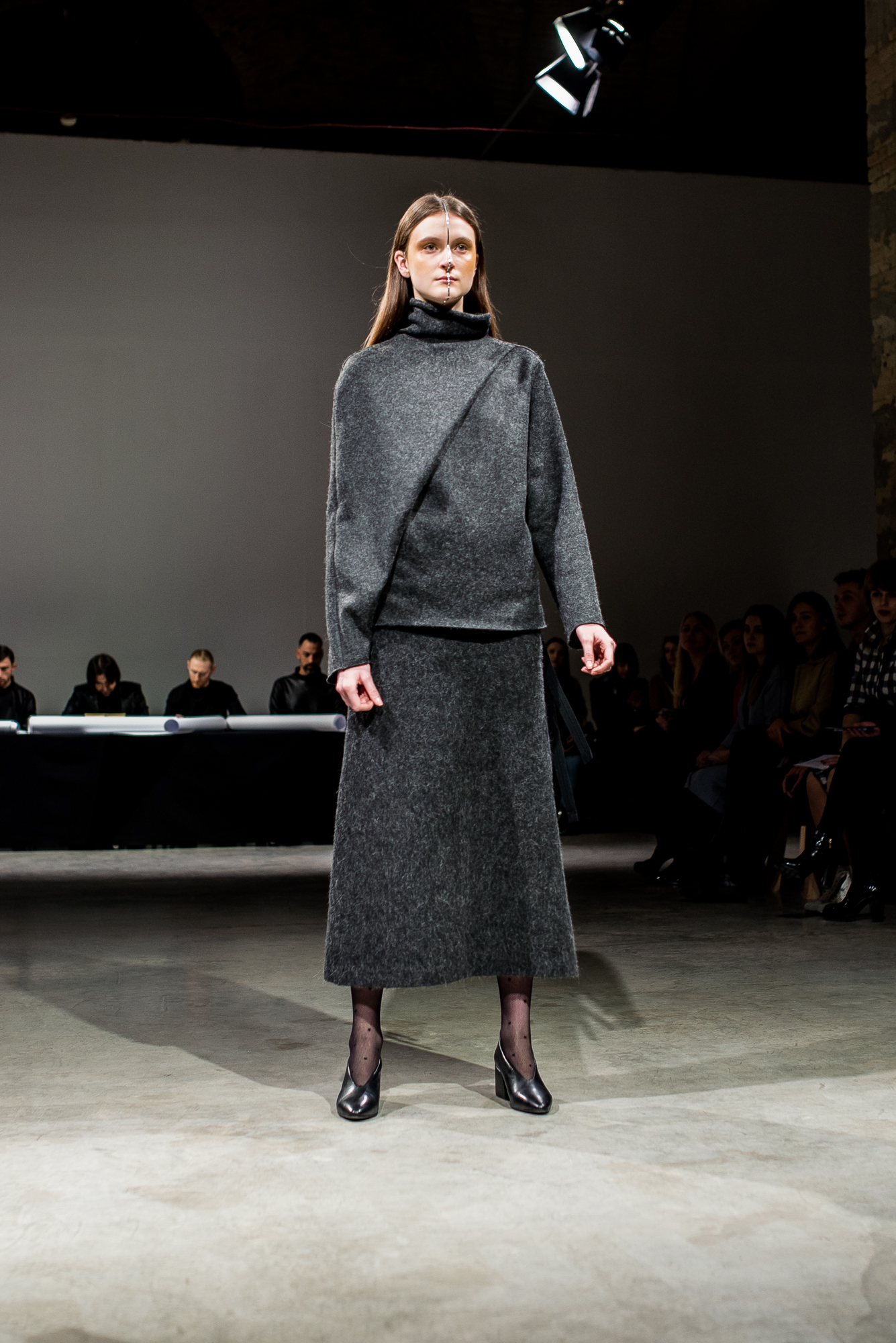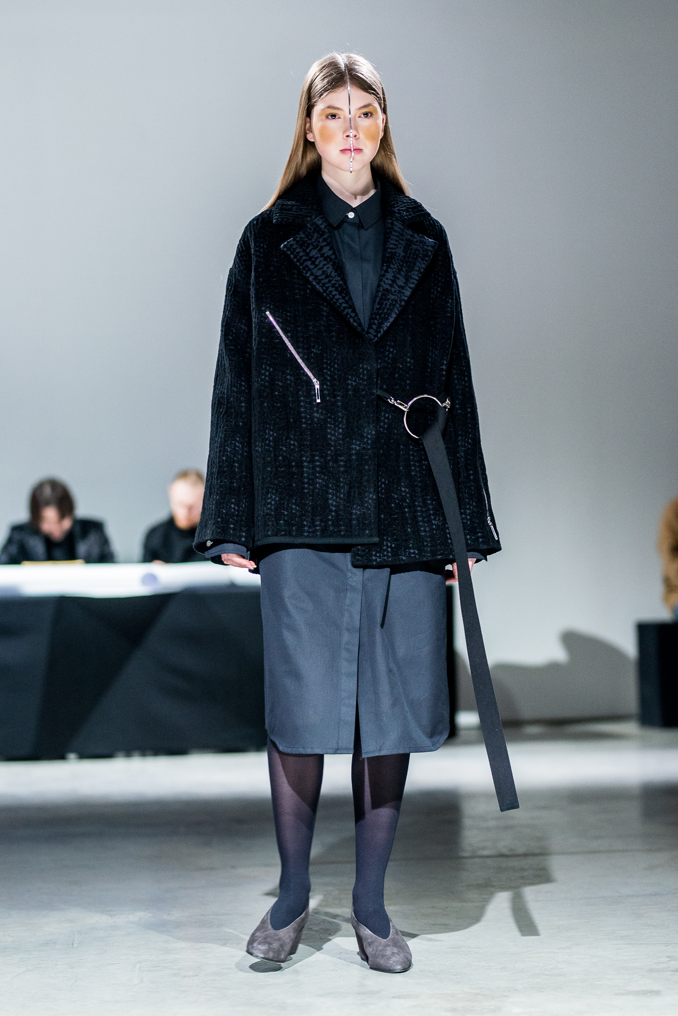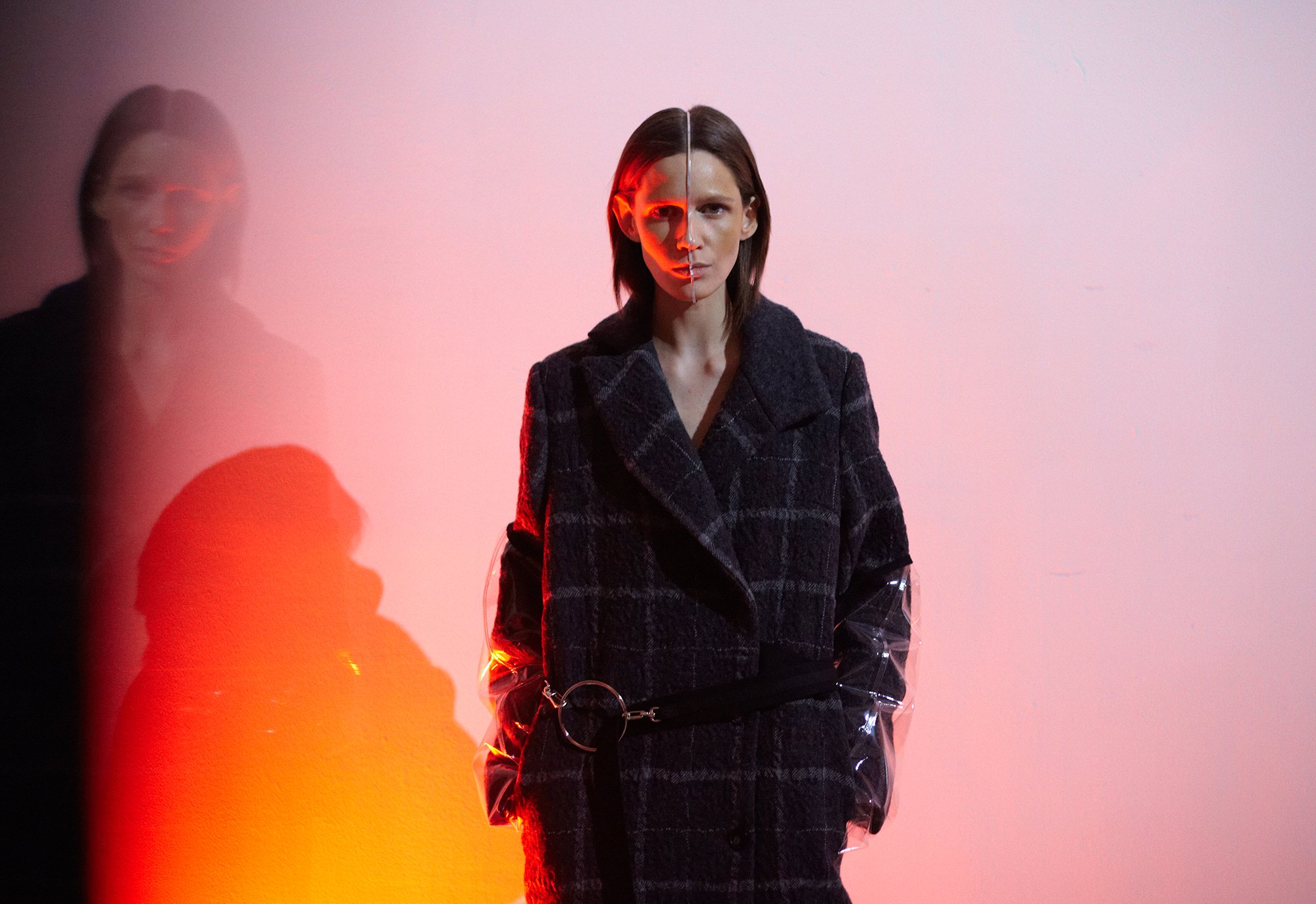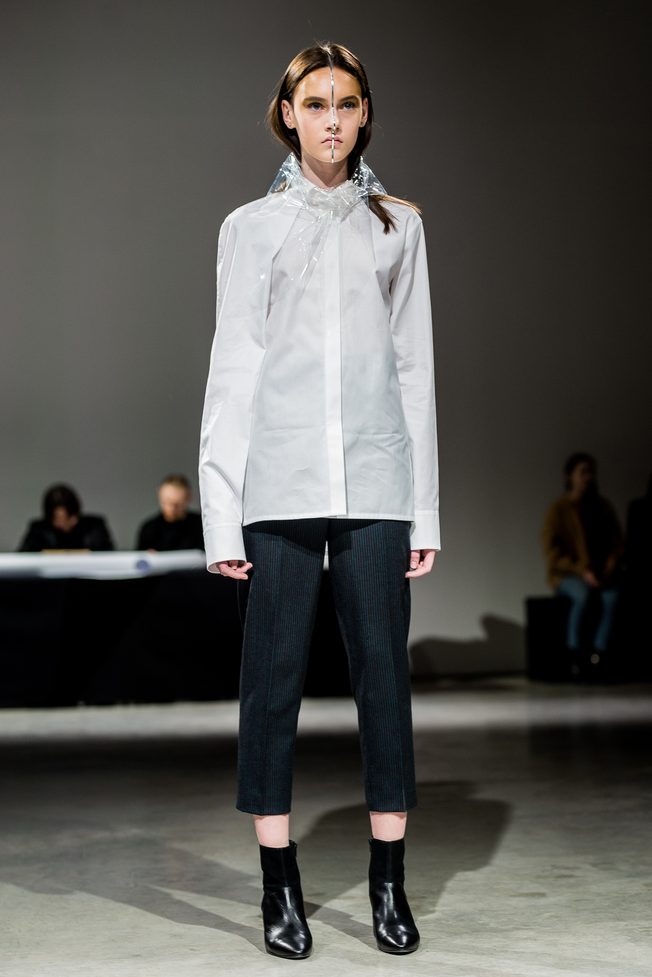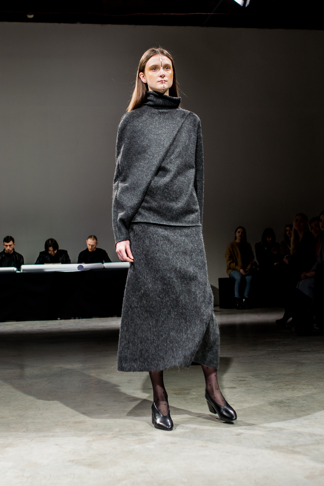Главная роль в показе была отведена пальто – это сильная сторона Пржонской, и они действительно подкупали сочетанием утилитарности и красоты. Ткань, из которой пошиты пальто, ламинирована и водонепроницаема: что, очевидно, одновременно и практично, и красиво, потому что придавало ей блеск и мерцание, соответствующее теме футуризма. Коллекция Пржонской очень последовательна: дизайнер ничего не бросала на полпути, развивая единожды выбранное направление до конца. Так, взяв за основу косой крой рукава, Елена применяет его сразу в нескольких силуэтах: и в пальто, и в платьях, и в рубашках. Использовав горох в нескольких луках, дизайнер периодически добавляет его в качестве деталей и в других выходах – равно как не оставляет она тему с присобранным горлом и не изменяет длине миди.