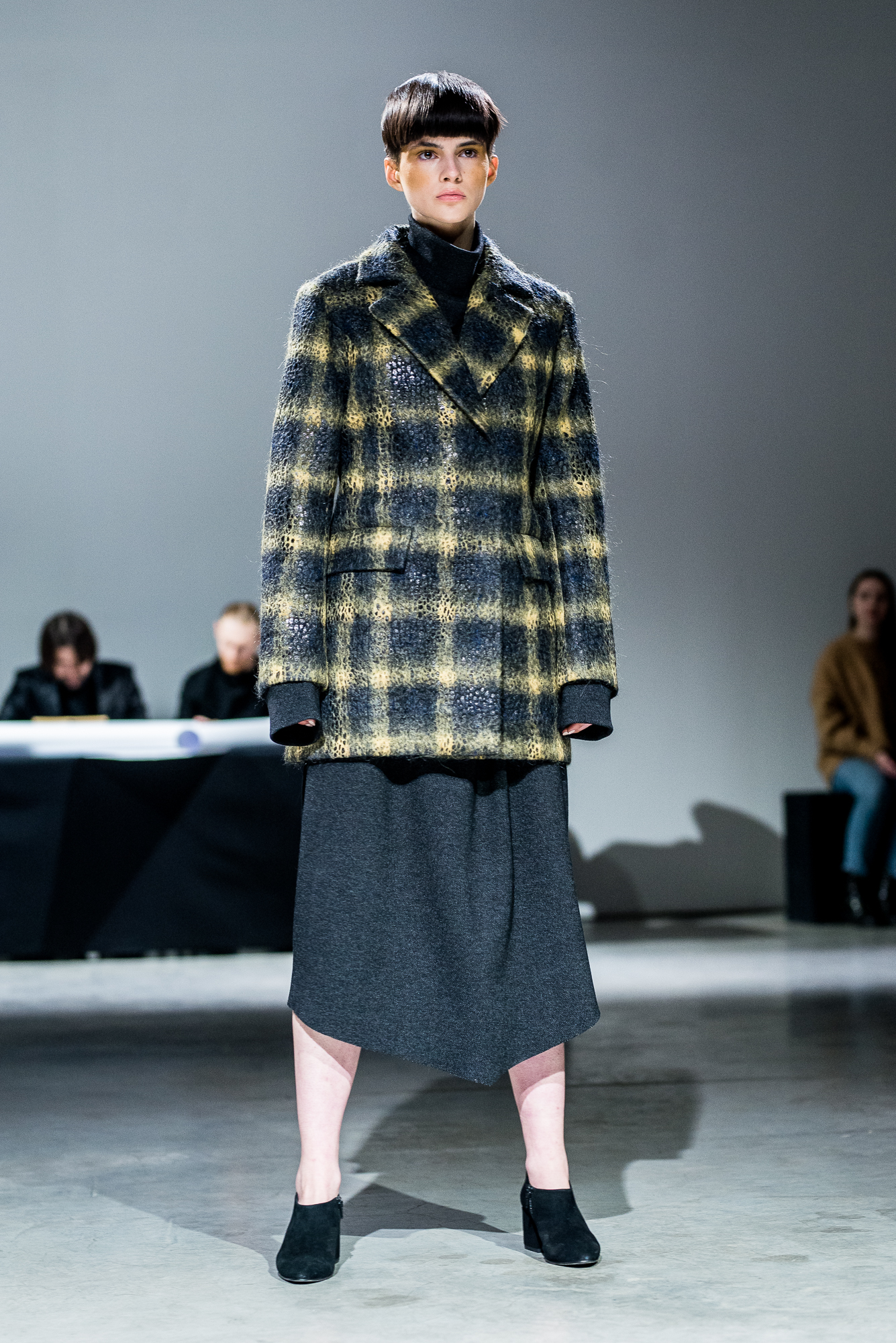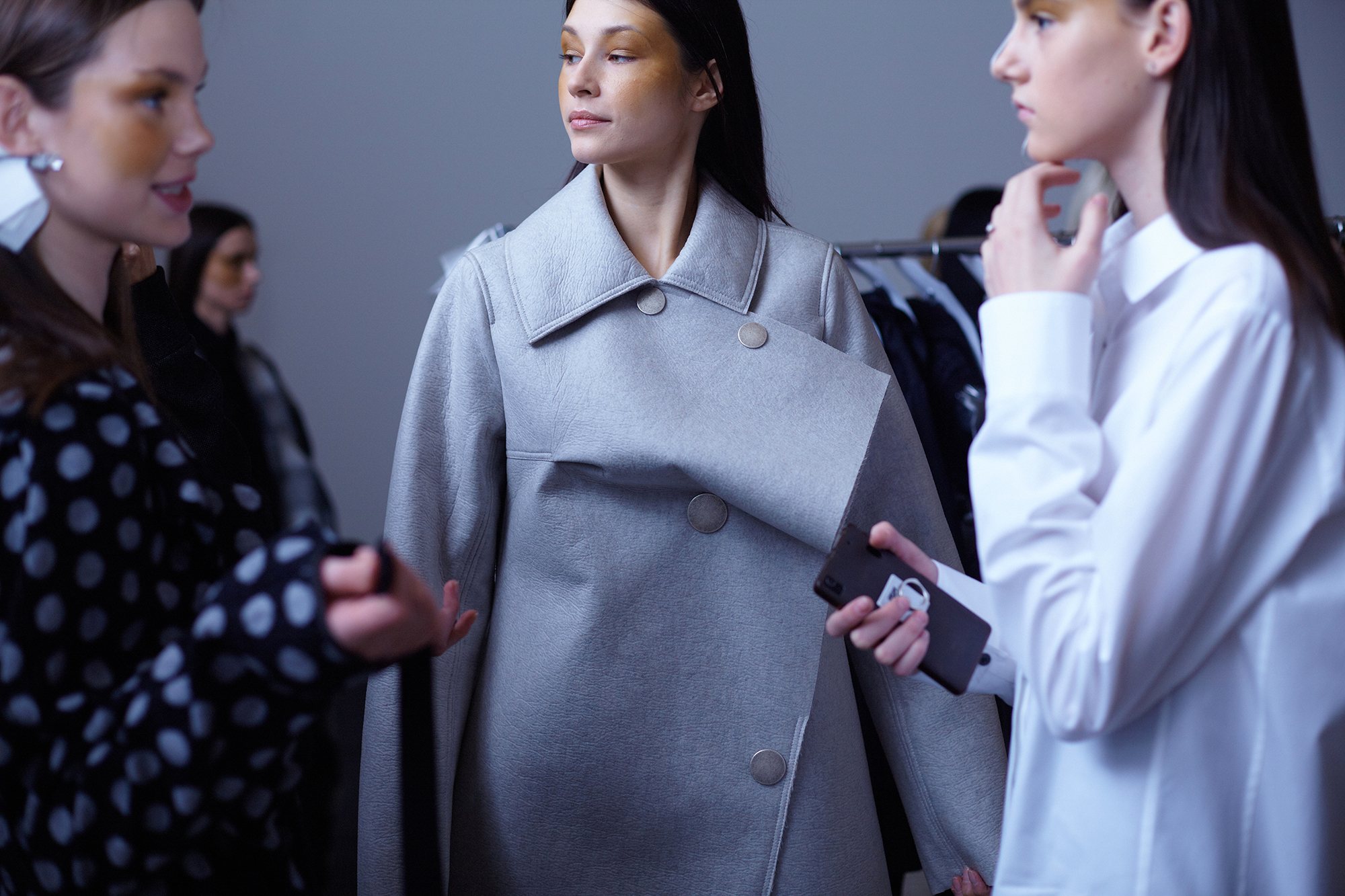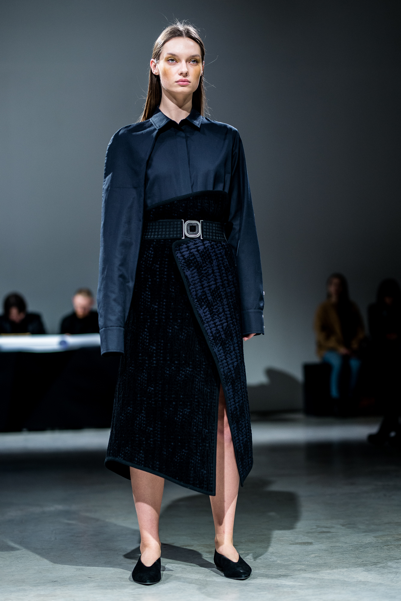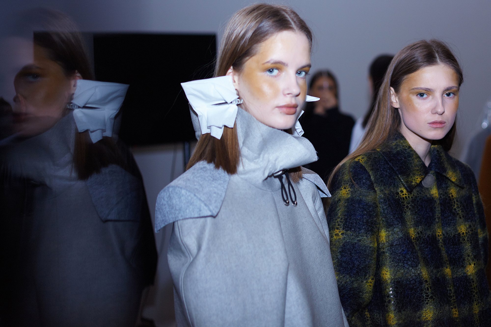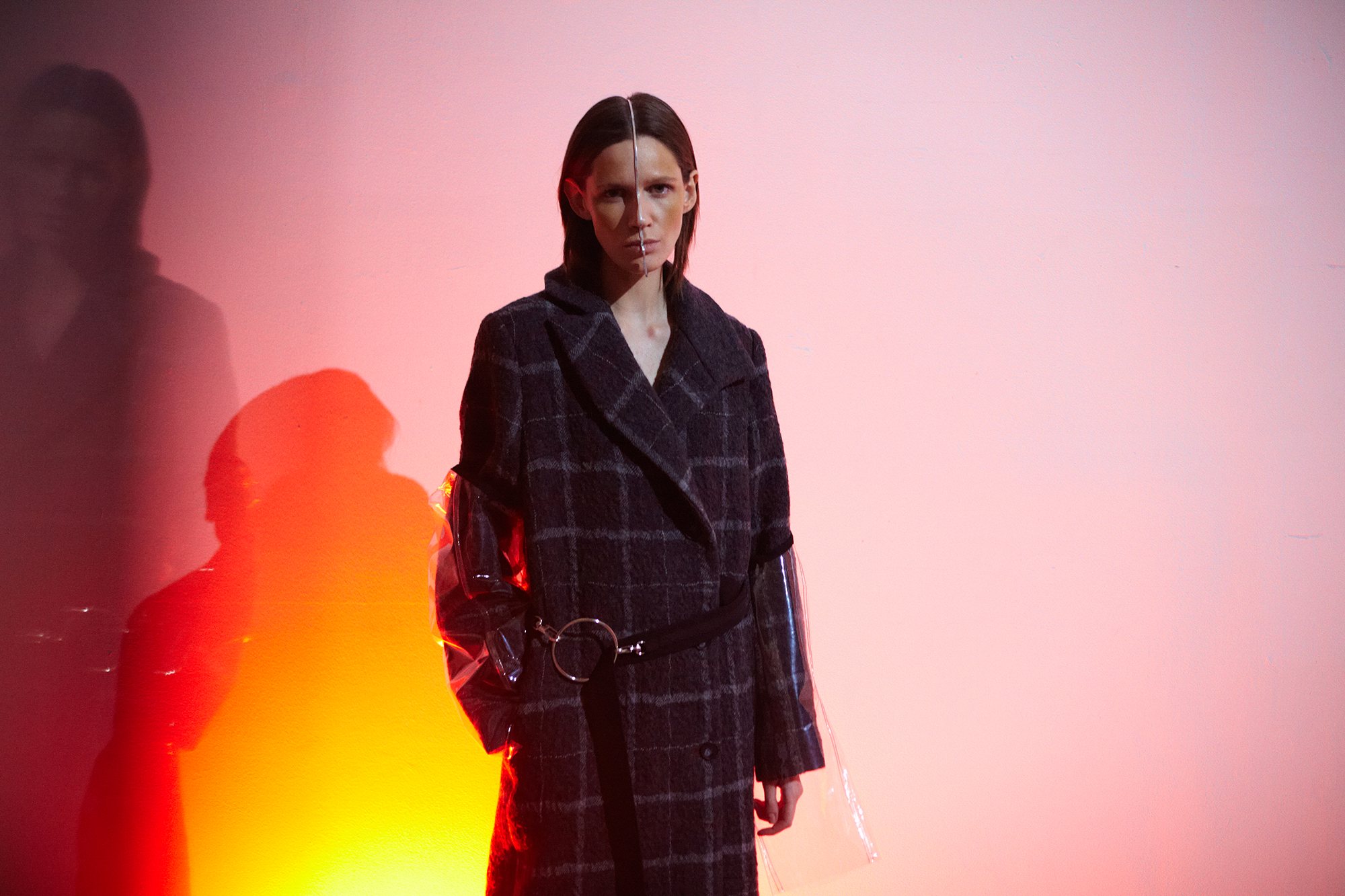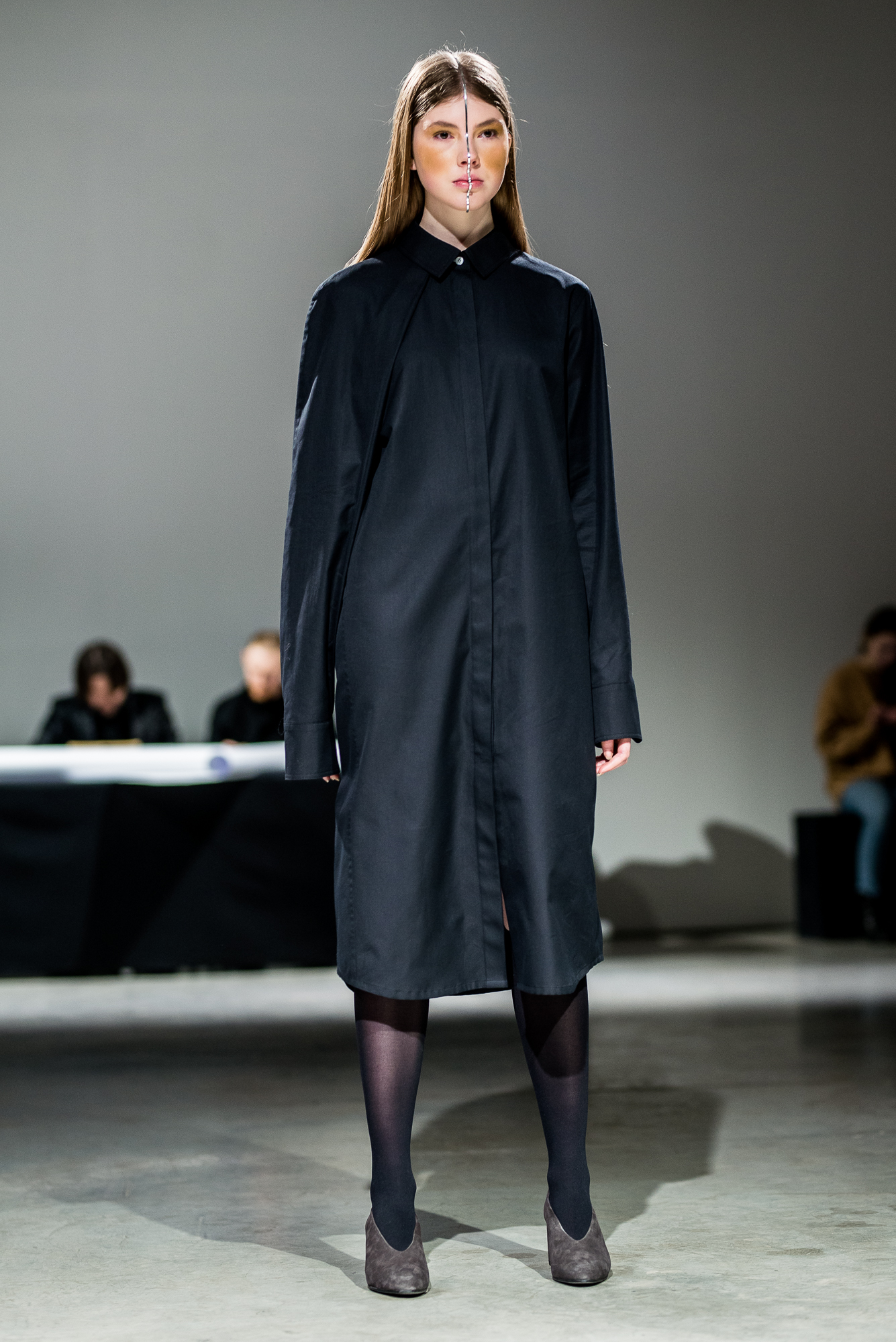 Главная роль в показе была отведена пальто – это сильная сторона Пржонской, и они действительно подкупали сочетанием утилитарности и красоты. Ткань, из которой пошиты пальто, ламинирована и водонепроницаема: что, очевидно, одновременно и практично, и красиво, потому что придавало ей блеск и мерцание, соответствующее теме футуризма. Коллекция Пржонской очень последовательна: дизайнер ничего не бросала на полпути, развивая единожды выбранное направление до конца. Так, взяв за основу косой крой рукава, Елена применяет его сразу в нескольких силуэтах: и в пальто, и в платьях, и в рубашках. Использовав горох в нескольких луках, дизайнер периодически добавляет его в качестве деталей и в других выходах – равно как не оставляет она тему с присобранным горлом и не изменяет длине миди.