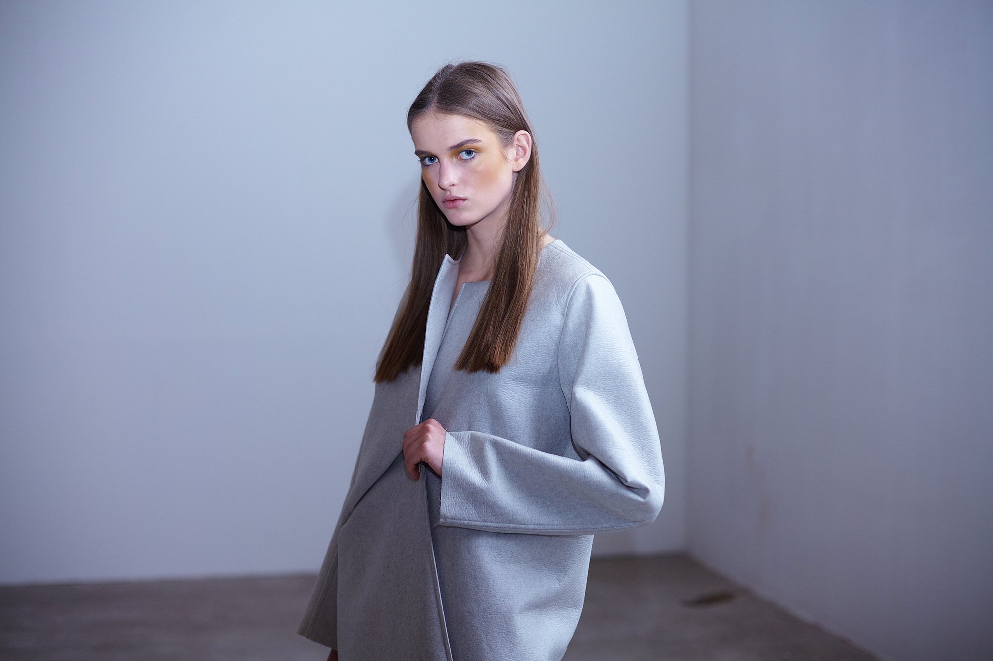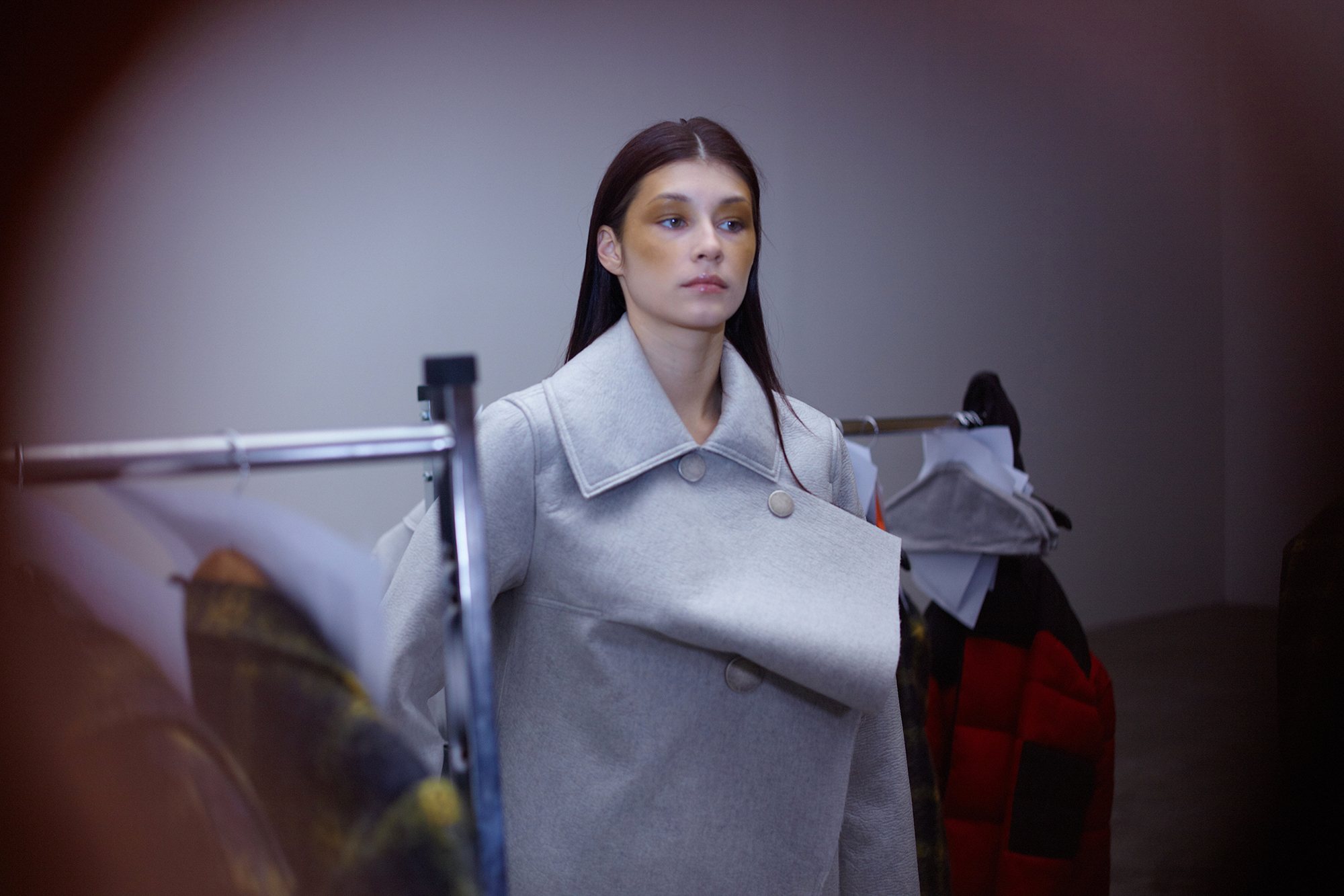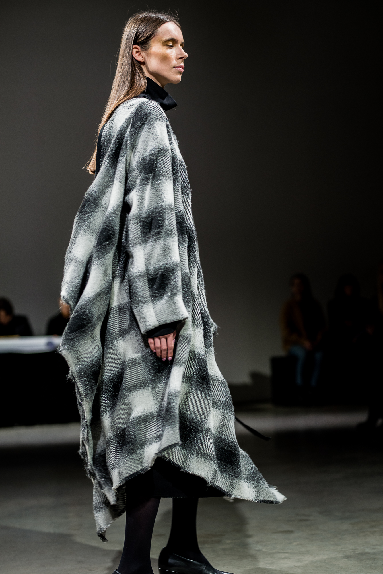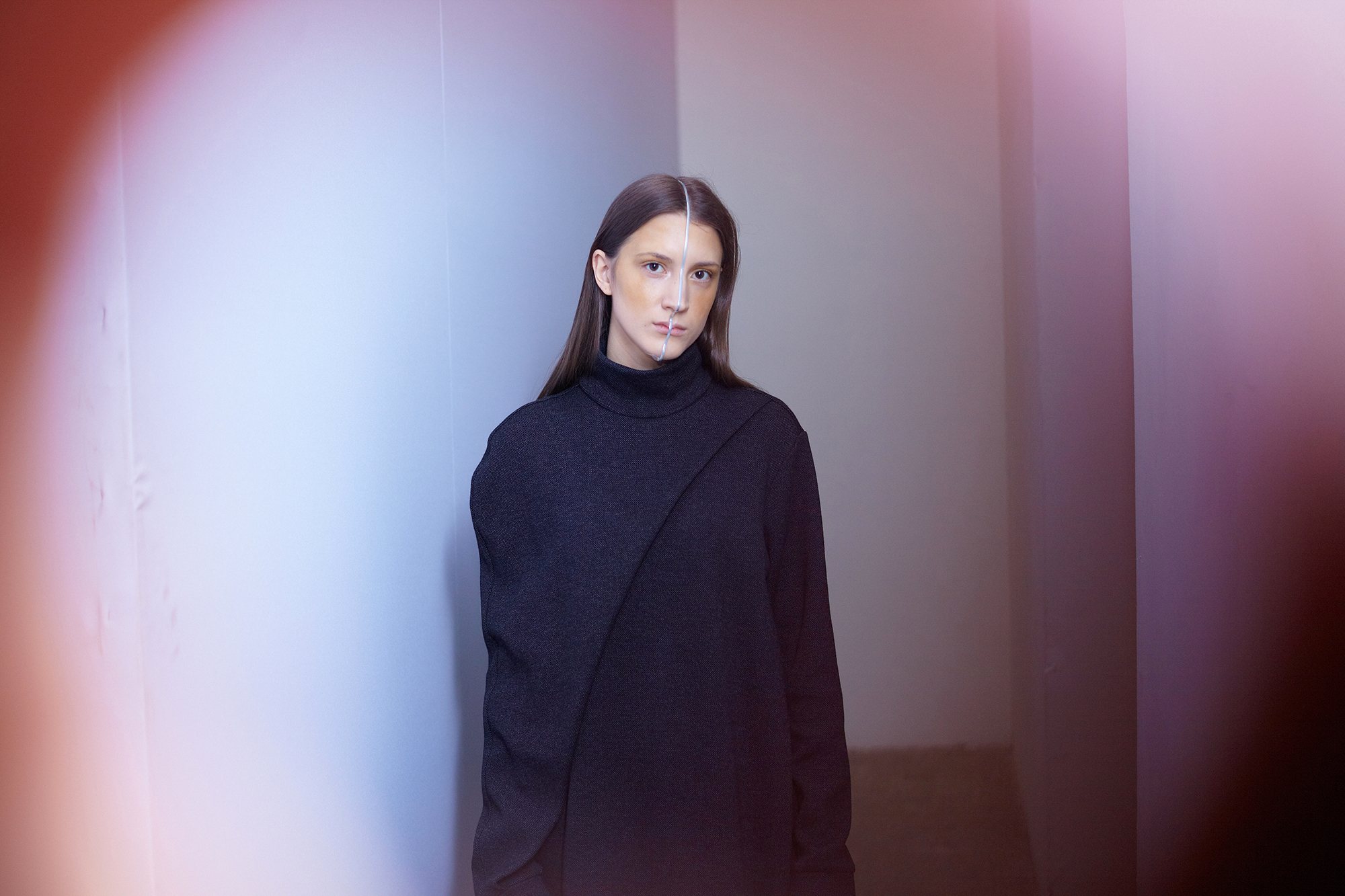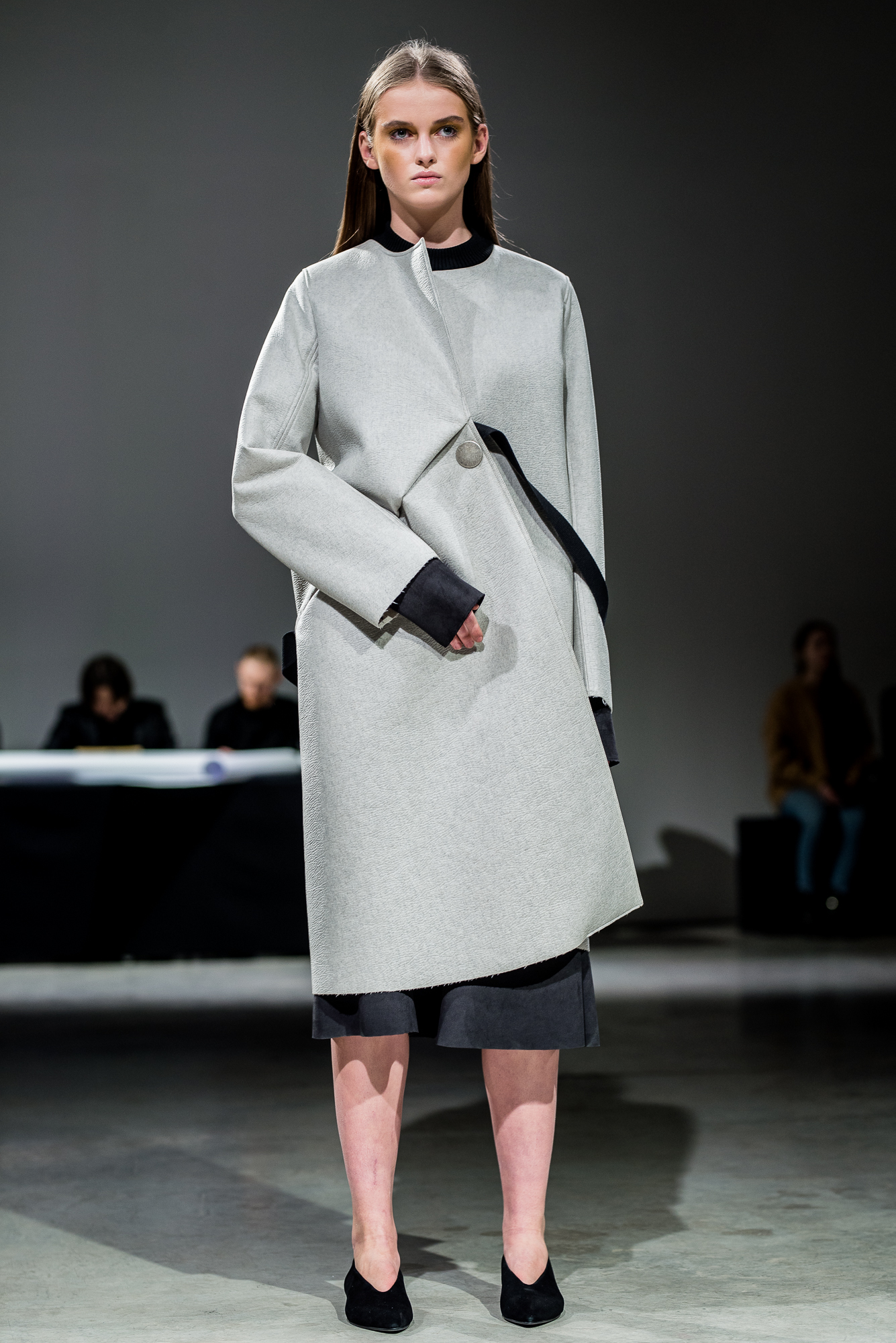 Главная роль в показе была отведена пальто – это сильная сторона Пржонской, и они действительно подкупали сочетанием утилитарности и красоты. Ткань, из которой пошиты пальто, ламинирована и водонепроницаема: что, очевидно, одновременно и практично, и красиво, потому что придавало ей блеск и мерцание, соответствующее теме футуризма. Коллекция Пржонской очень последовательна: дизайнер ничего не бросала на полпути, развивая единожды выбранное направление до конца. Так, взяв за основу косой крой рукава, Елена применяет его сразу в нескольких силуэтах: и в пальто, и в платьях, и в рубашках. Использовав горох в нескольких луках, дизайнер периодически добавляет его в качестве деталей и в других выходах – равно как не оставляет она тему с присобранным горлом и не изменяет длине миди.