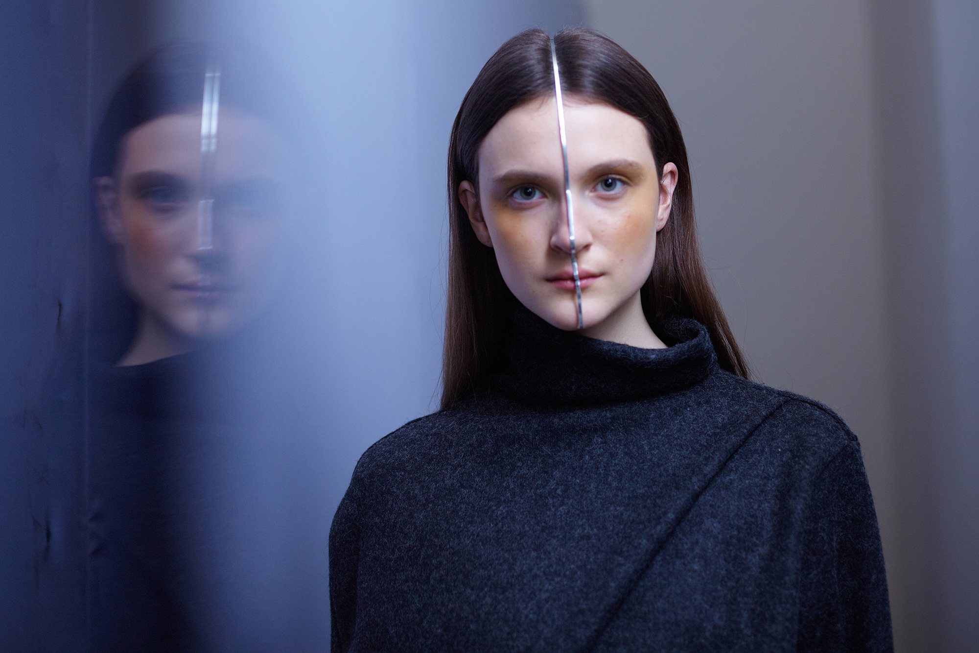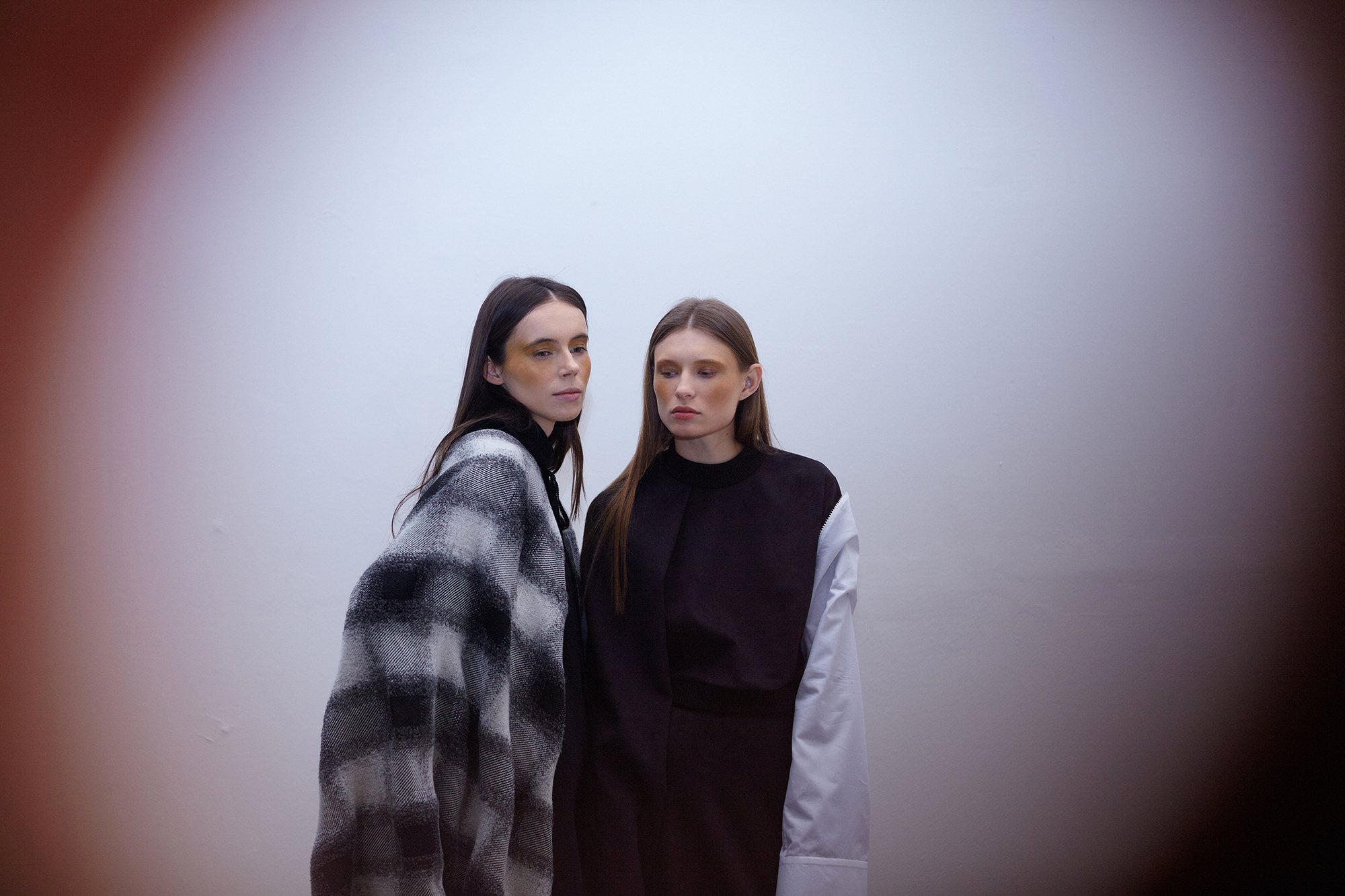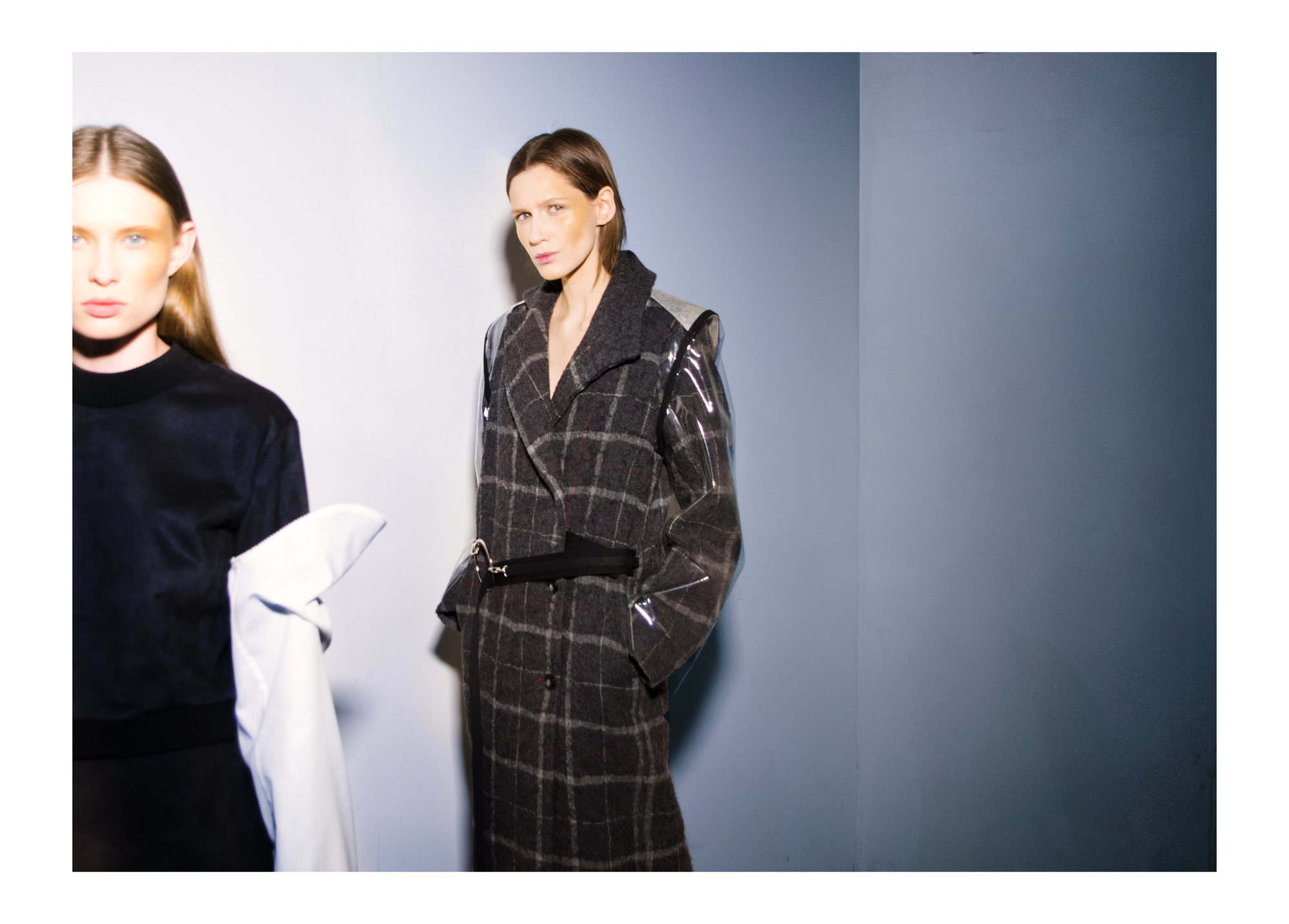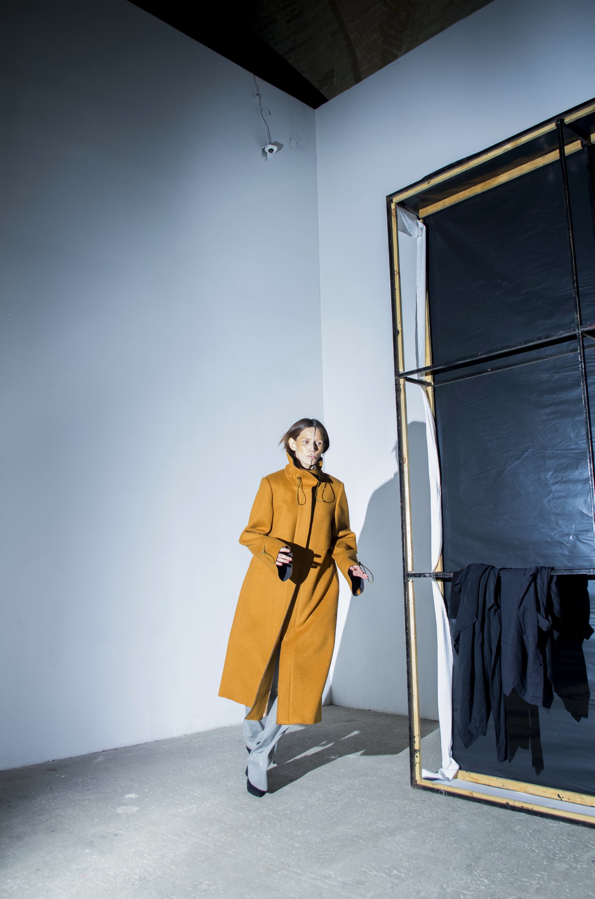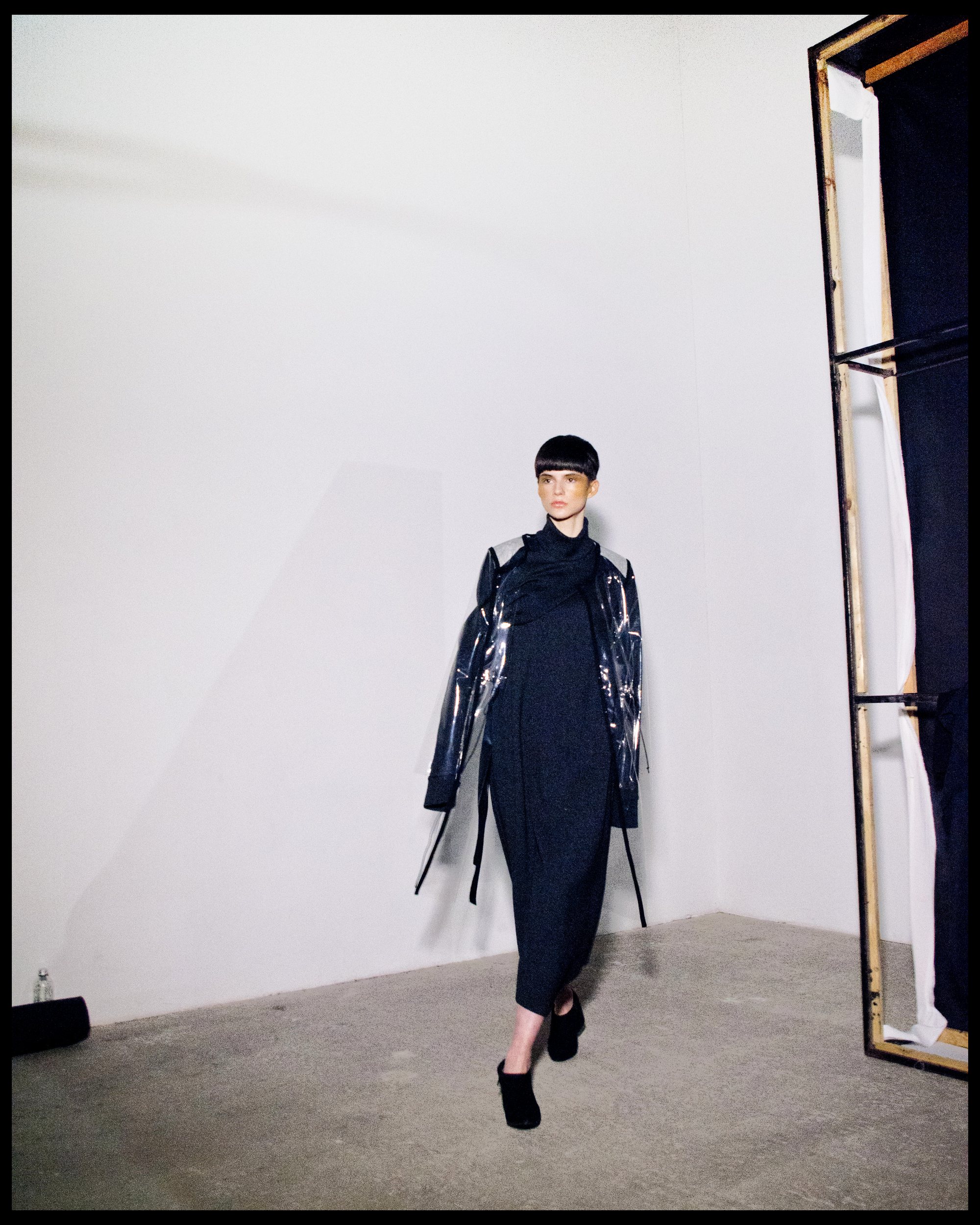 Главная роль в показе была отведена пальто – это сильная сторона Пржонской, и они действительно подкупали сочетанием утилитарности и красоты. Ткань, из которой пошиты пальто, ламинирована и водонепроницаема: что, очевидно, одновременно и практично, и красиво, потому что придавало ей блеск и мерцание, соответствующее теме футуризма. Коллекция Пржонской очень последовательна: дизайнер ничего не бросала на полпути, развивая единожды выбранное направление до конца. Так, взяв за основу косой крой рукава, Елена применяет его сразу в нескольких силуэтах: и в пальто, и в платьях, и в рубашках. Использовав горох в нескольких луках, дизайнер периодически добавляет его в качестве деталей и в других выходах – равно как не оставляет она тему с присобранным горлом и не изменяет длине миди.