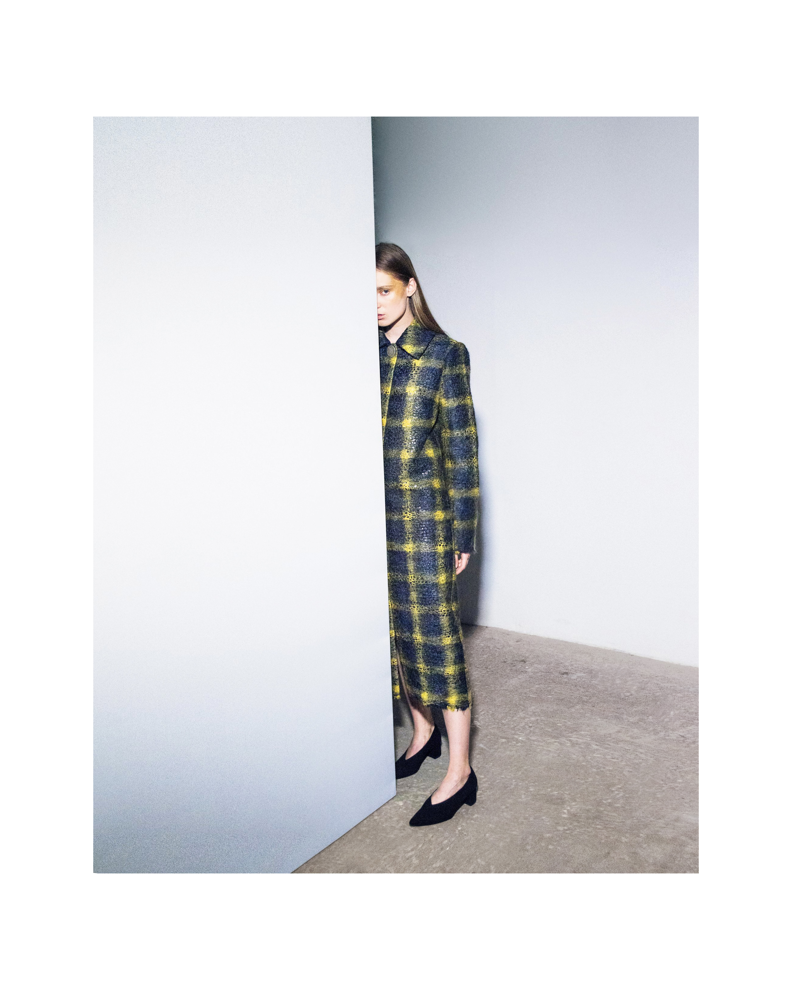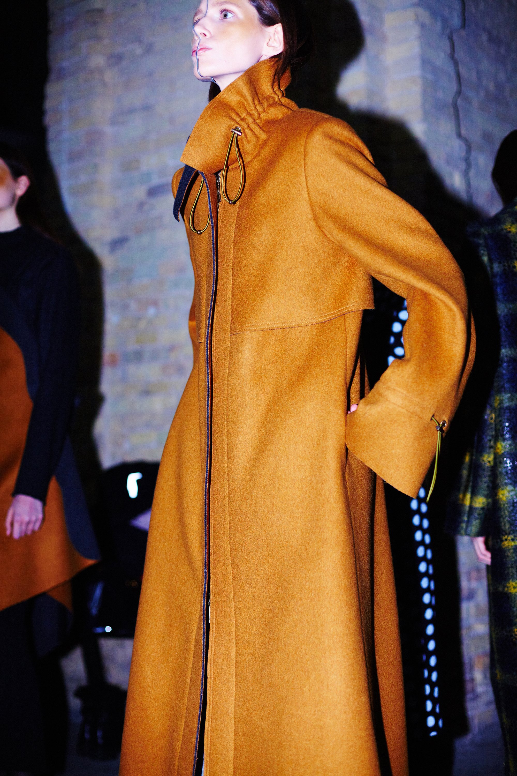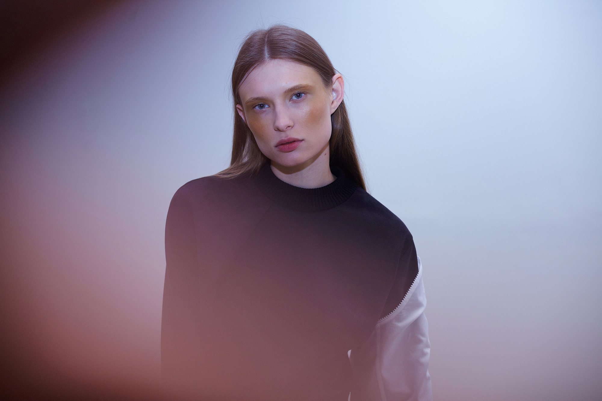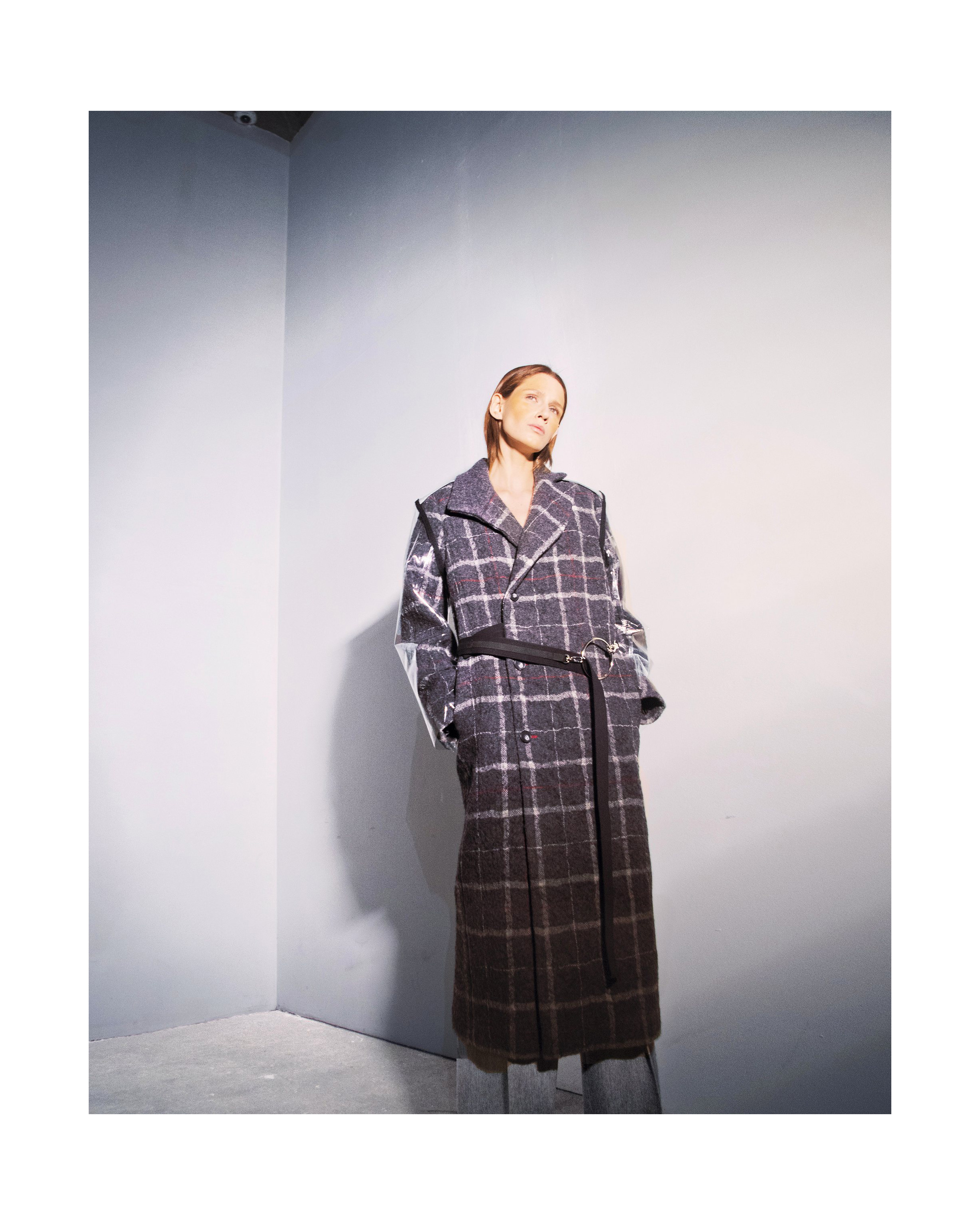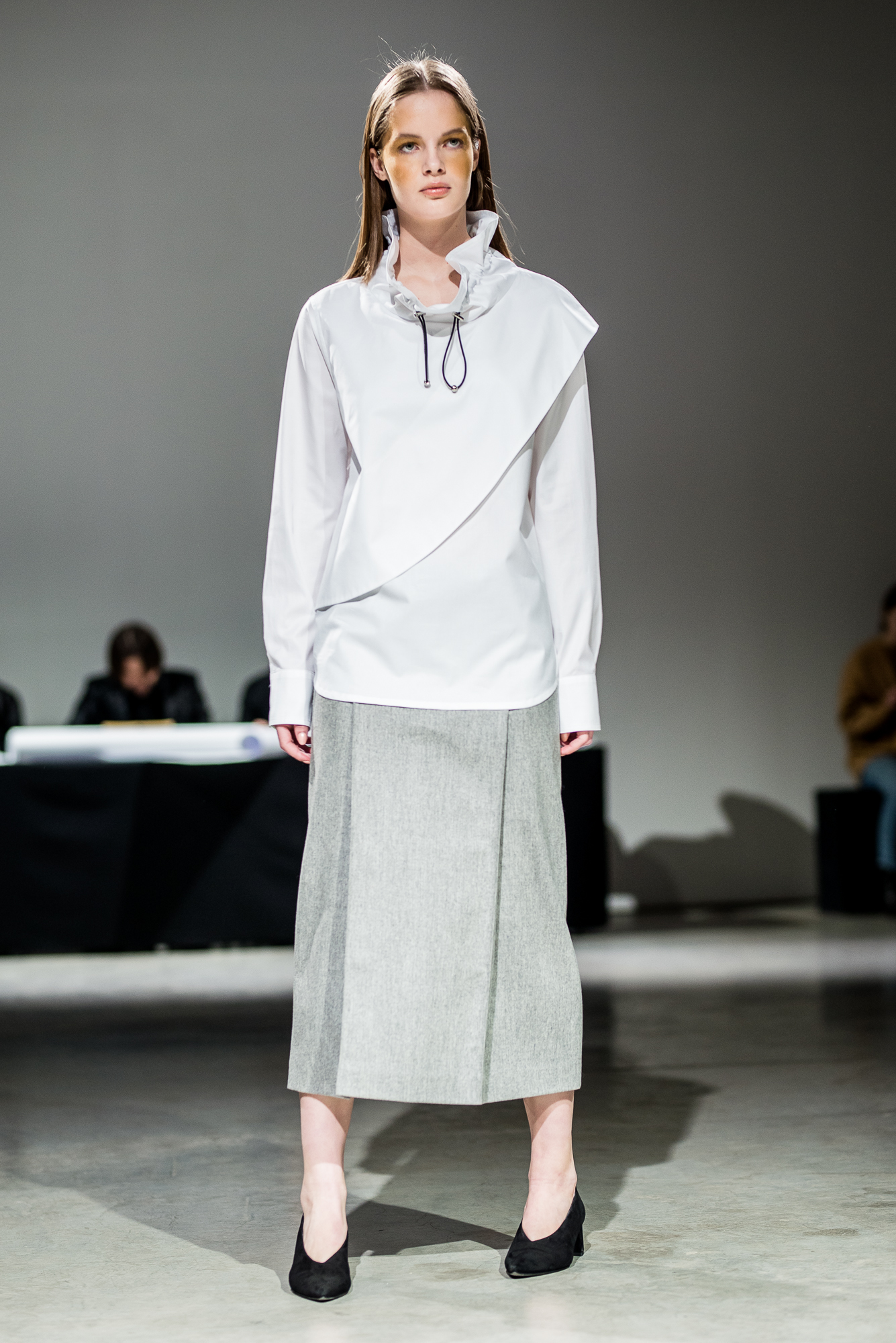 Главная роль в показе была отведена пальто – это сильная сторона Пржонской, и они действительно подкупали сочетанием утилитарности и красоты. Ткань, из которой пошиты пальто, ламинирована и водонепроницаема: что, очевидно, одновременно и практично, и красиво, потому что придавало ей блеск и мерцание, соответствующее теме футуризма. Коллекция Пржонской очень последовательна: дизайнер ничего не бросала на полпути, развивая единожды выбранное направление до конца. Так, взяв за основу косой крой рукава, Елена применяет его сразу в нескольких силуэтах: и в пальто, и в платьях, и в рубашках. Использовав горох в нескольких луках, дизайнер периодически добавляет его в качестве деталей и в других выходах – равно как не оставляет она тему с присобранным горлом и не изменяет длине миди.