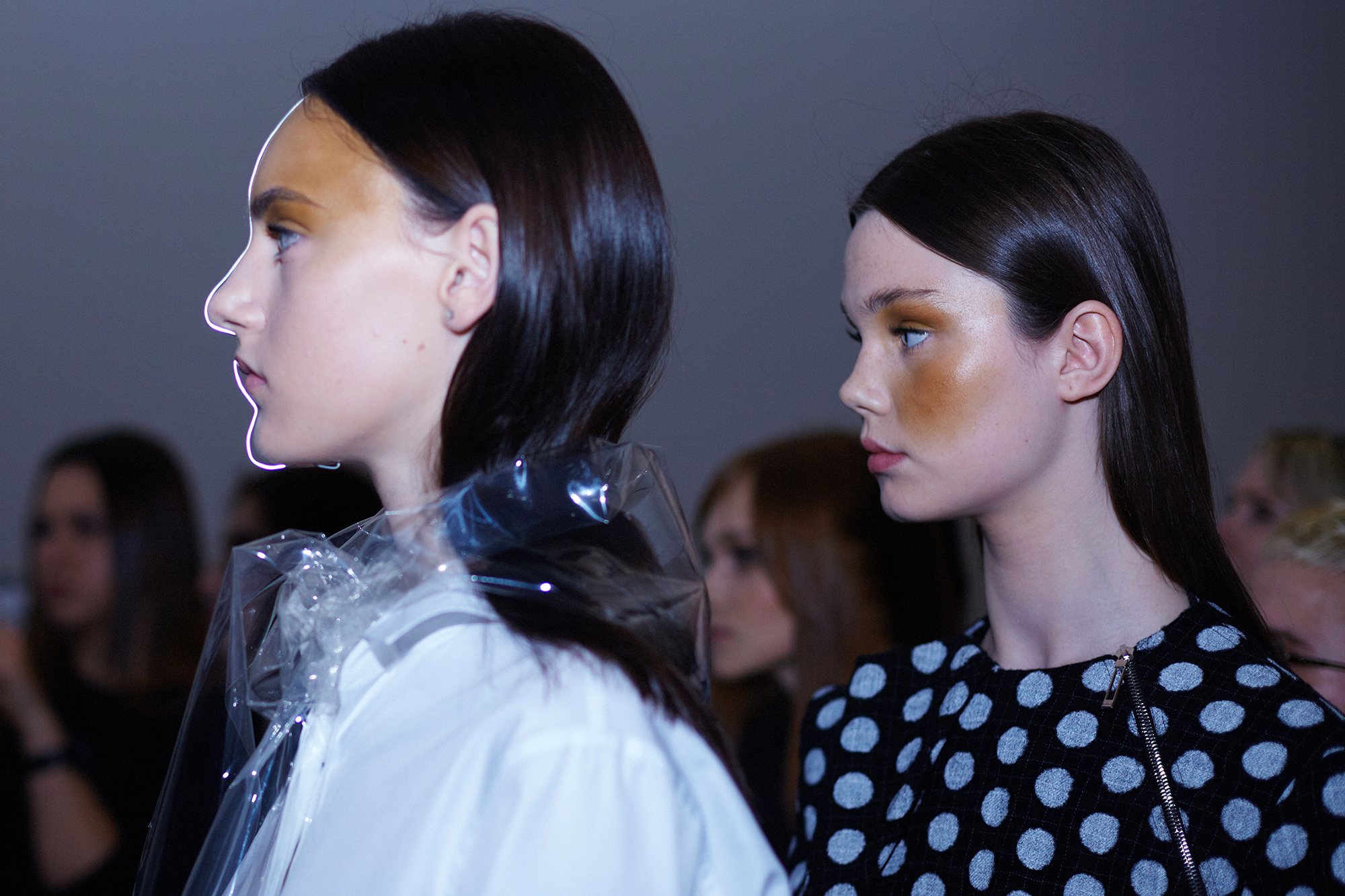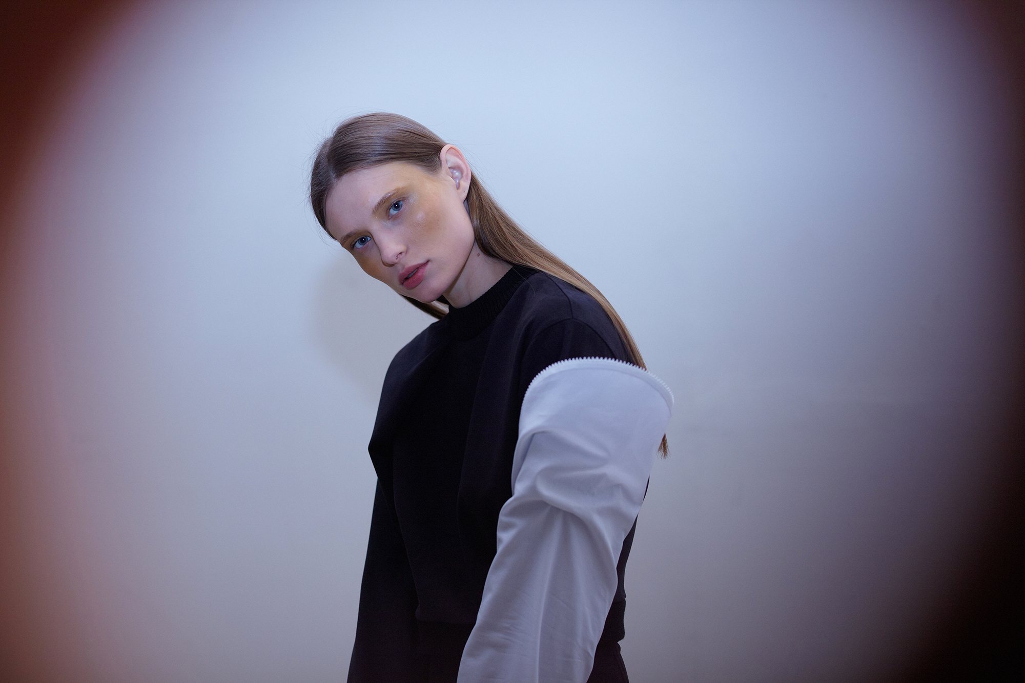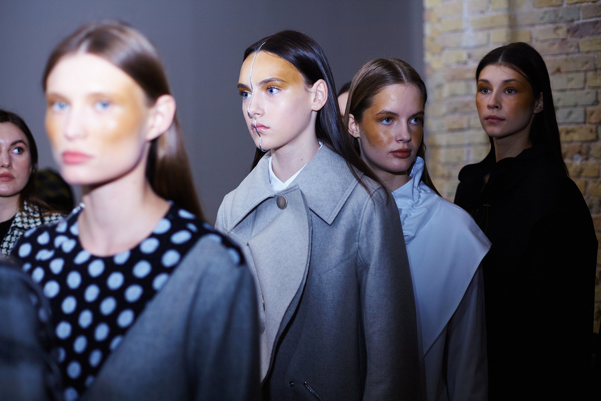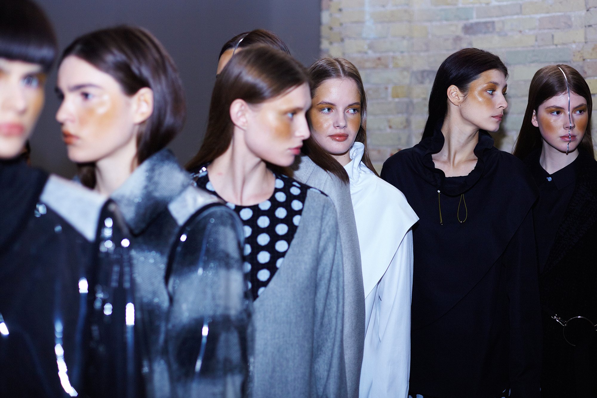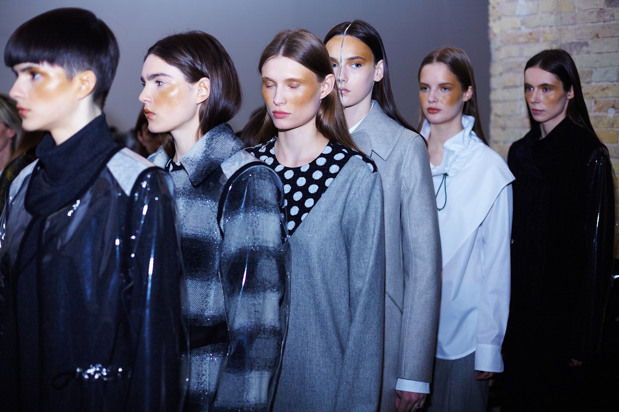 Главная роль в показе была отведена пальто – это сильная сторона Пржонской, и они действительно подкупали сочетанием утилитарности и красоты. Ткань, из которой пошиты пальто, ламинирована и водонепроницаема: что, очевидно, одновременно и практично, и красиво, потому что придавало ей блеск и мерцание, соответствующее теме футуризма. Коллекция Пржонской очень последовательна: дизайнер ничего не бросала на полпути, развивая единожды выбранное направление до конца. Так, взяв за основу косой крой рукава, Елена применяет его сразу в нескольких силуэтах: и в пальто, и в платьях, и в рубашках. Использовав горох в нескольких луках, дизайнер периодически добавляет его в качестве деталей и в других выходах – равно как не оставляет она тему с присобранным горлом и не изменяет длине миди.
