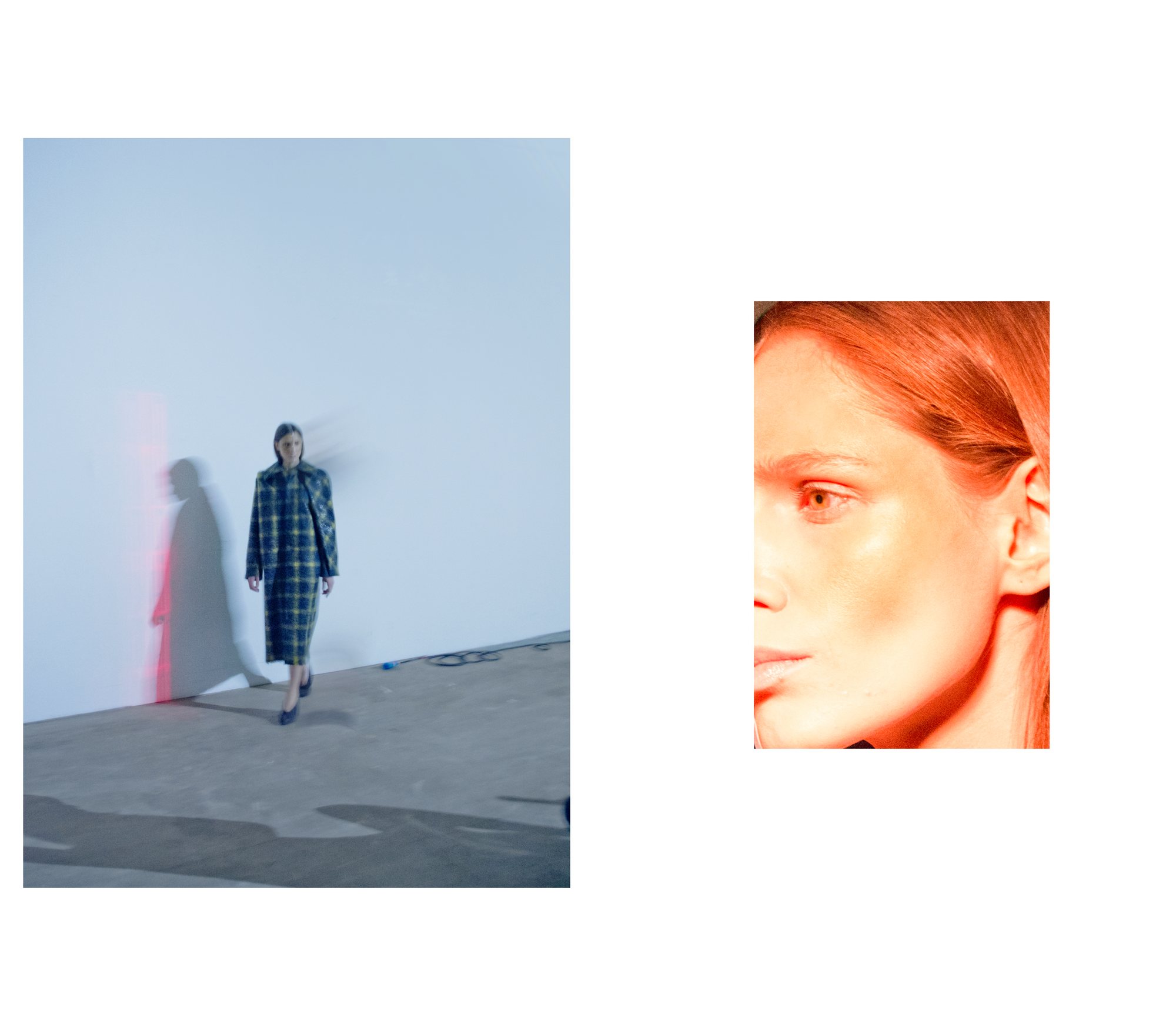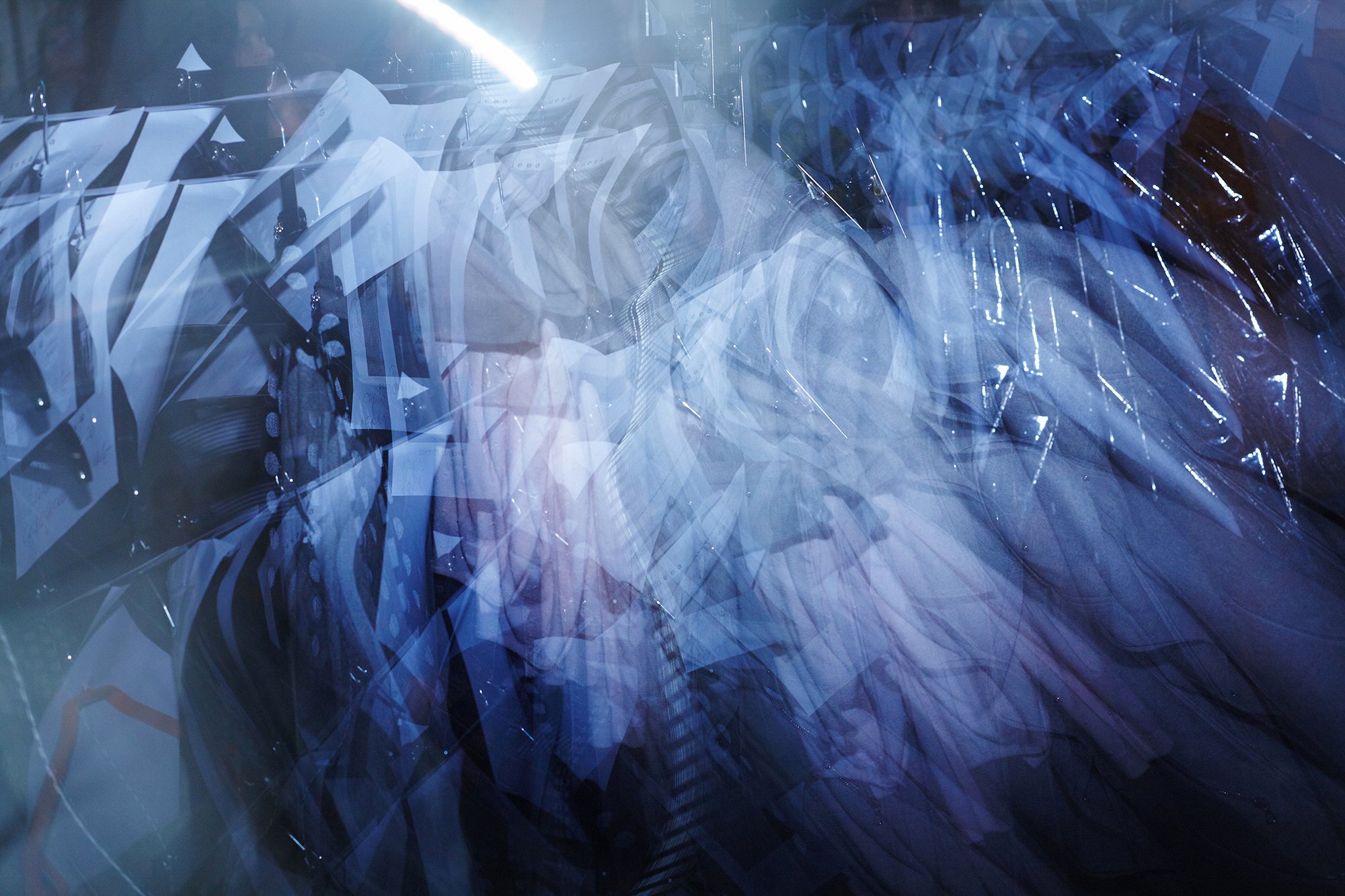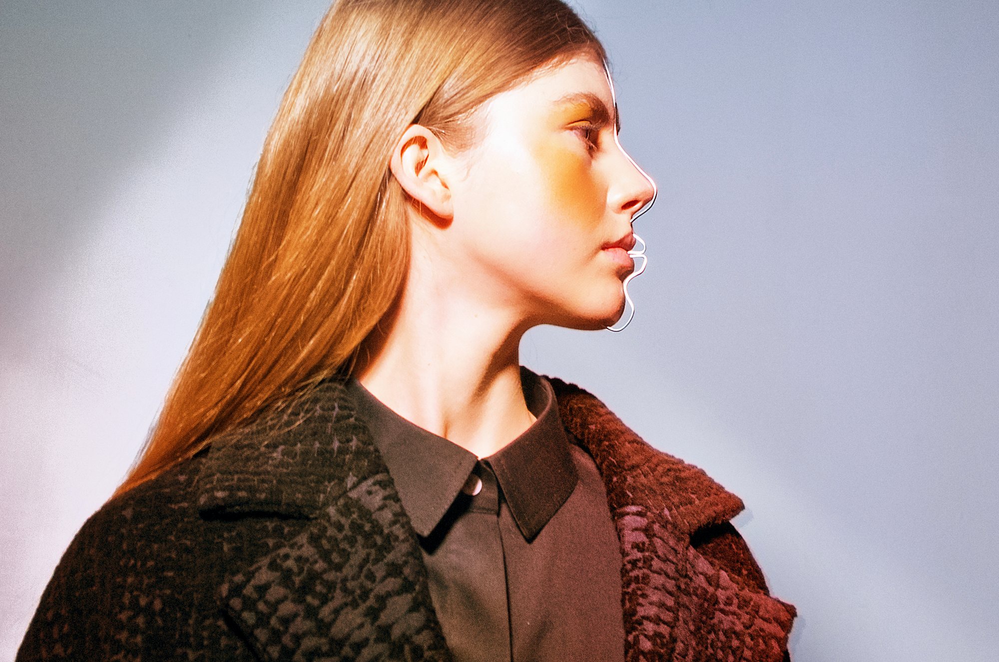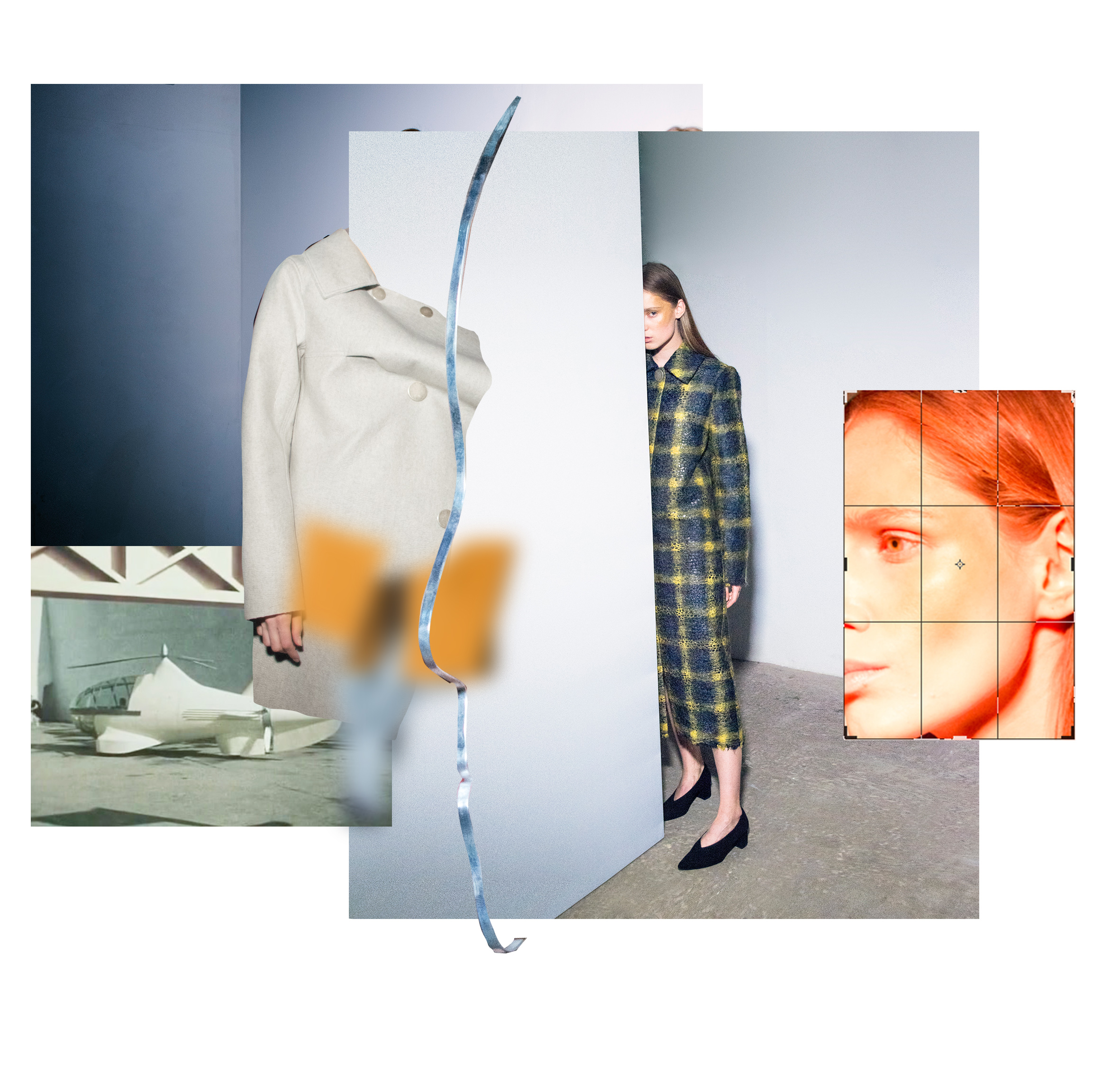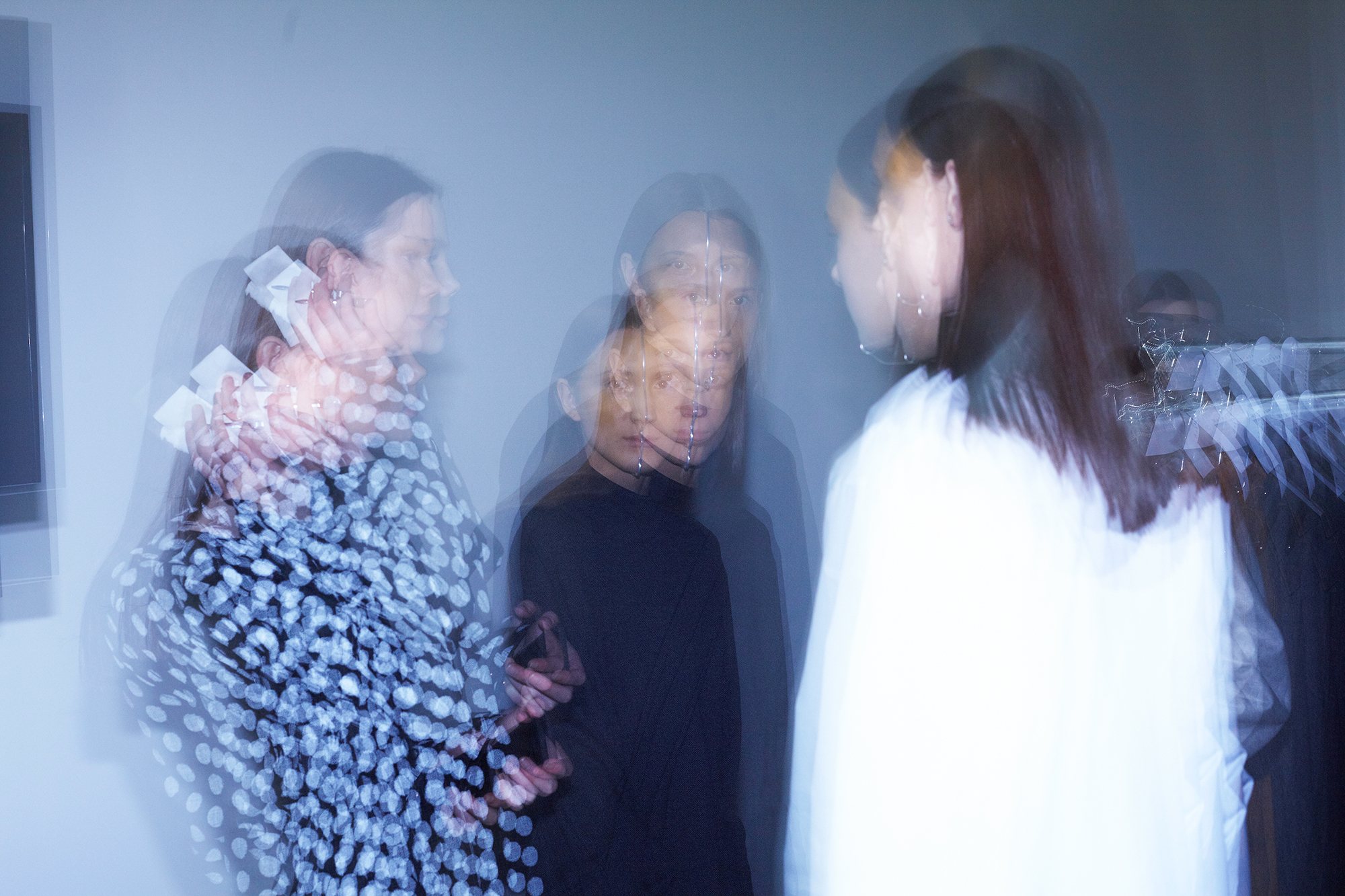 Главная роль в показе была отведена пальто – это сильная сторона Пржонской, и они действительно подкупали сочетанием утилитарности и красоты. Ткань, из которой пошиты пальто, ламинирована и водонепроницаема: что, очевидно, одновременно и практично, и красиво, потому что придавало ей блеск и мерцание, соответствующее теме футуризма. Коллекция Пржонской очень последовательна: дизайнер ничего не бросала на полпути, развивая единожды выбранное направление до конца. Так, взяв за основу косой крой рукава, Елена применяет его сразу в нескольких силуэтах: и в пальто, и в платьях, и в рубашках. Использовав горох в нескольких луках, дизайнер периодически добавляет его в качестве деталей и в других выходах – равно как не оставляет она тему с присобранным горлом и не изменяет длине миди.