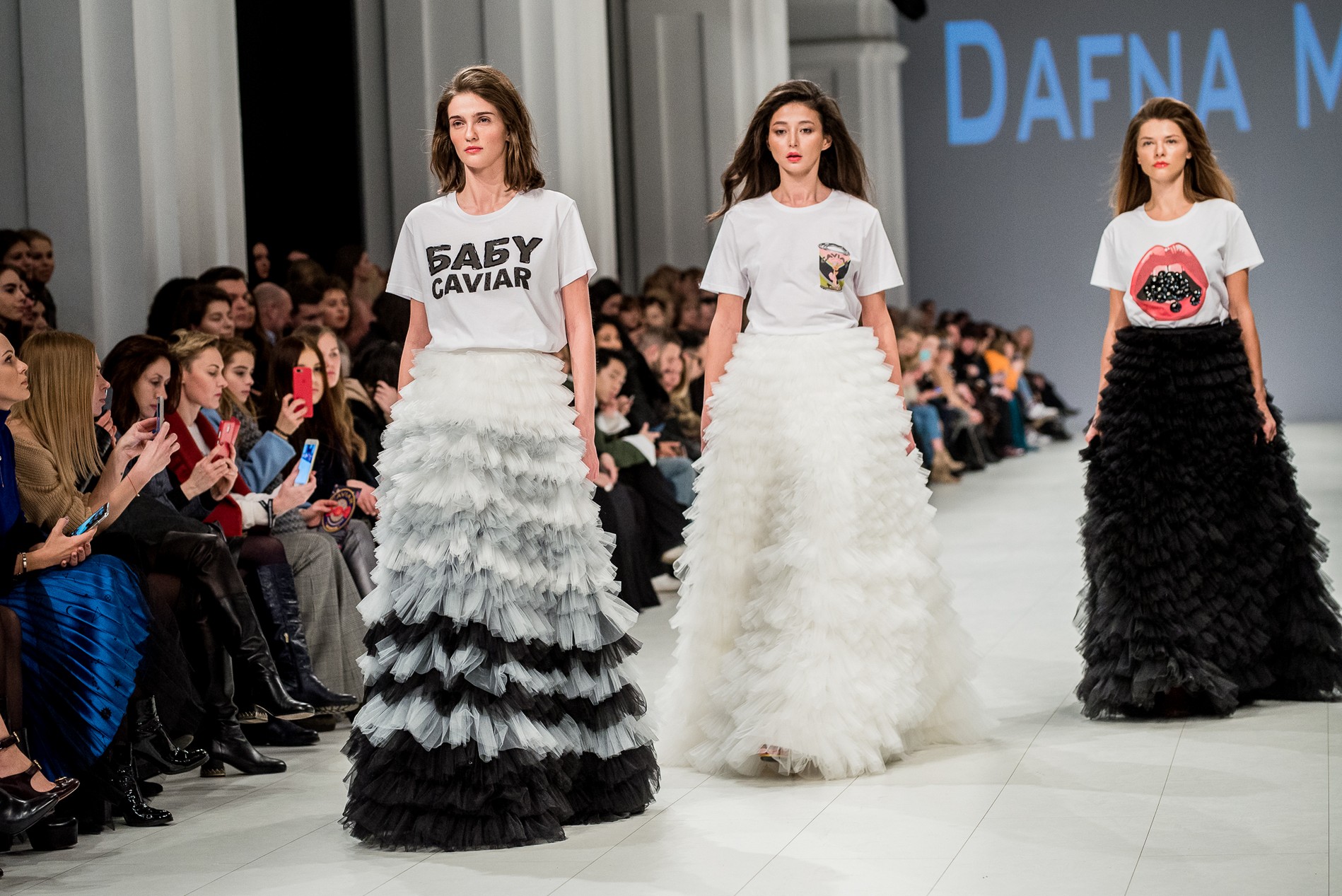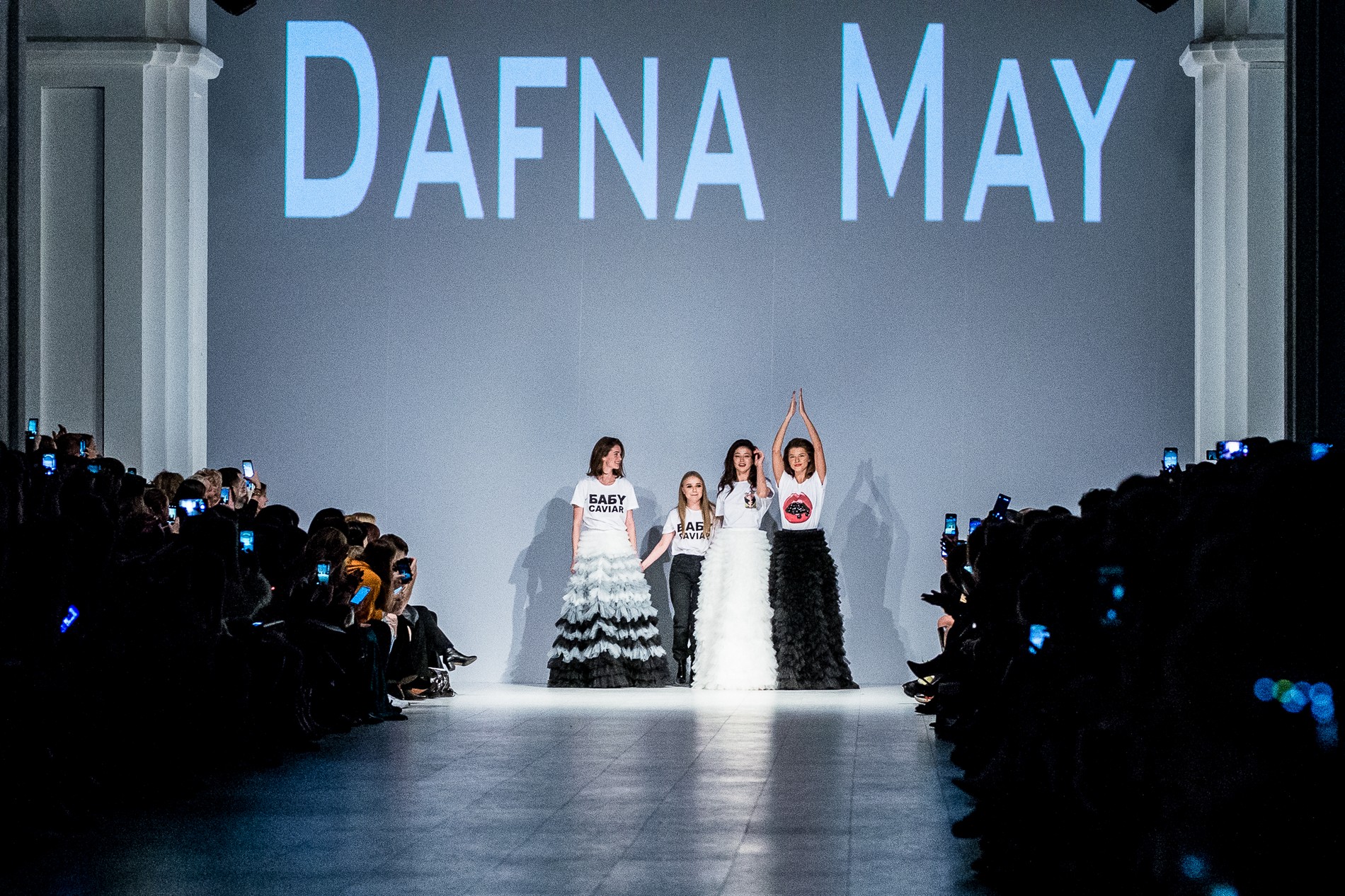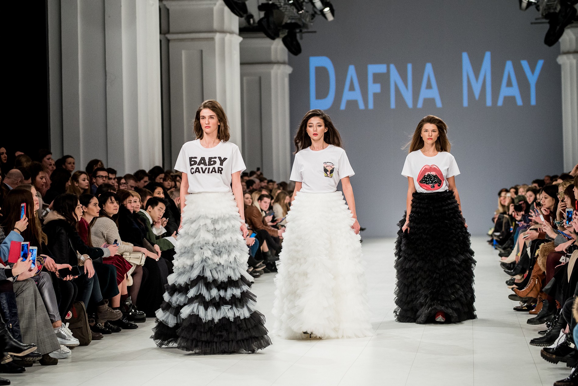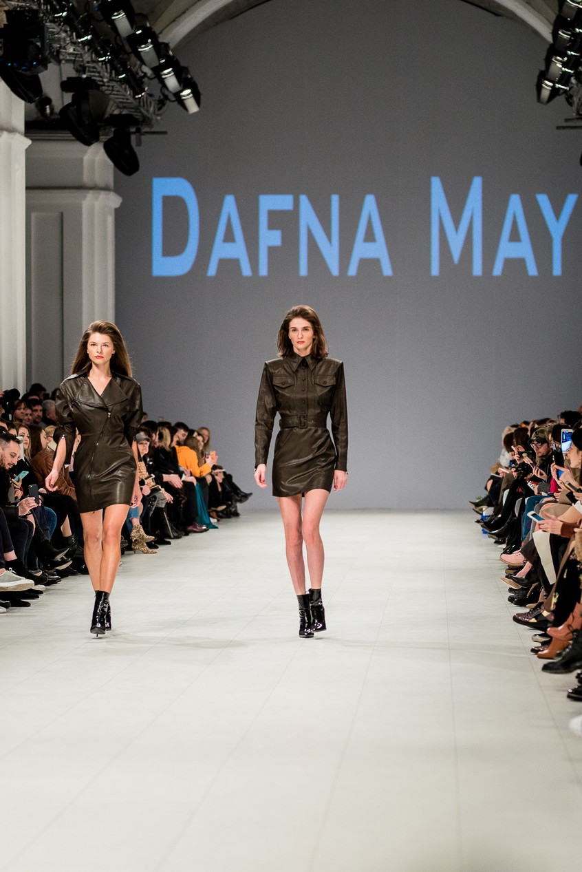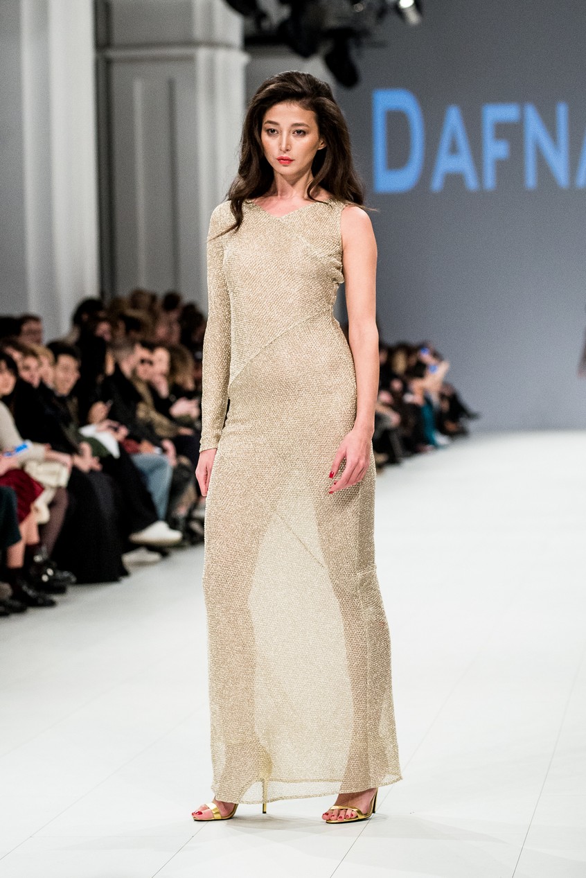 Дафна Майберг, дизайнер бренда Dafna May, устроила в Мыстецком Арсенале свою версию показа Versace: ее шоу завершилось триумфальным выходом украинских моделей Эллы Кандыбы, Эвелины Мамбетовой и Юлианы Дементьевой. Девушки появились на подиуме в футболках с остроумным принтом с черной икрой и в многослойных юбках, объединяя кутюрные и «масс-маркетовые» приемы.