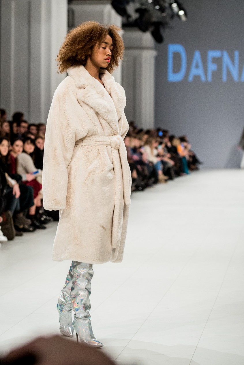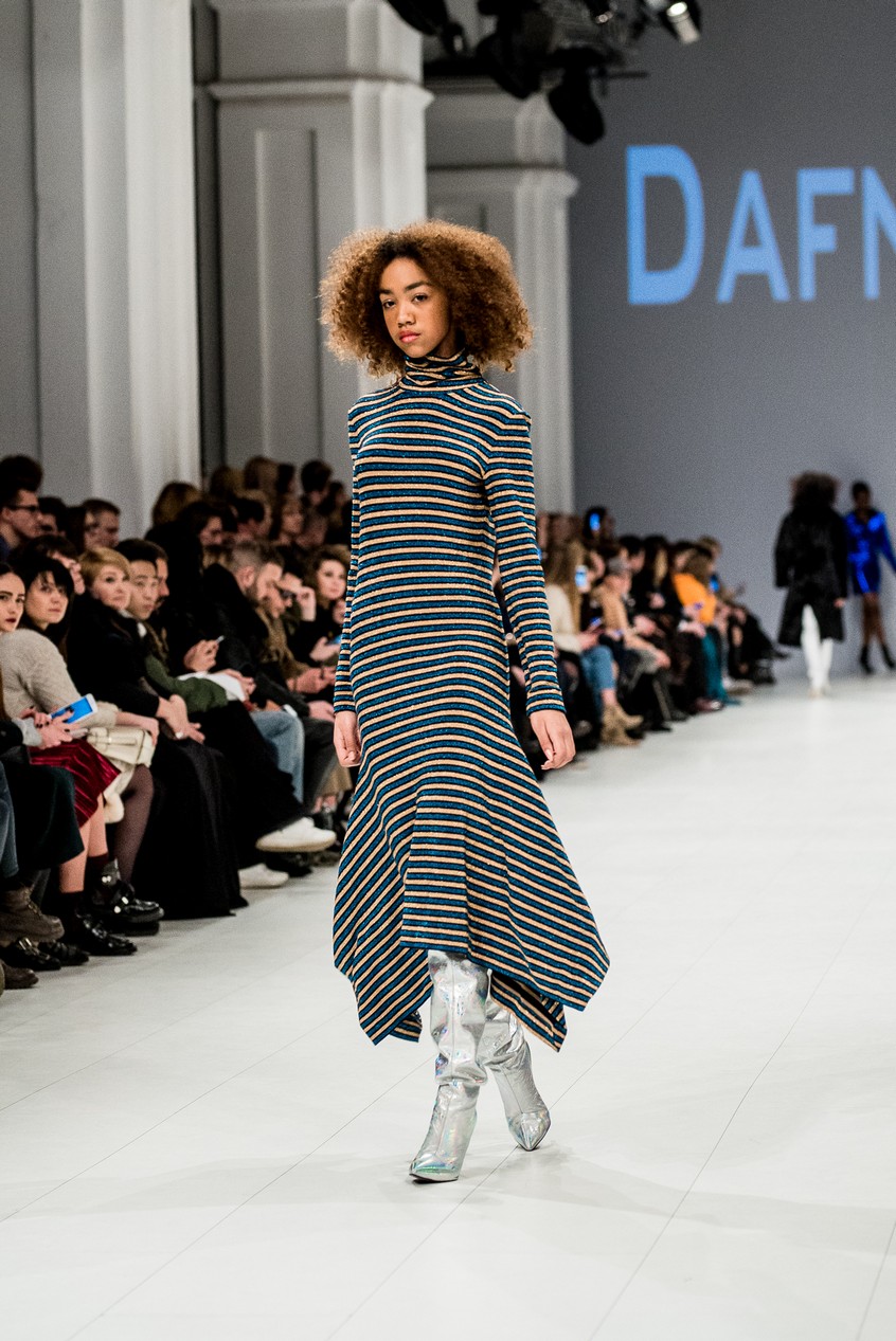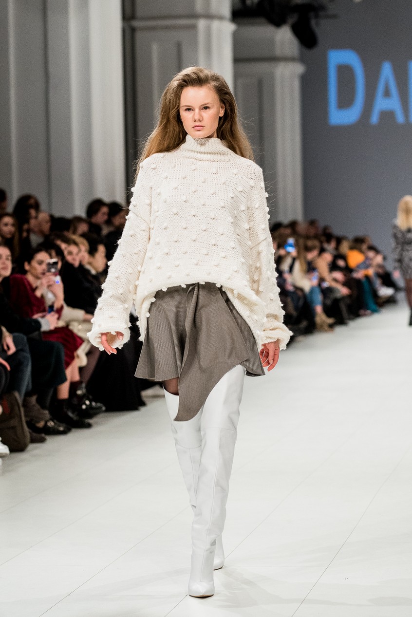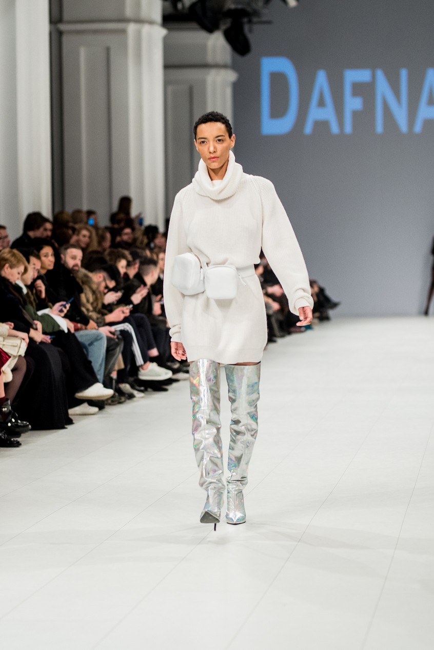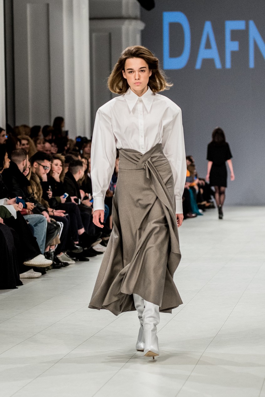 Дафна Майберг, дизайнер бренда Dafna May, устроила в Мыстецком Арсенале свою версию показа Versace: ее шоу завершилось триумфальным выходом украинских моделей Эллы Кандыбы, Эвелины Мамбетовой и Юлианы Дементьевой. Девушки появились на подиуме в футболках с остроумным принтом с черной икрой и в многослойных юбках, объединяя кутюрные и «масс-маркетовые» приемы.