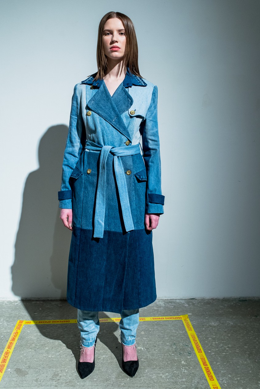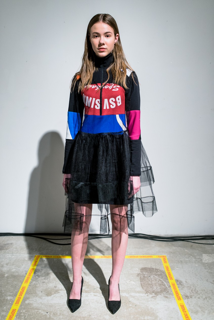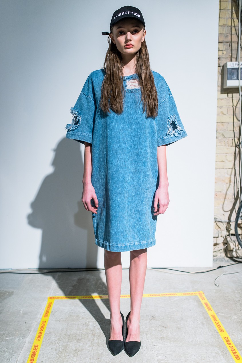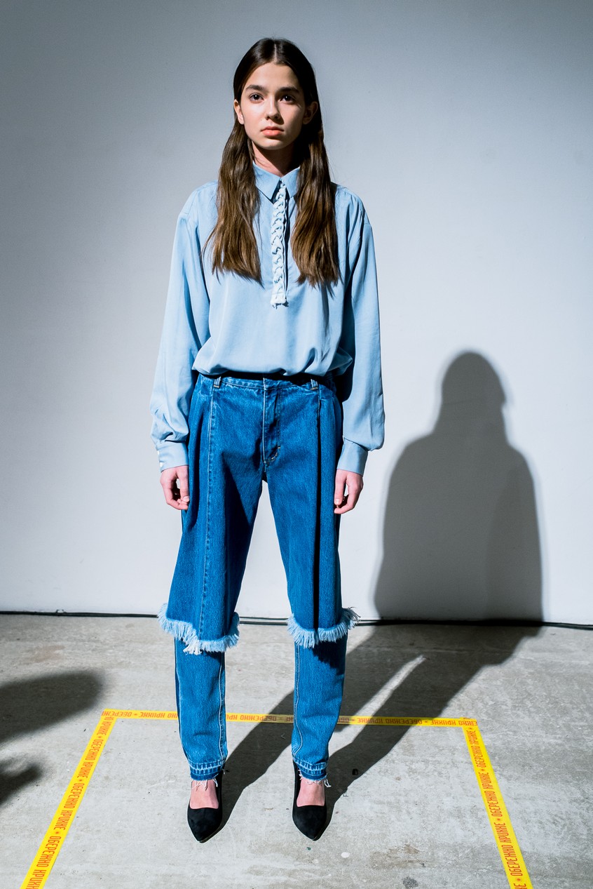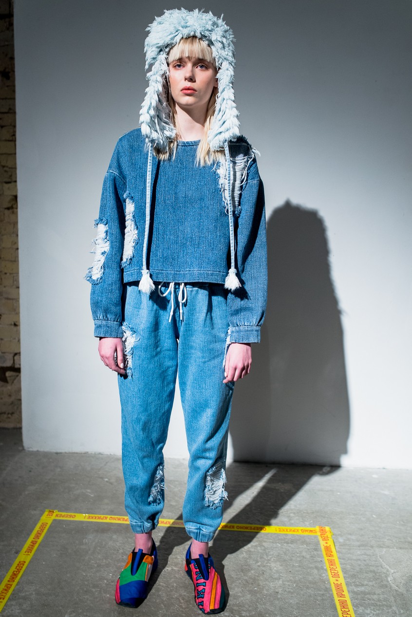 Презентация новой коллекции Ksenia Schnaider прошла в правом крыле Мыстецкого Арсенала. Модели примерили на себя роль объектов искусства – каждая из них была ограждена квадратом из желтой линии с подписью «Обережно: крихке». Ксения продолжает размышлять на тему актуальной уличной одежды: в ее коллекции – только удобные и практичные вещи, оттененные яркими цветами. Дизайнер не забывает о главных составляющих ДНК своего бренда: спортивные детали, колорблокинг и деним – в коллекцию вошли худи с ироничными принтами вроде Not Available In Your Country, юбки, жакеты, платья из денима – из этого материала дизайнер представила даже шапку и аксессуар для волос, не забыв, конечно, о джинсах demi-denims. Свое увлечение экомодой дизайнер тоже продолжает развивать: кроме recycled-вещей, в ее коллекции появилась шуба из экологического меха – напомним, ранее Ксения выпускала модель из денима.