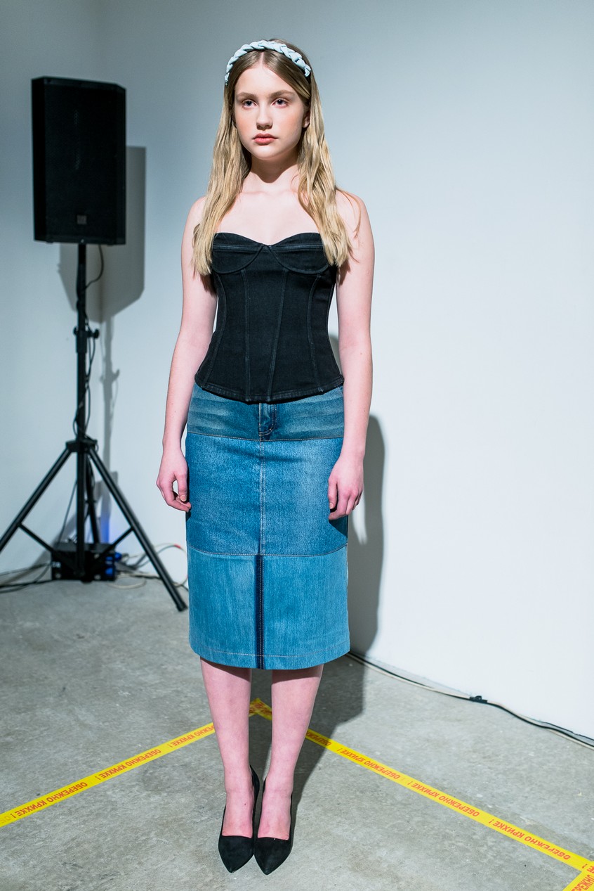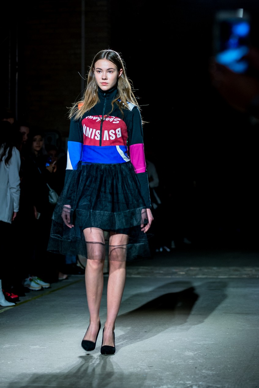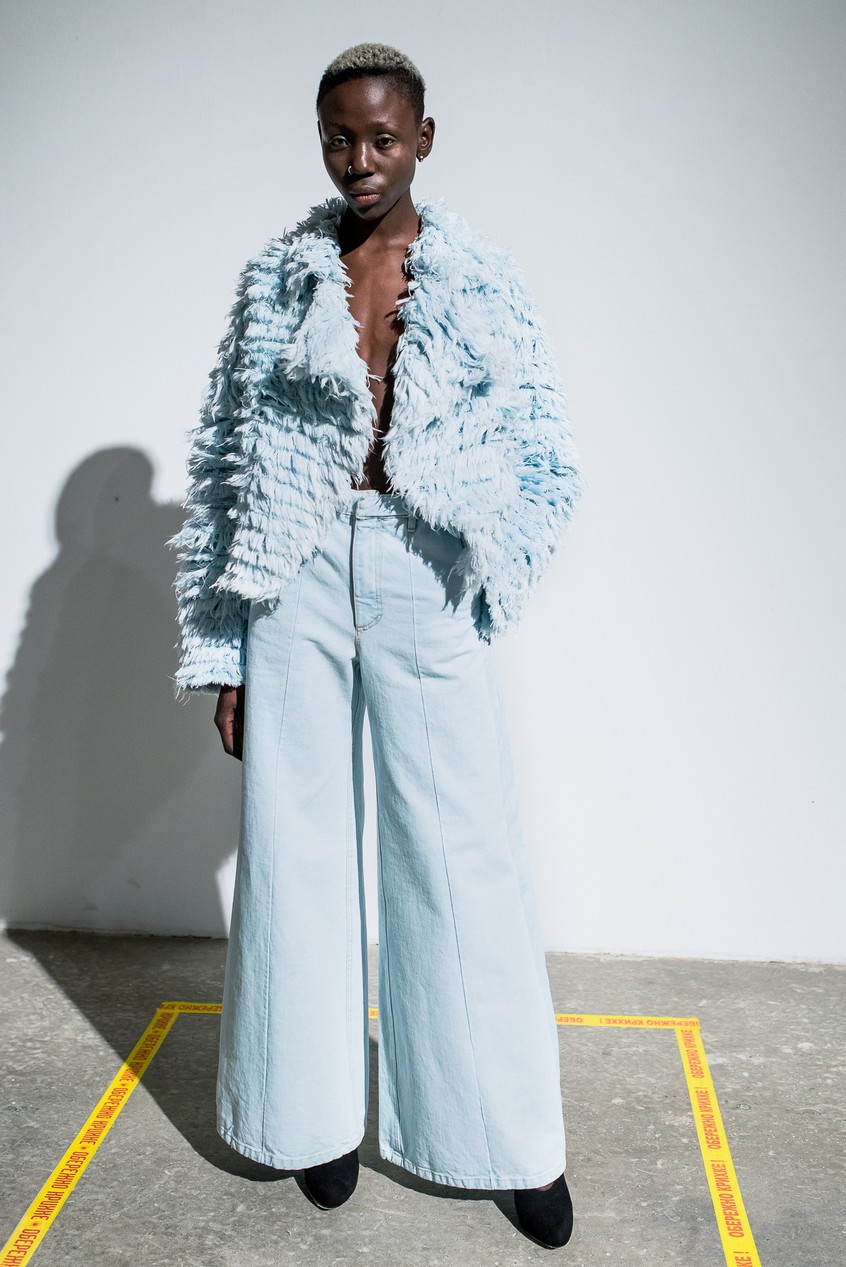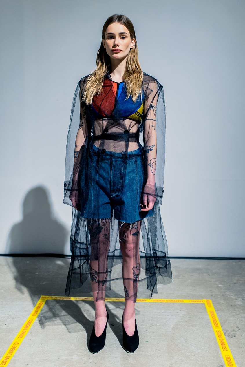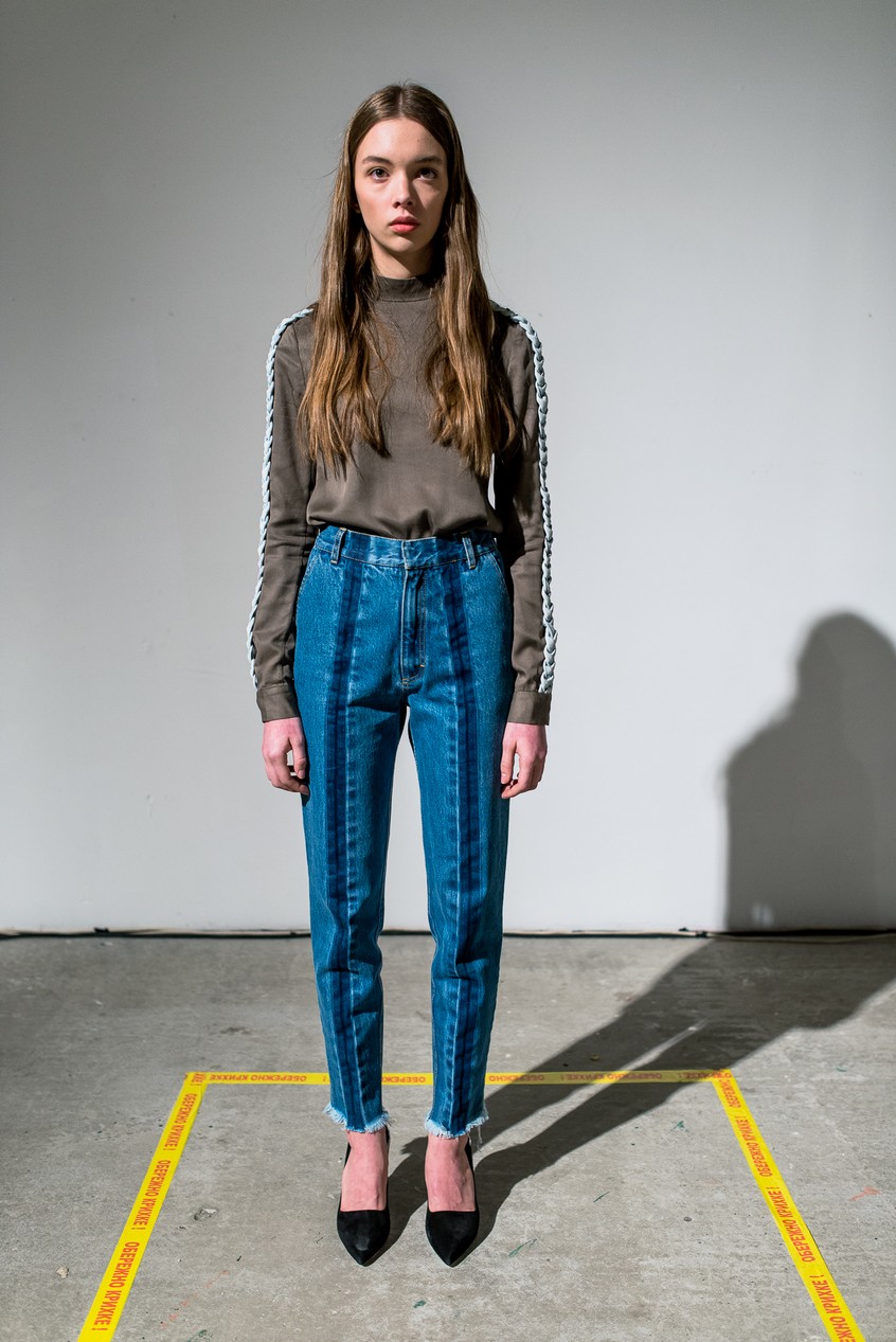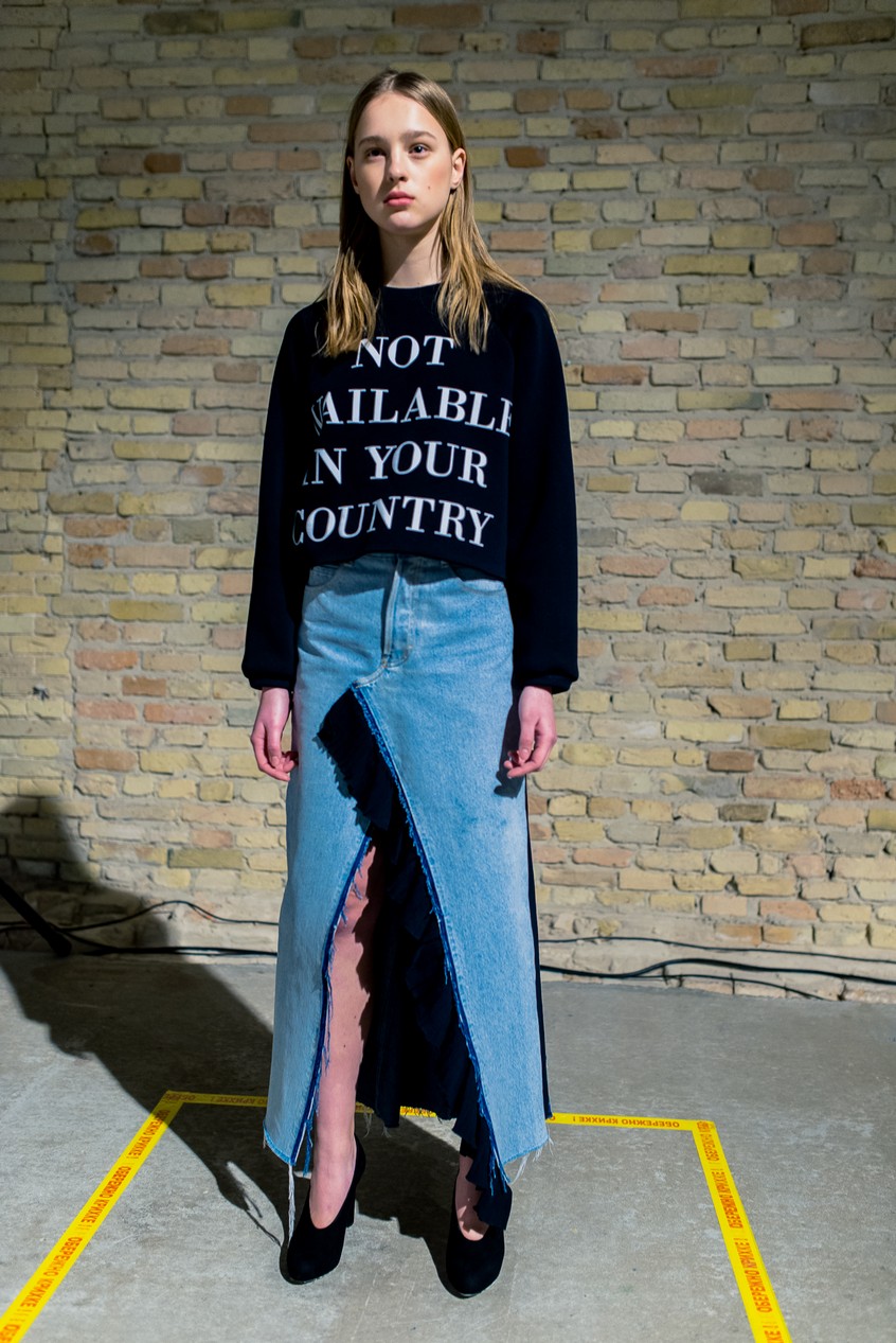 Презентация новой коллекции Ksenia Schnaider прошла в правом крыле Мыстецкого Арсенала. Модели примерили на себя роль объектов искусства – каждая из них была ограждена квадратом из желтой линии с подписью «Обережно: крихке». Ксения продолжает размышлять на тему актуальной уличной одежды: в ее коллекции – только удобные и практичные вещи, оттененные яркими цветами. Дизайнер не забывает о главных составляющих ДНК своего бренда: спортивные детали, колорблокинг и деним – в коллекцию вошли худи с ироничными принтами вроде Not Available In Your Country, юбки, жакеты, платья из денима – из этого материала дизайнер представила даже шапку и аксессуар для волос, не забыв, конечно, о джинсах demi-denims. Свое увлечение экомодой дизайнер тоже продолжает развивать: кроме recycled-вещей, в ее коллекции появилась шуба из экологического меха – напомним, ранее Ксения выпускала модель из денима.