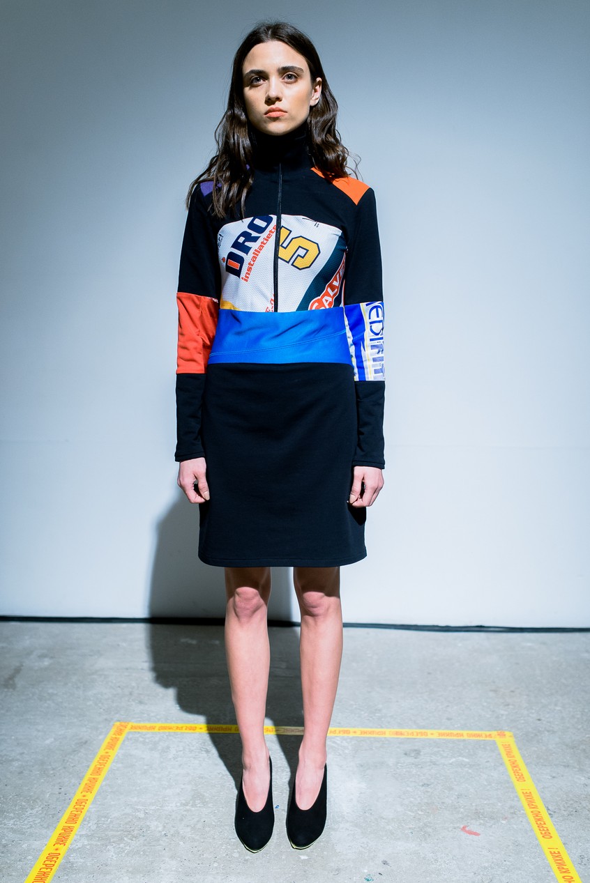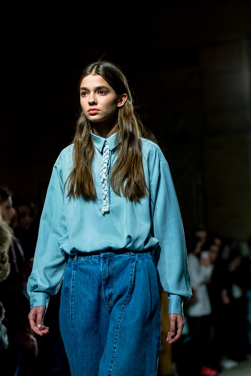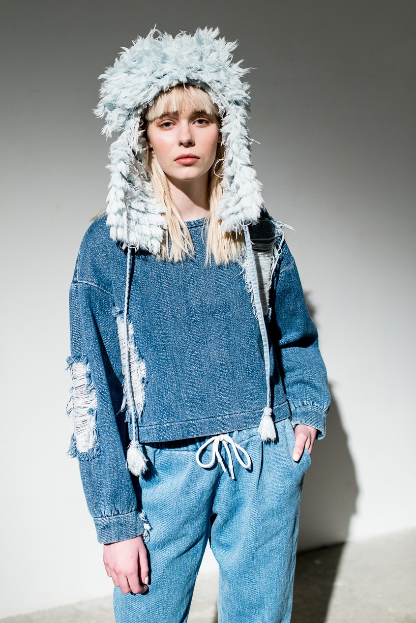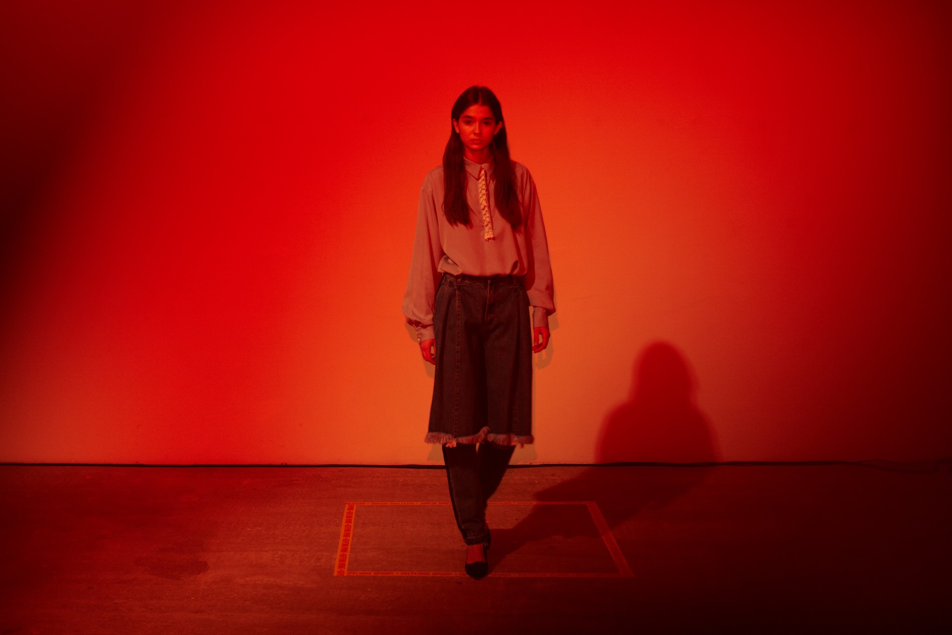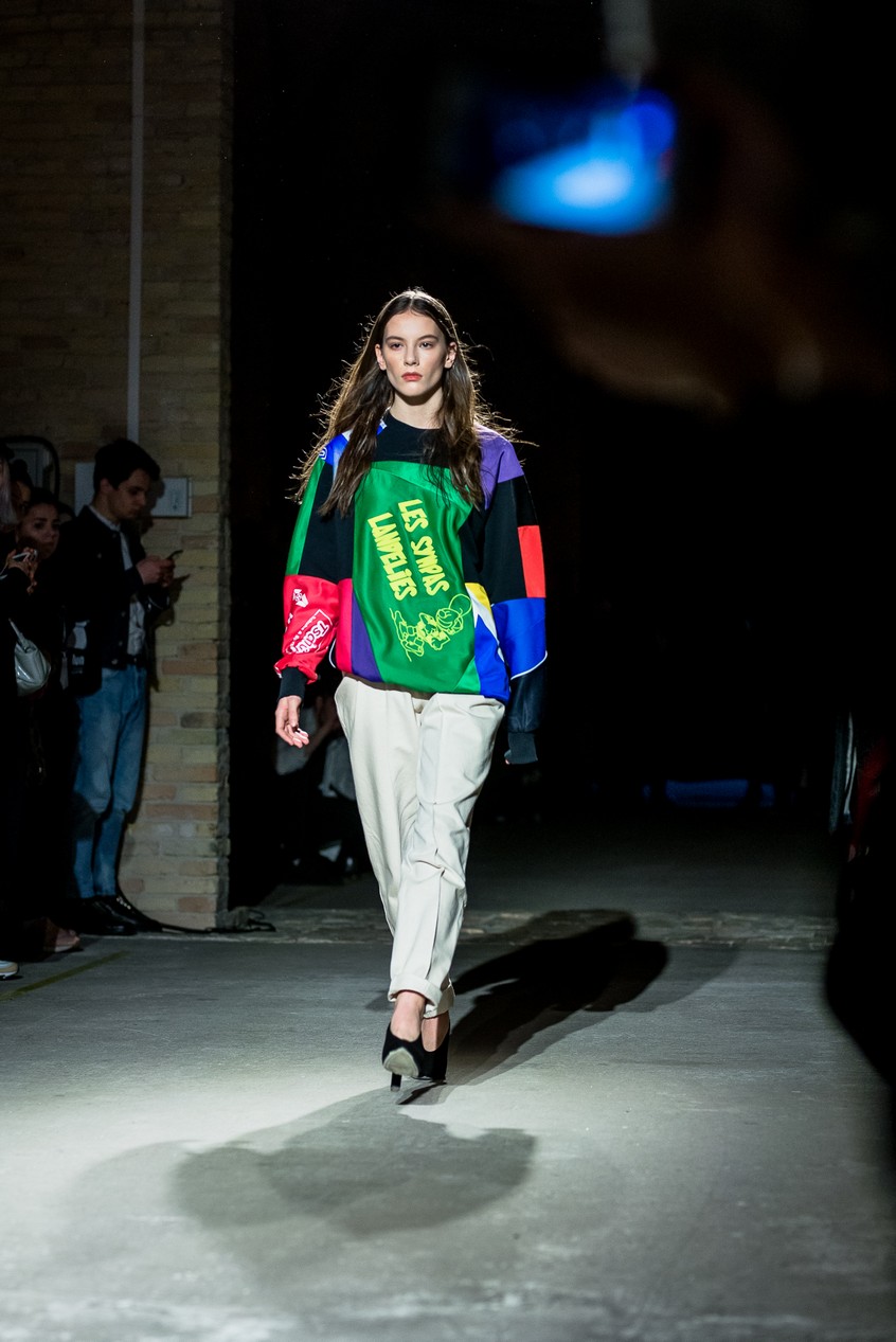 Презентация новой коллекции Ksenia Schnaider прошла в правом крыле Мыстецкого Арсенала. Модели примерили на себя роль объектов искусства – каждая из них была ограждена квадратом из желтой линии с подписью «Обережно: крихке». Ксения продолжает размышлять на тему актуальной уличной одежды: в ее коллекции – только удобные и практичные вещи, оттененные яркими цветами. Дизайнер не забывает о главных составляющих ДНК своего бренда: спортивные детали, колорблокинг и деним – в коллекцию вошли худи с ироничными принтами вроде Not Available In Your Country, юбки, жакеты, платья из денима – из этого материала дизайнер представила даже шапку и аксессуар для волос, не забыв, конечно, о джинсах demi-denims. Свое увлечение экомодой дизайнер тоже продолжает развивать: кроме recycled-вещей, в ее коллекции появилась шуба из экологического меха – напомним, ранее Ксения выпускала модель из денима.