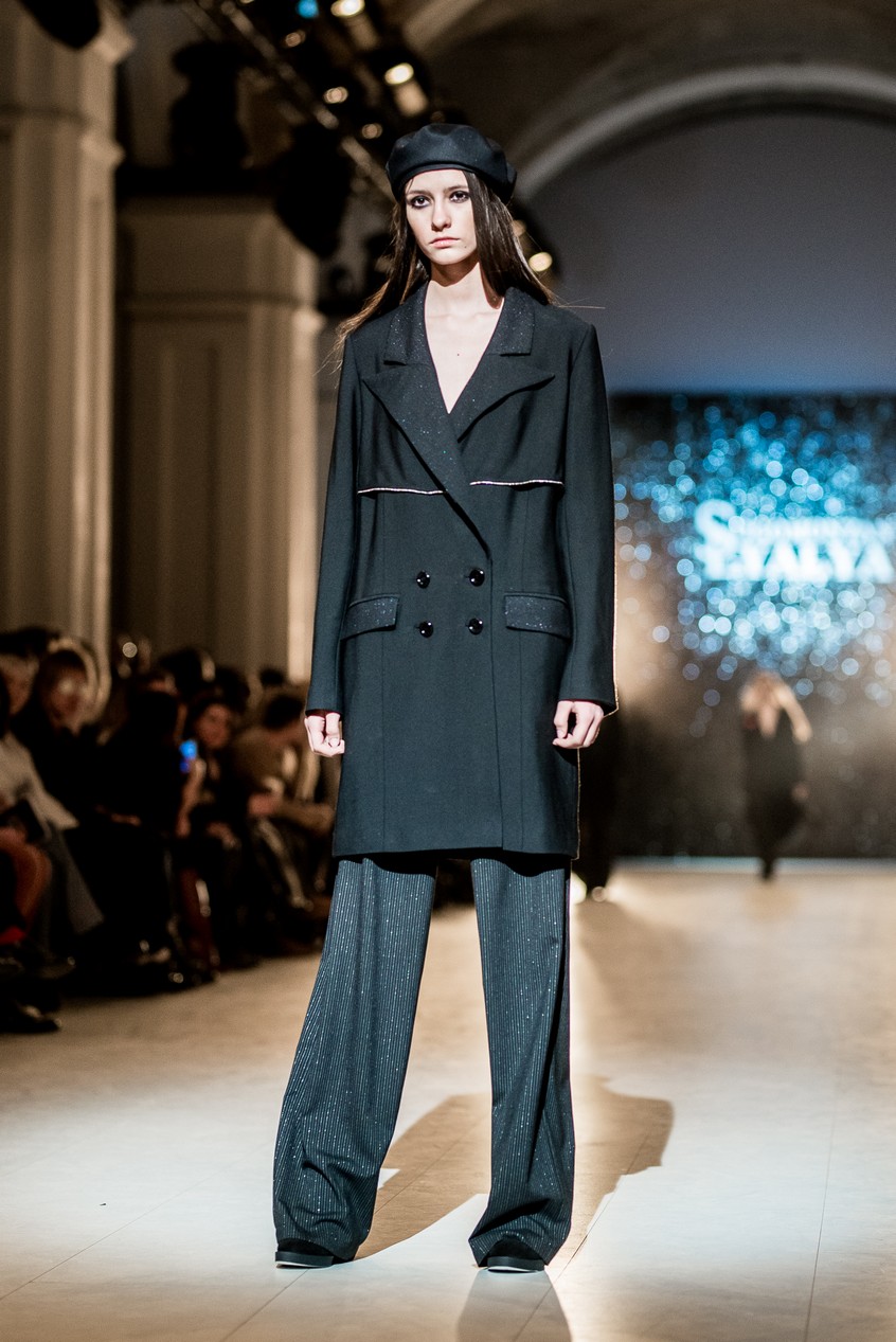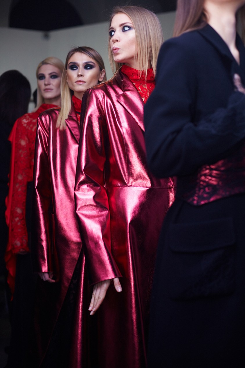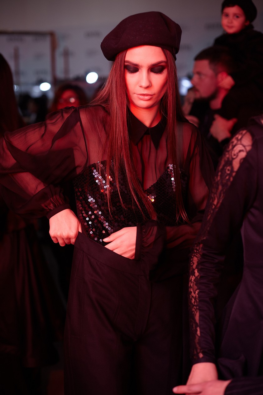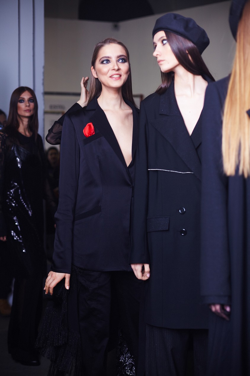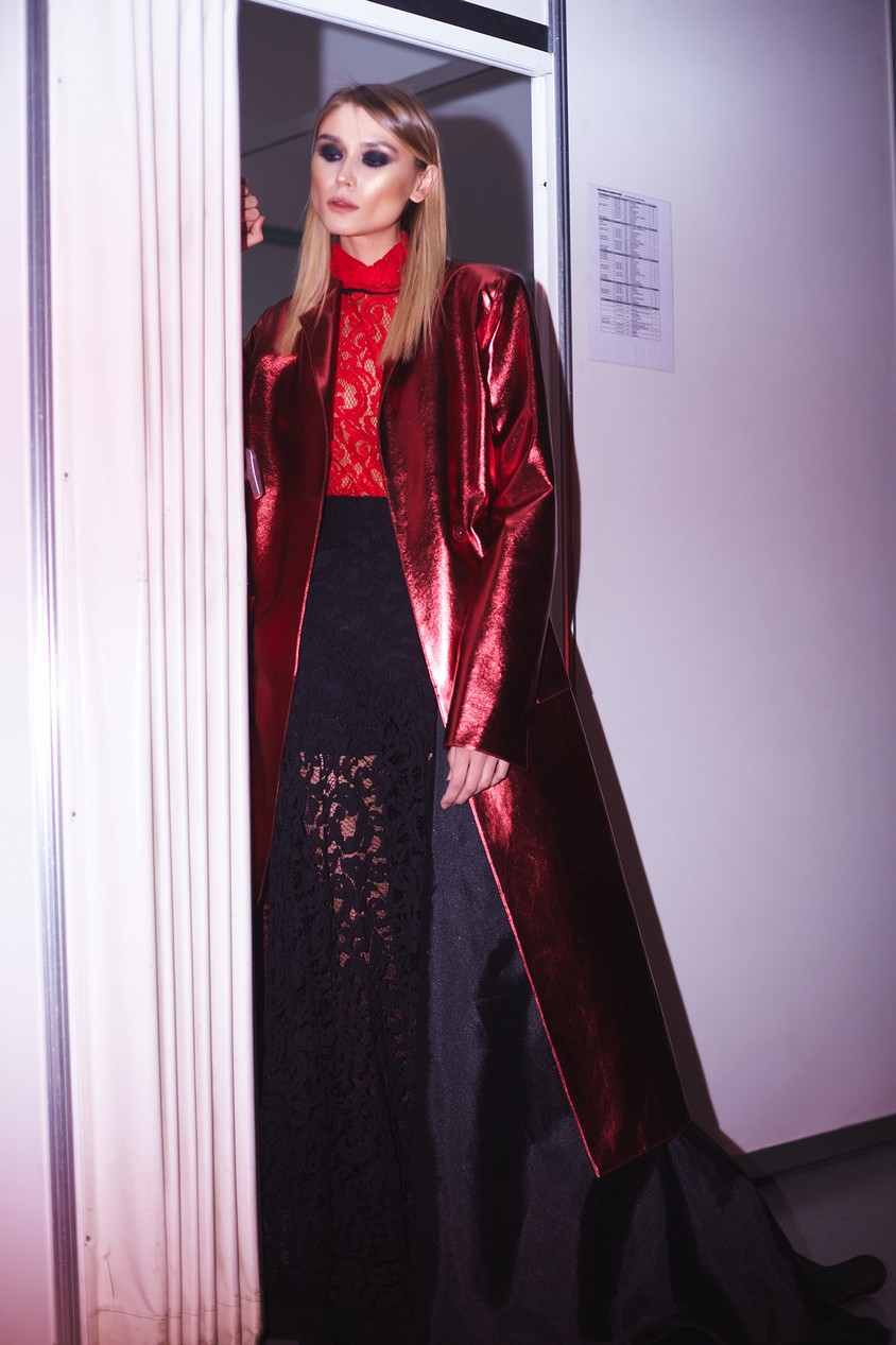 Выйти на улицу в платье, скорее напоминающем пиджак, или в полупрозрачной блузке, строгой деловой юбке и виниловом тренче — не проблема для героини Ляли. Главное — не забыть милую шляпку или берет. Дизайнер, будто вспоминая роман Стендаля «Красное и черное», посвящает этой комбинации цветов всю коллекцию. Так она проводит параллель между сильным характером и женственностью.