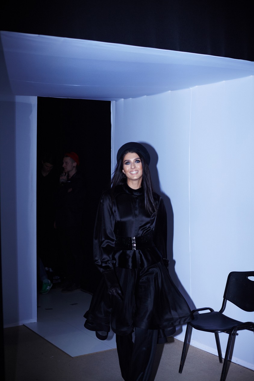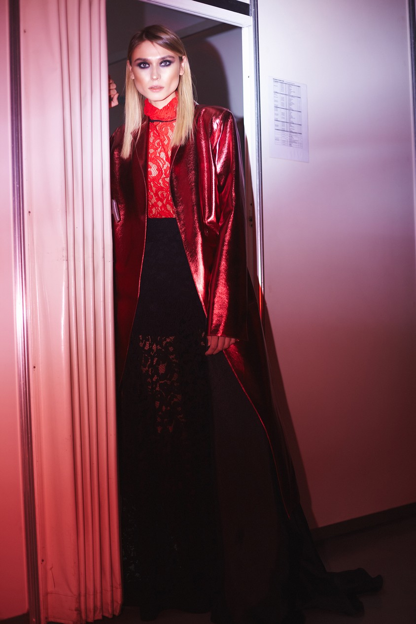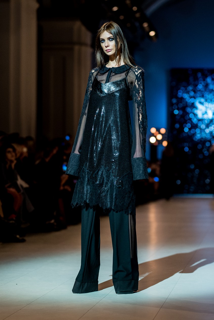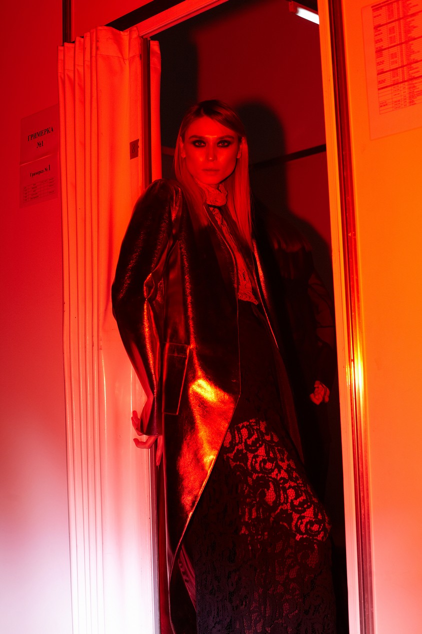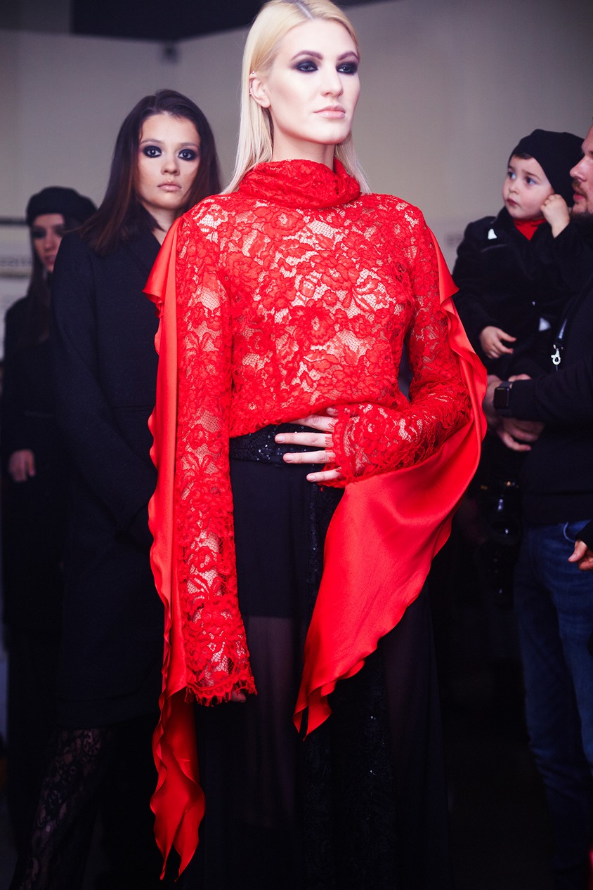 Выйти на улицу в платье, скорее напоминающем пиджак, или в полупрозрачной блузке, строгой деловой юбке и виниловом тренче — не проблема для героини Ляли. Главное — не забыть милую шляпку или берет. Дизайнер, будто вспоминая роман Стендаля «Красное и черное», посвящает этой комбинации цветов всю коллекцию. Так она проводит параллель между сильным характером и женственностью.