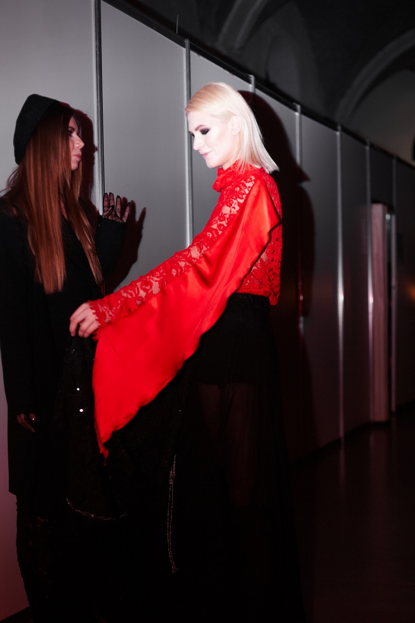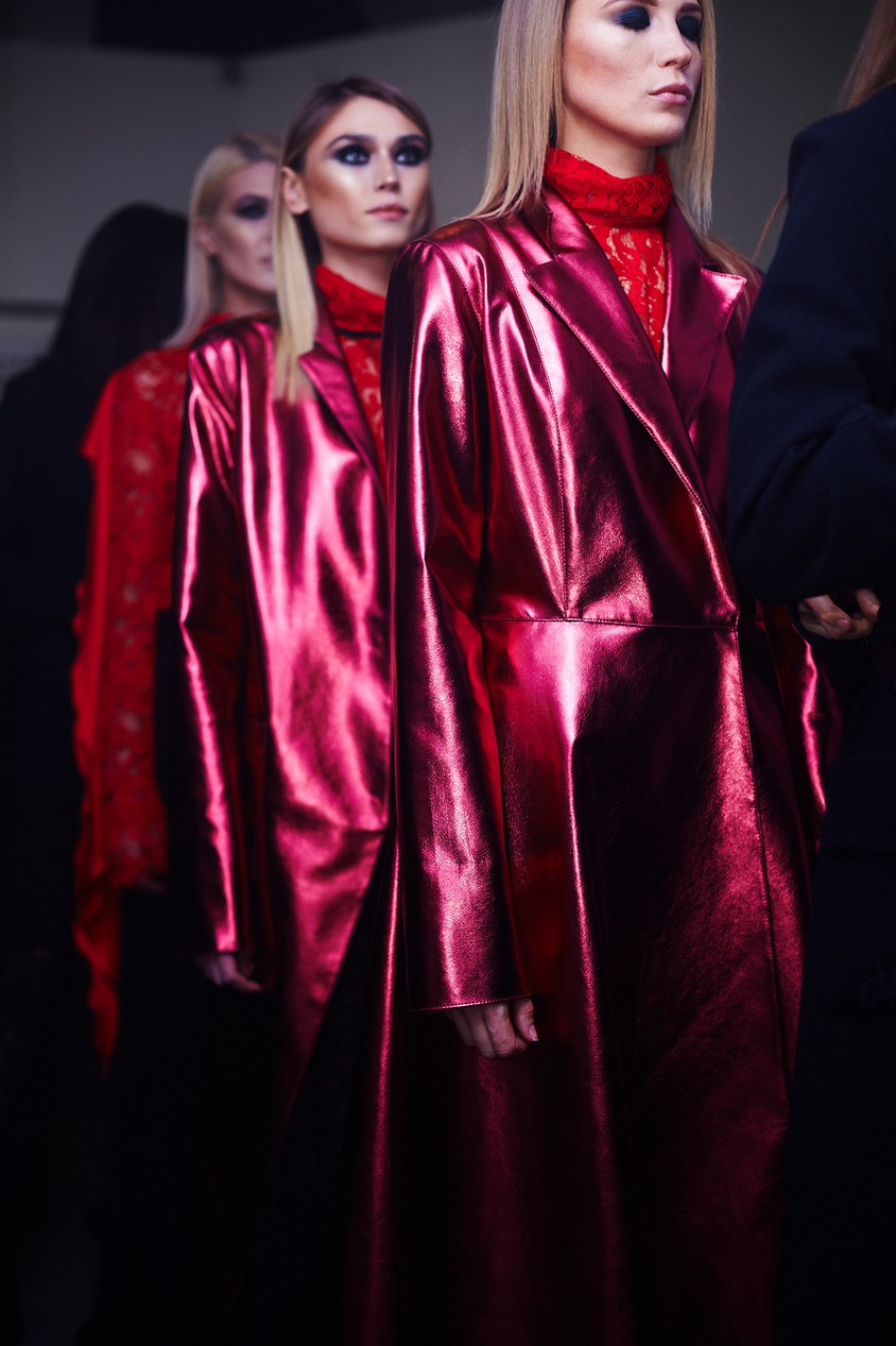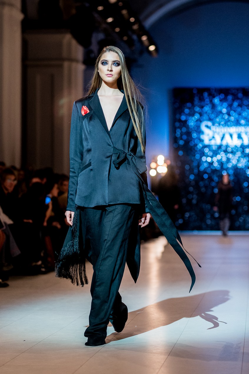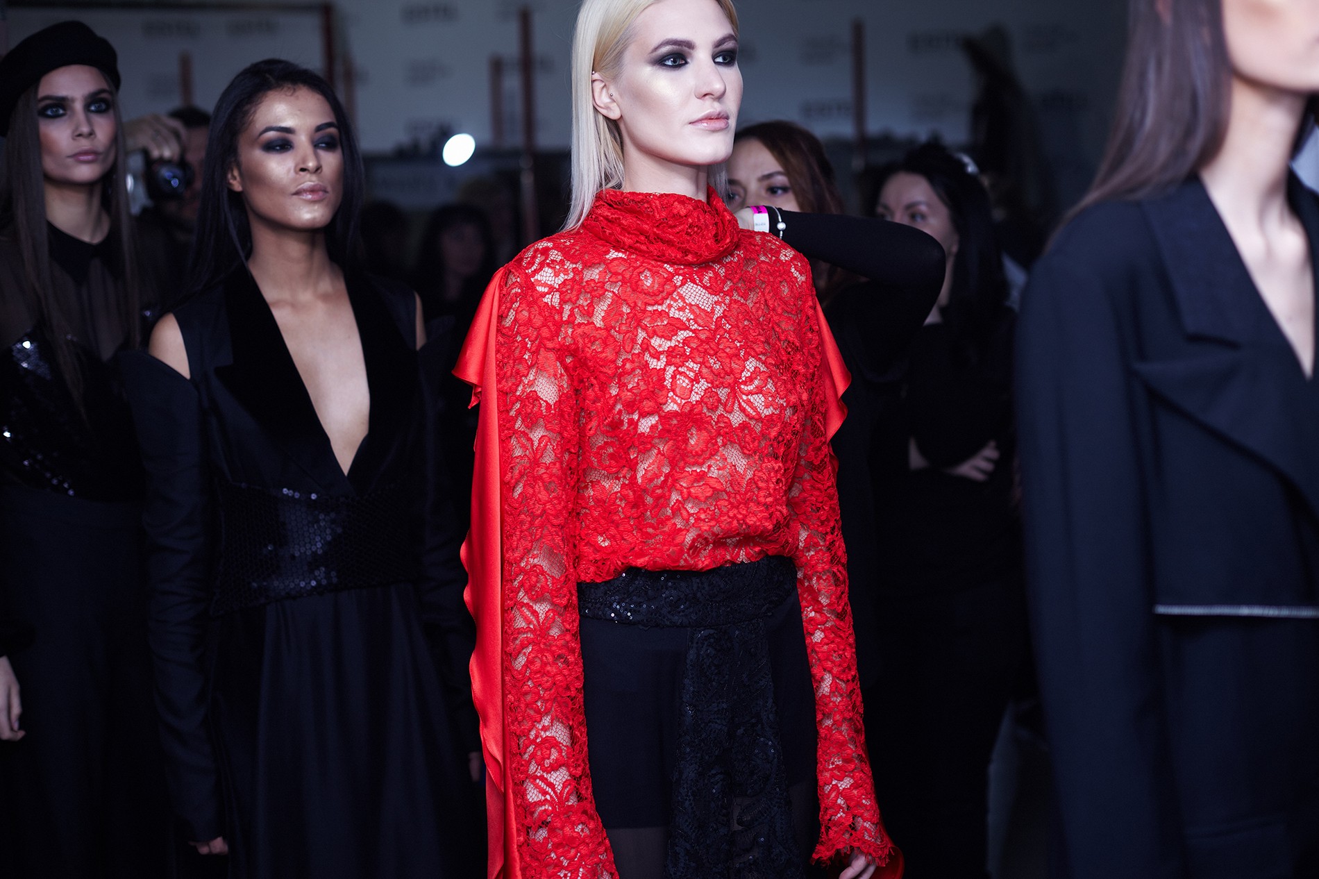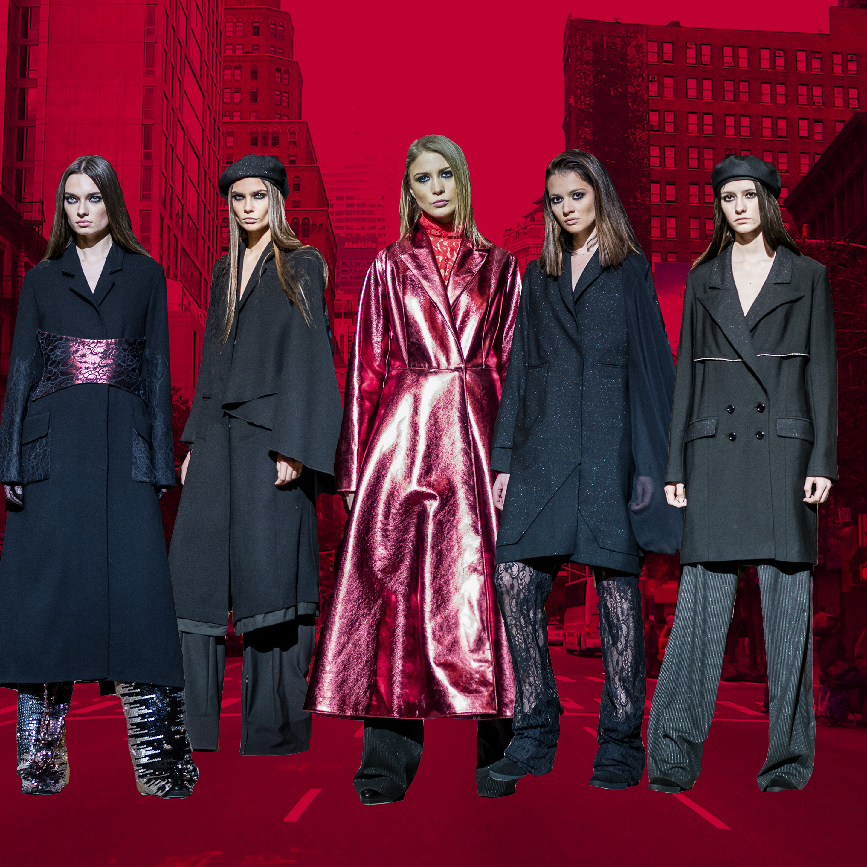 Выйти на улицу в платье, скорее напоминающем пиджак, или в полупрозрачной блузке, строгой деловой юбке и виниловом тренче — не проблема для героини Ляли. Главное — не забыть милую шляпку или берет. Дизайнер, будто вспоминая роман Стендаля «Красное и черное», посвящает этой комбинации цветов всю коллекцию. Так она проводит параллель между сильным характером и женственностью.