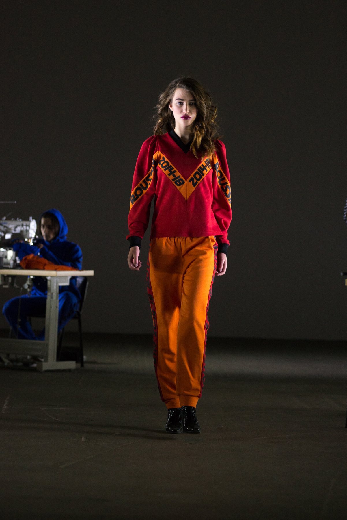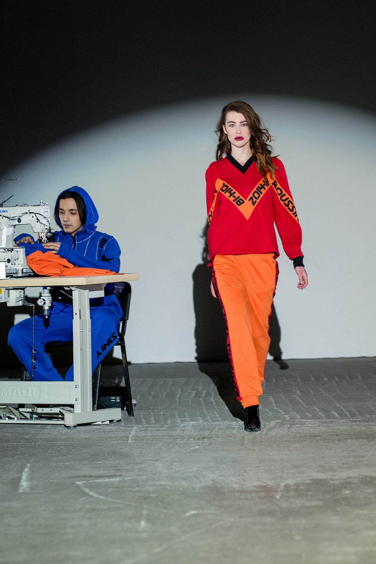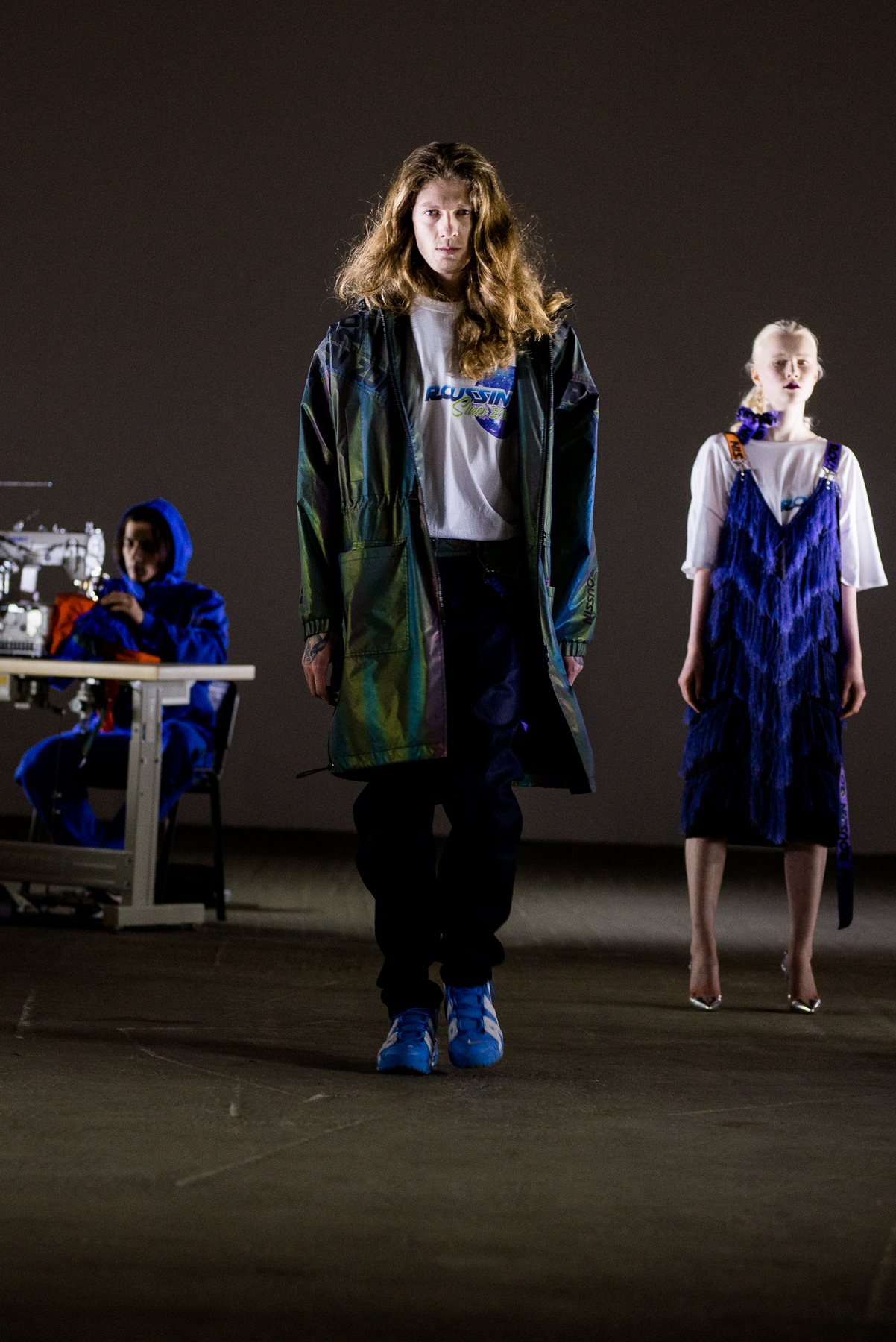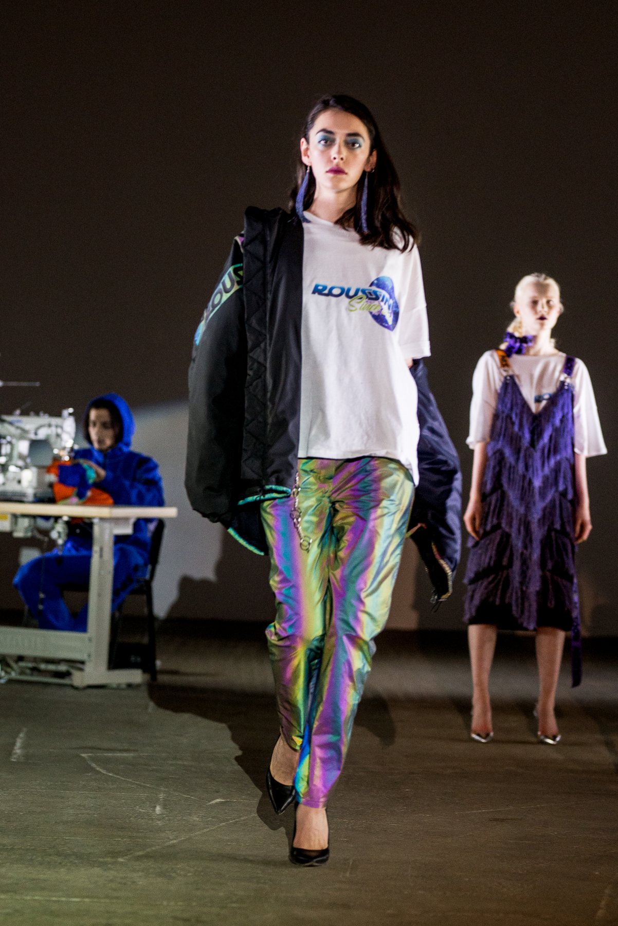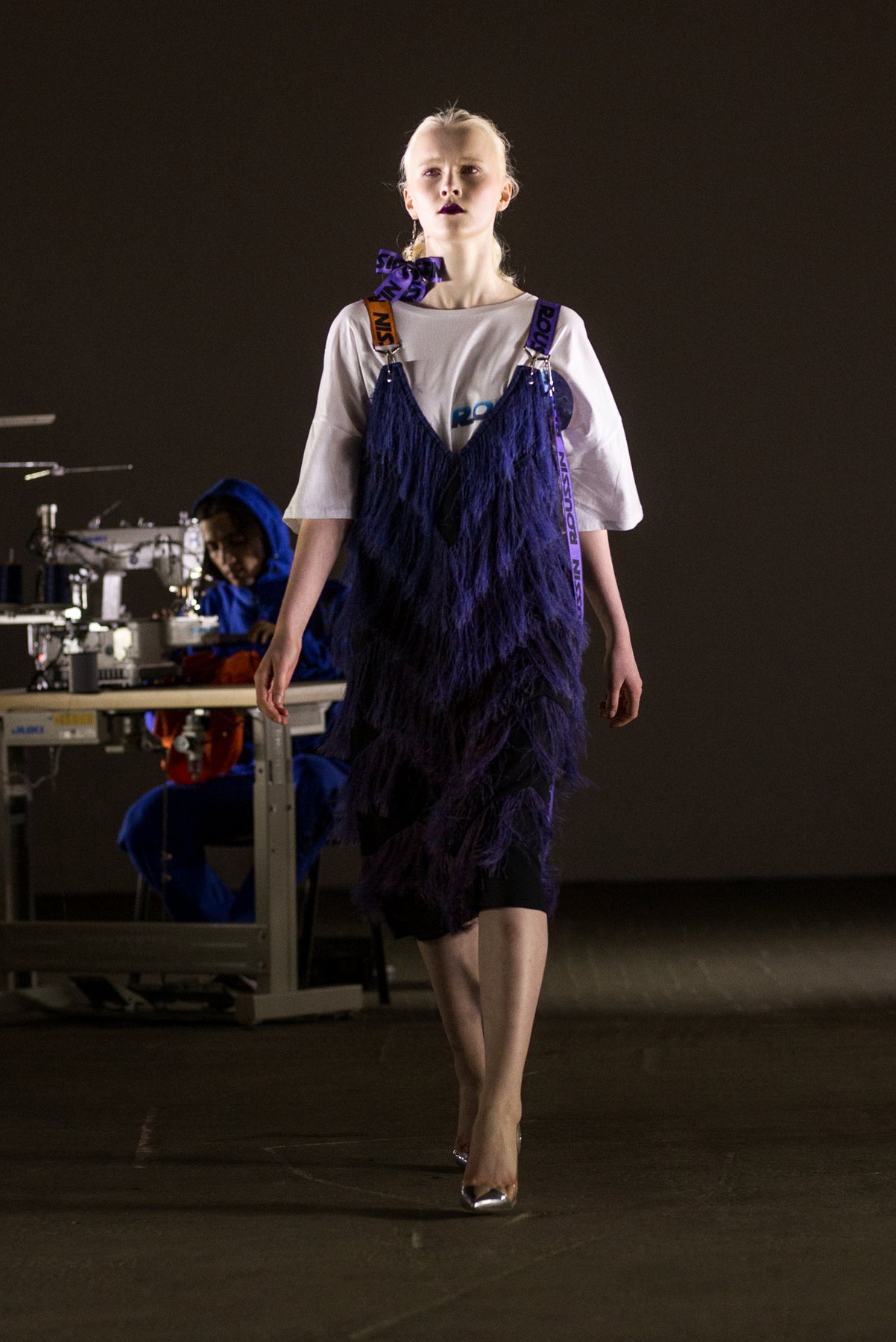 София Русинович, дизайнер бренда ROUSSIN, отказалась от классического формата показа и устроила настоящий перформанс: модели на подиуме в реальном времени примеряли образы швеи, закройщика, конструктора лекал и других, кто создает одежду в больших цехах или на фабриках.