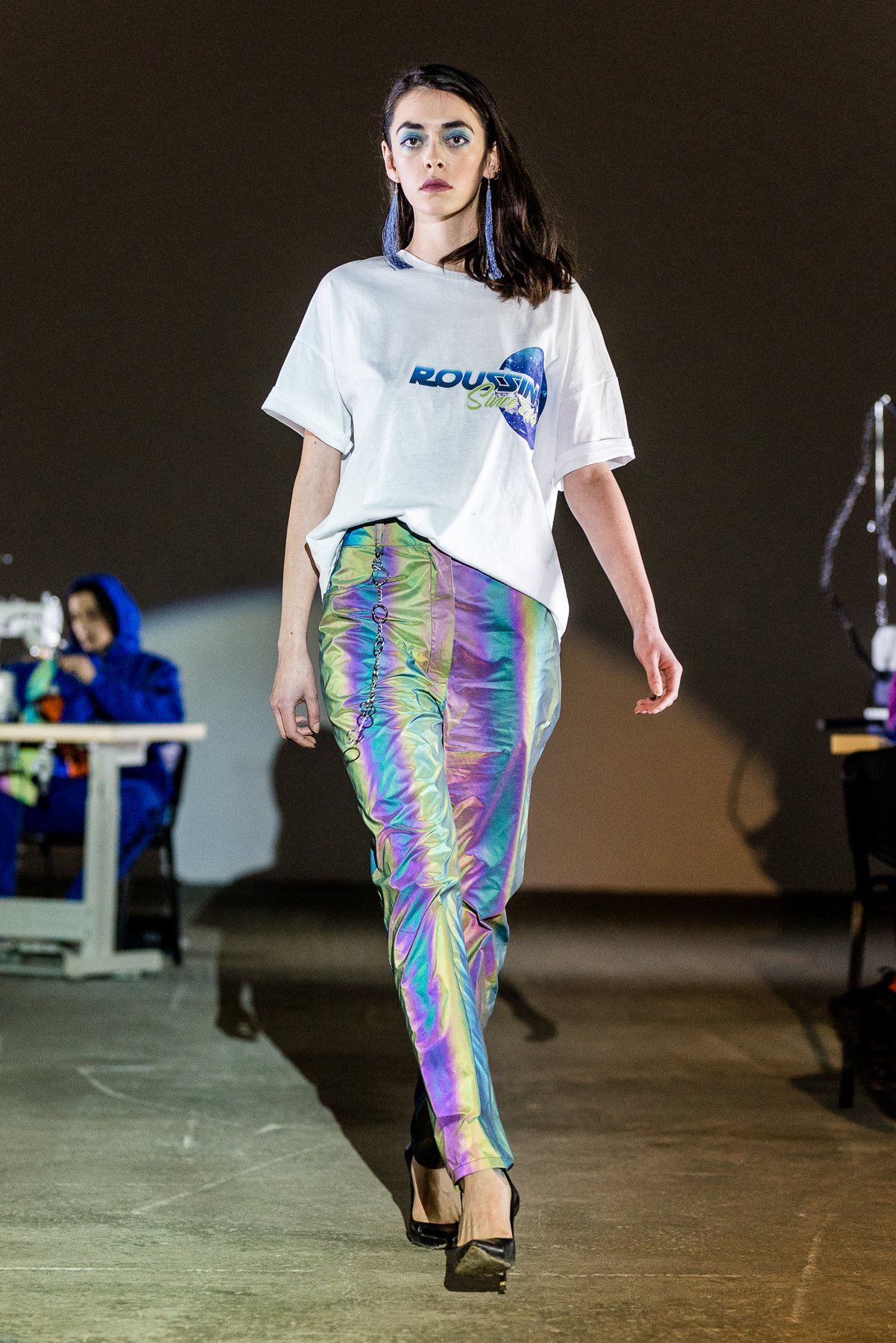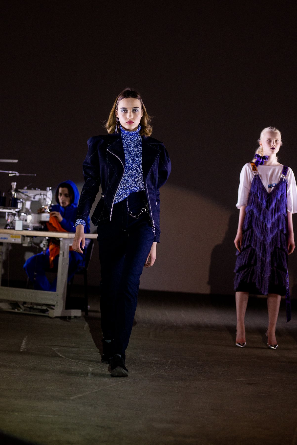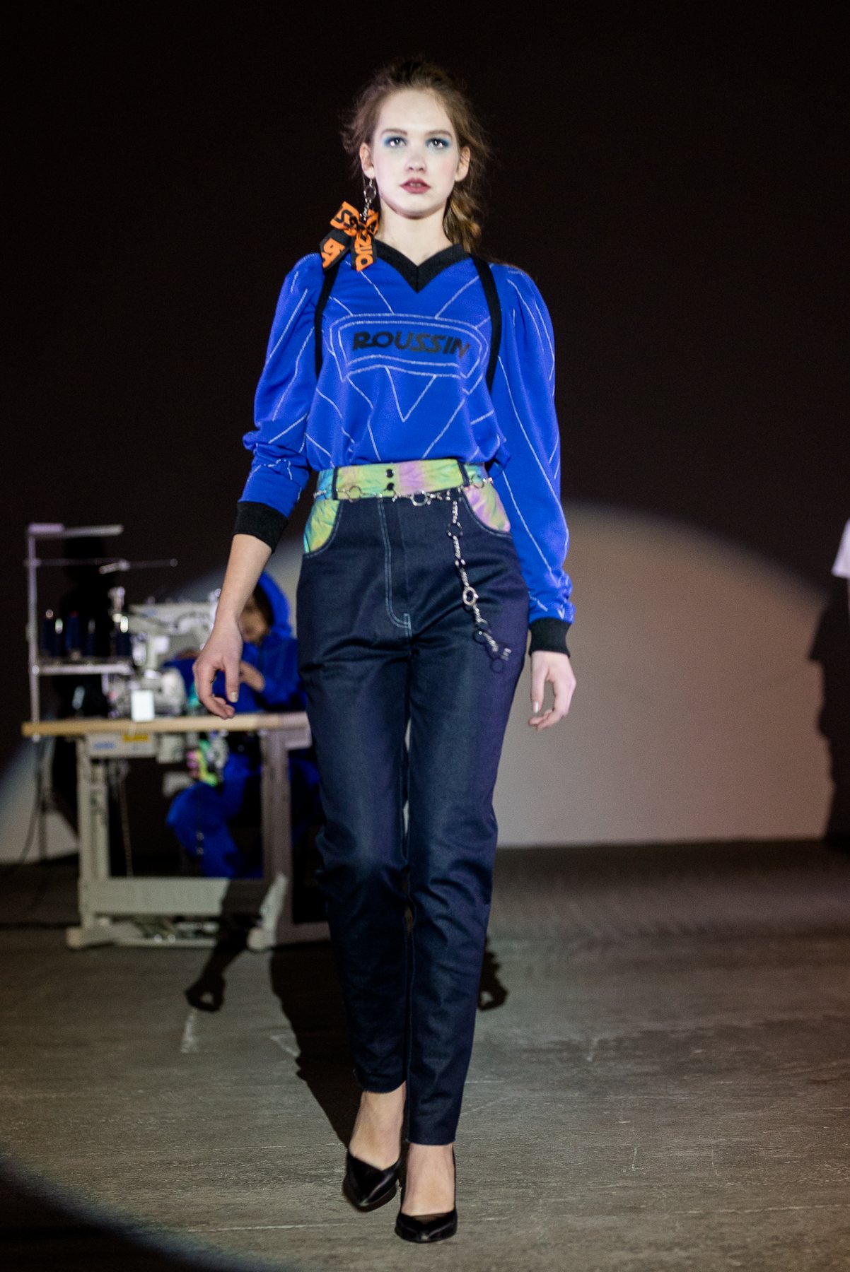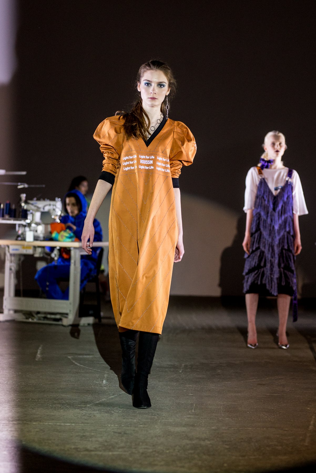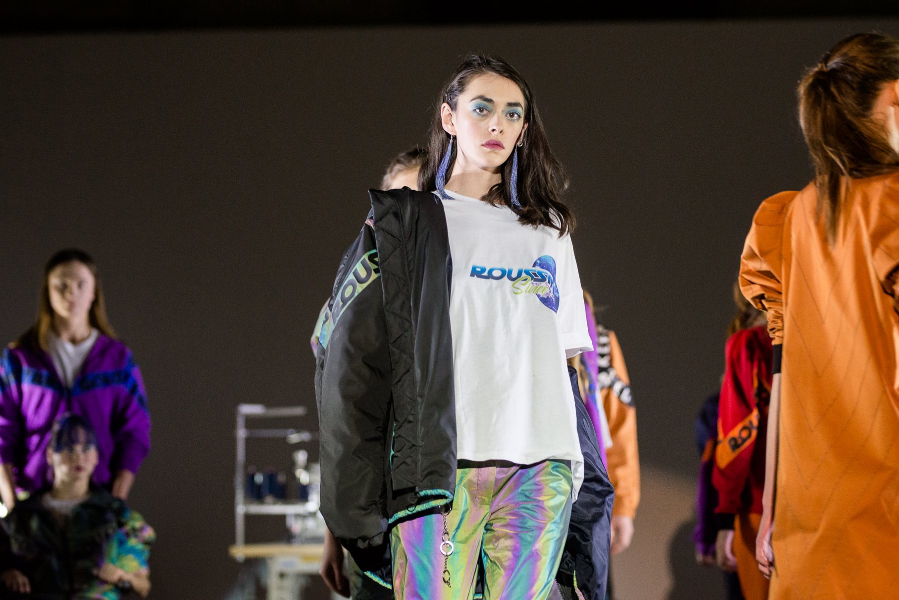 София Русинович, дизайнер бренда ROUSSIN, отказалась от классического формата показа и устроила настоящий перформанс: модели на подиуме в реальном времени примеряли образы швеи, закройщика, конструктора лекал и других, кто создает одежду в больших цехах или на фабриках.