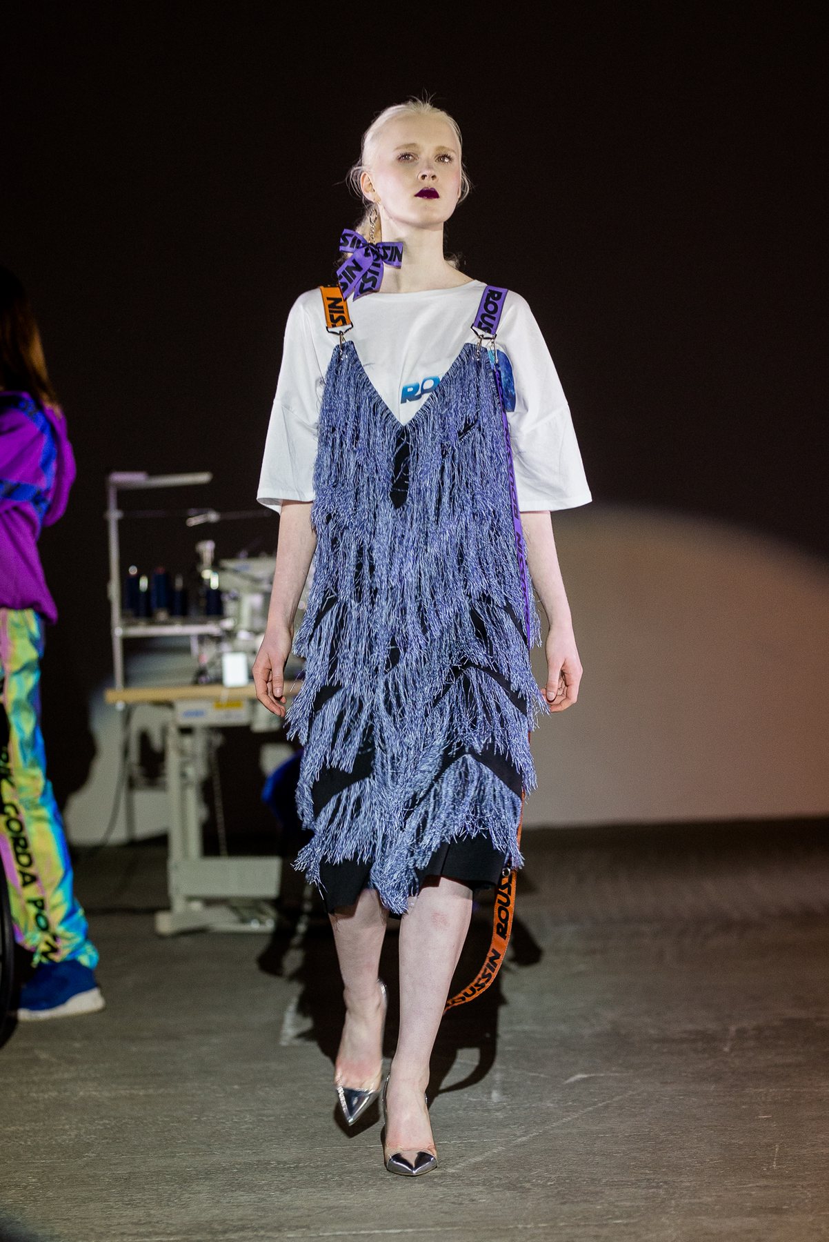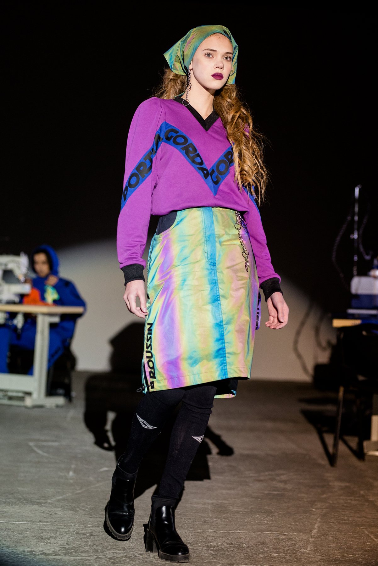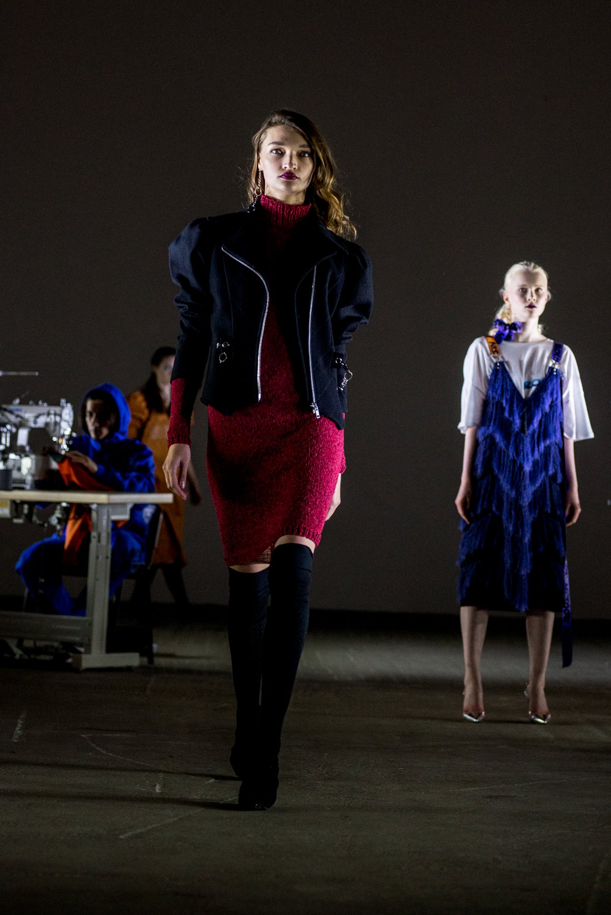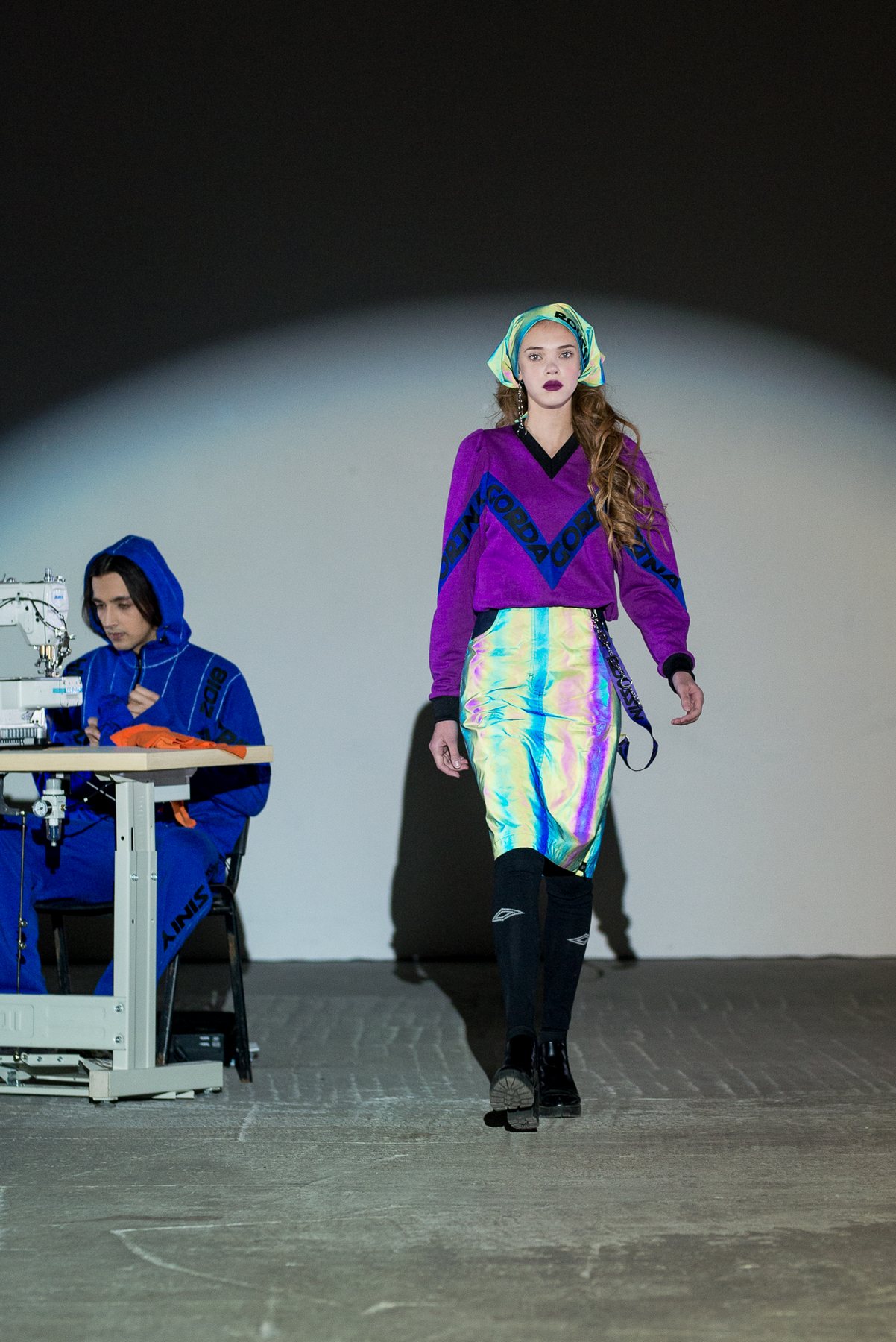 София Русинович, дизайнер бренда ROUSSIN, отказалась от классического формата показа и устроила настоящий перформанс: модели на подиуме в реальном времени примеряли образы швеи, закройщика, конструктора лекал и других, кто создает одежду в больших цехах или на фабриках.