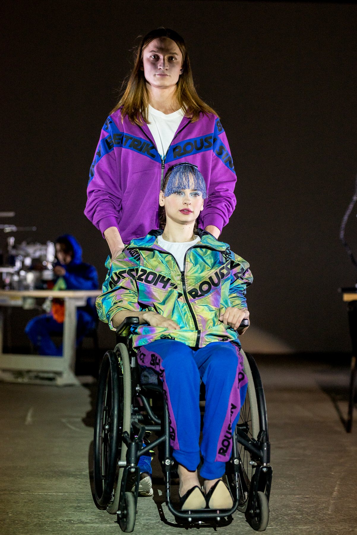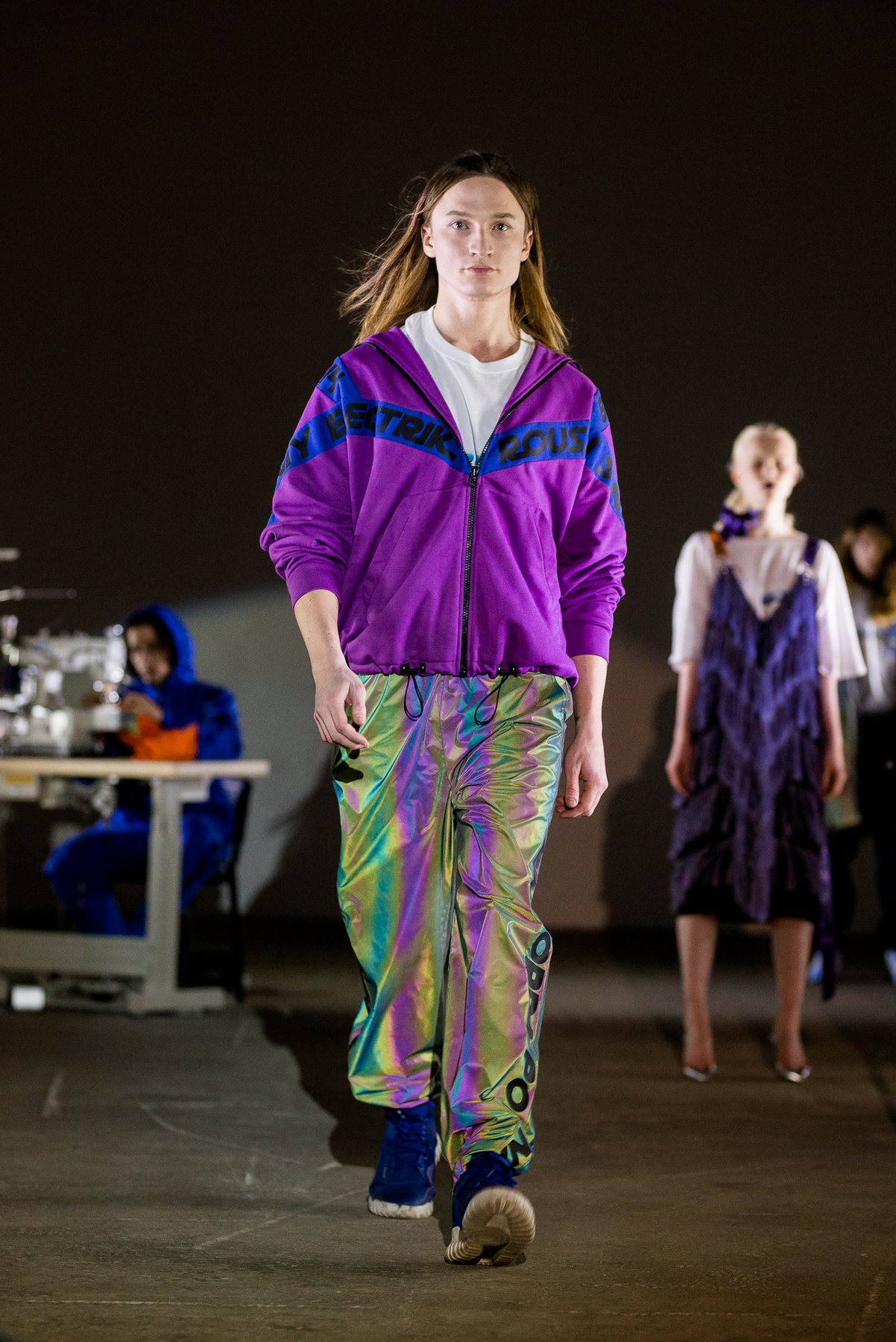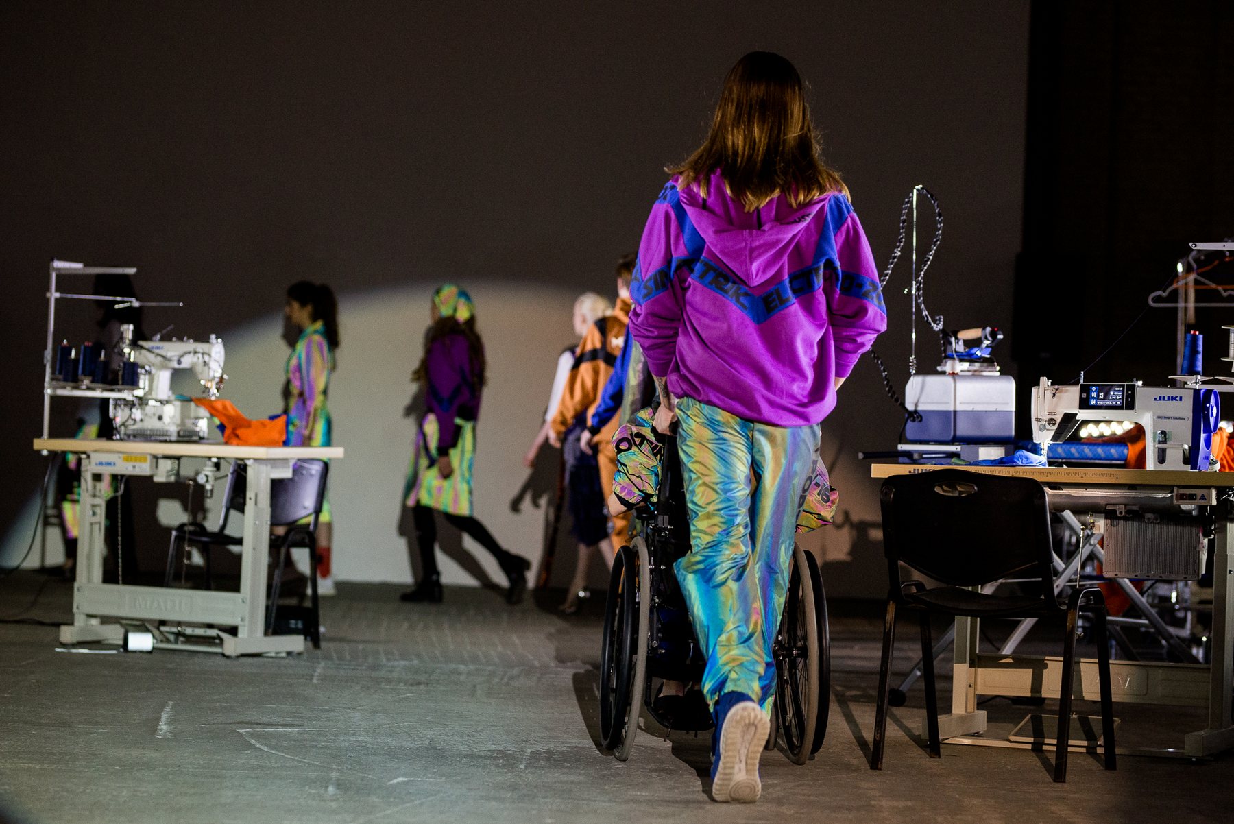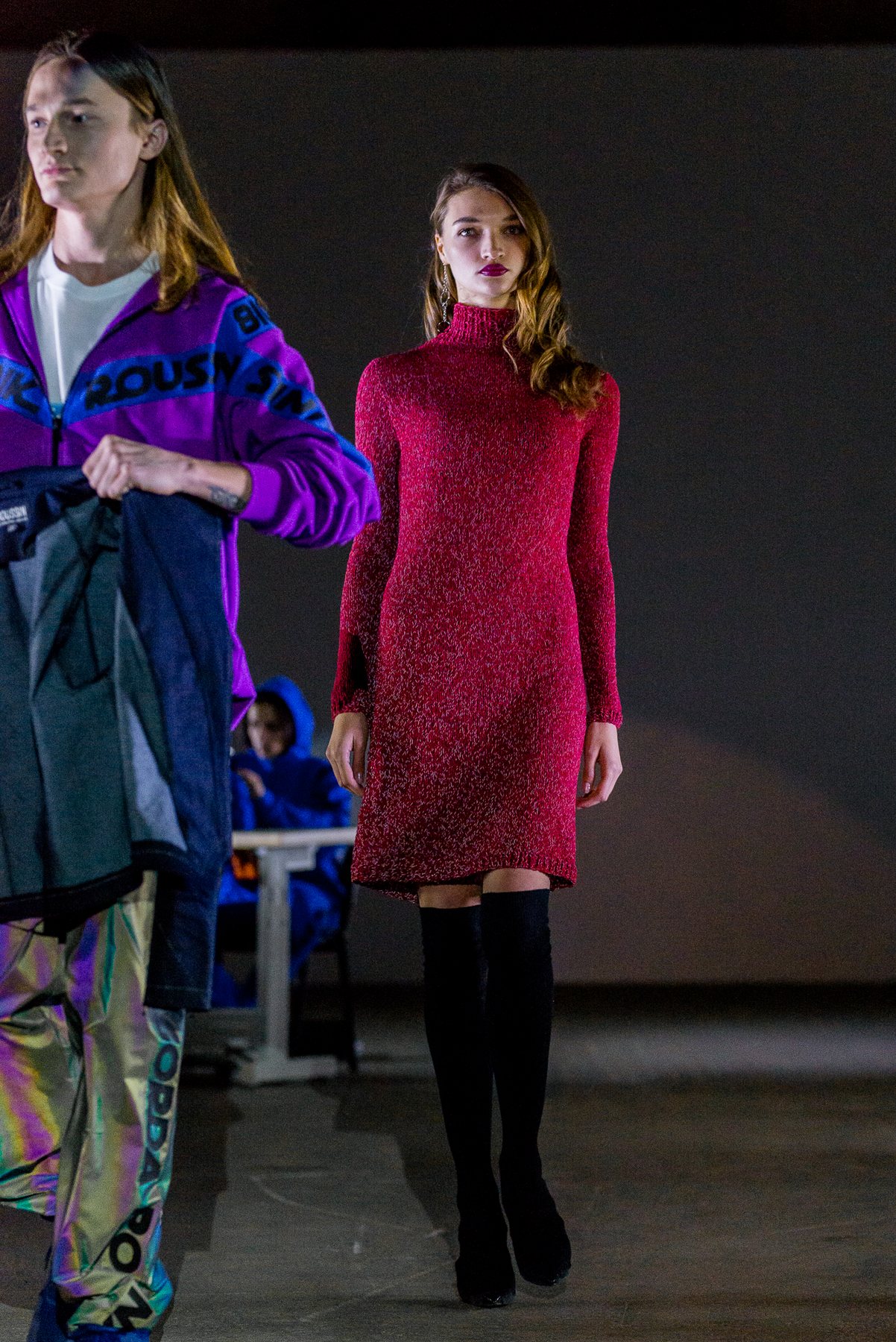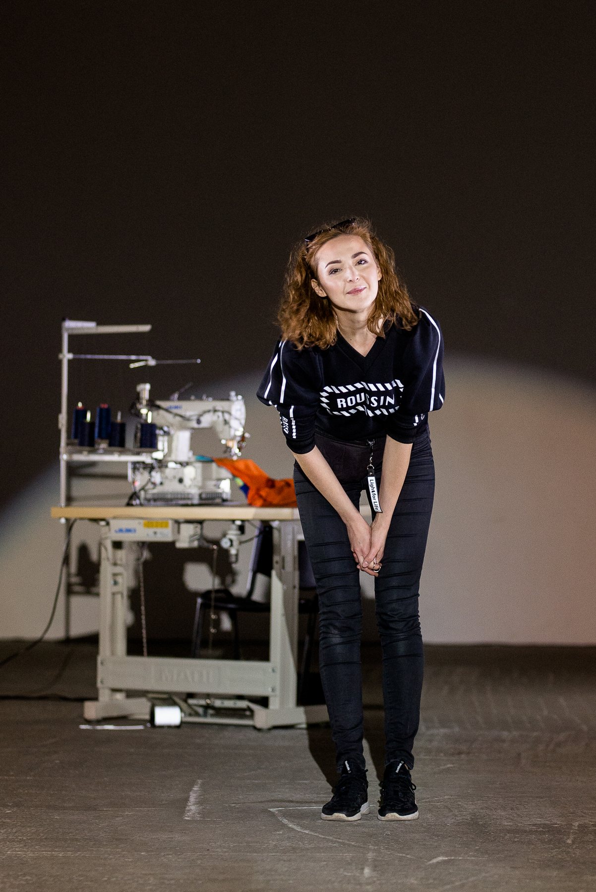 София Русинович, дизайнер бренда ROUSSIN, отказалась от классического формата показа и устроила настоящий перформанс: модели на подиуме в реальном времени примеряли образы швеи, закройщика, конструктора лекал и других, кто создает одежду в больших цехах или на фабриках.