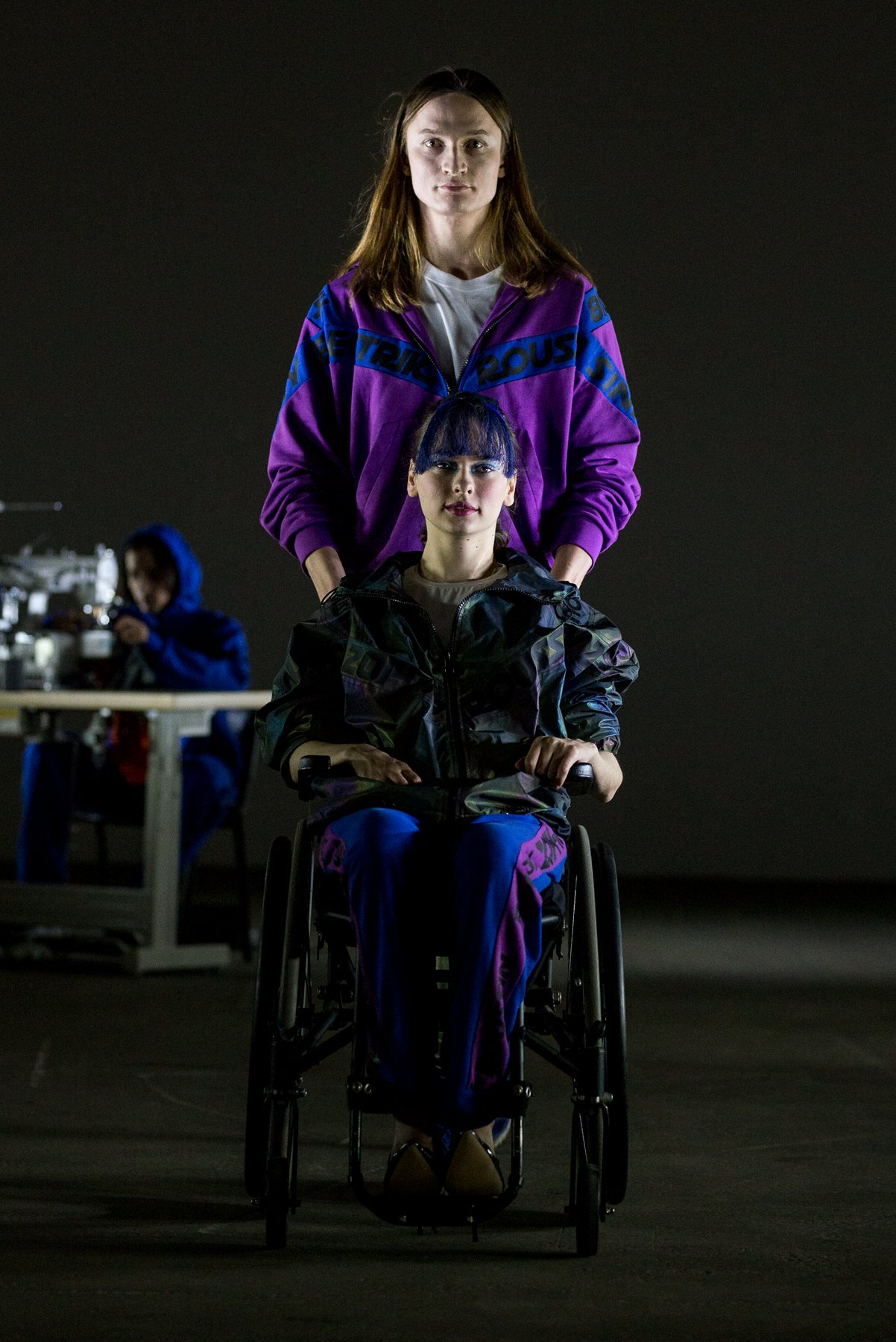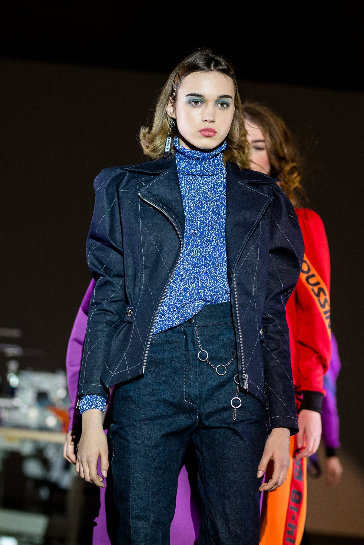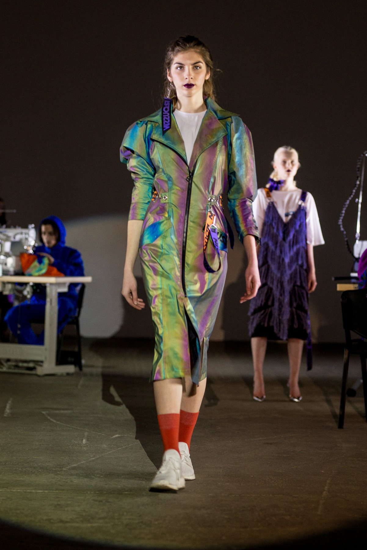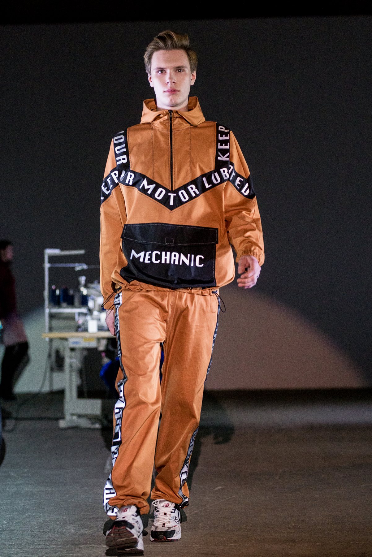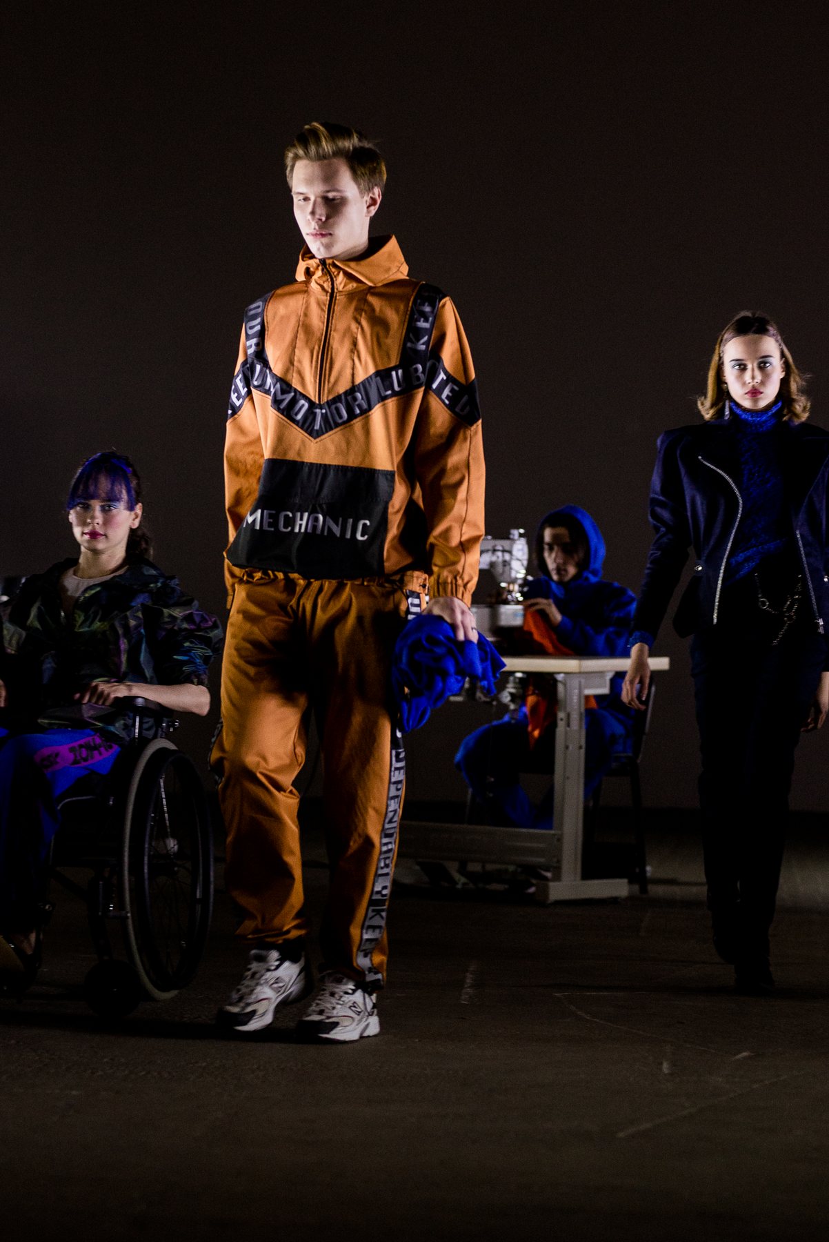 София Русинович, дизайнер бренда ROUSSIN, отказалась от классического формата показа и устроила настоящий перформанс: модели на подиуме в реальном времени примеряли образы швеи, закройщика, конструктора лекал и других, кто создает одежду в больших цехах или на фабриках.