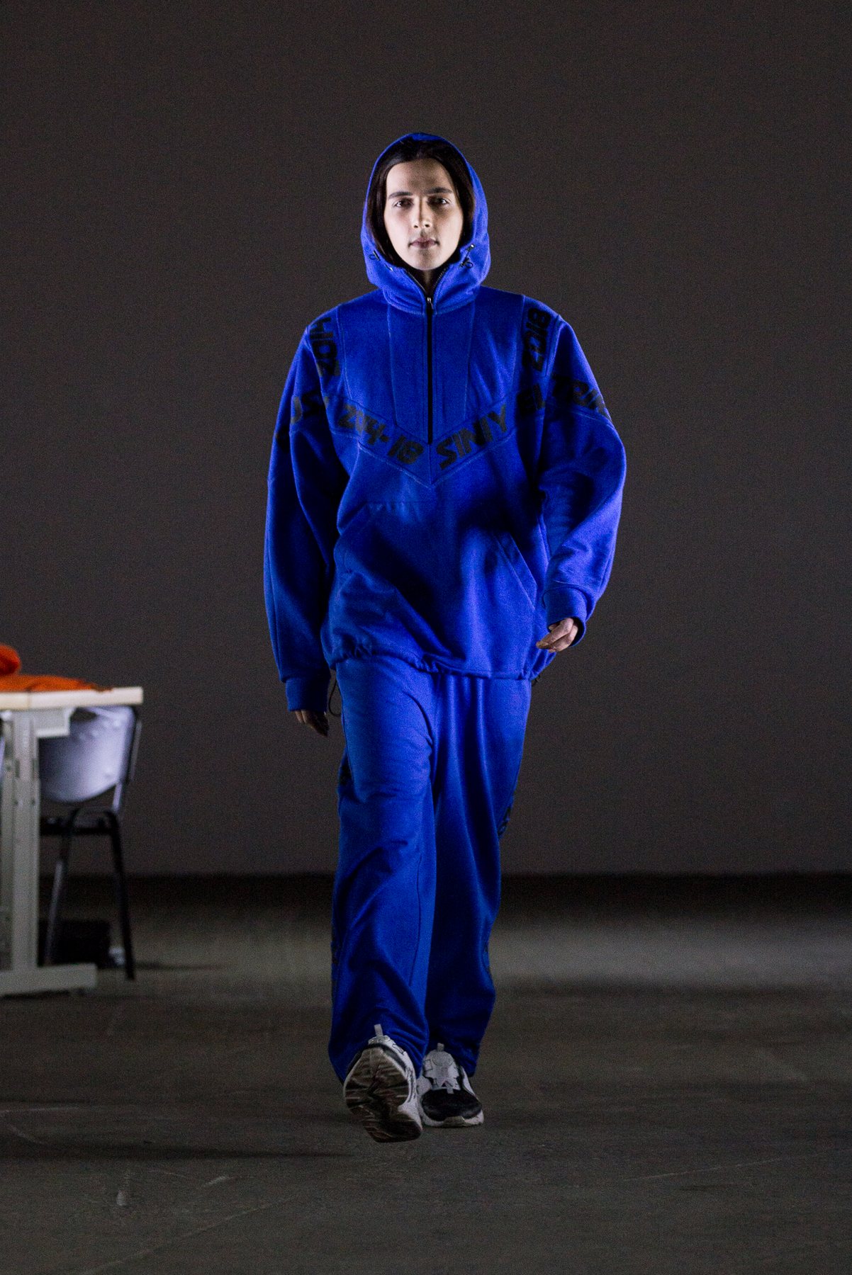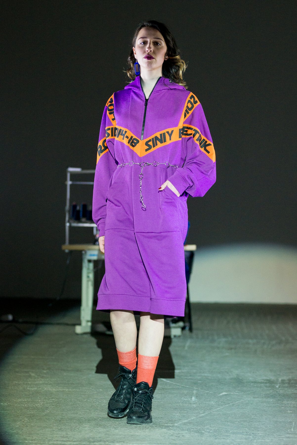 Фасоны в коллекции FW'18-19, по традиции бренда, родом из 80-90-х: много моделей кроя оversize, большие яркие надписи — «Синий электрик» и «Горда портна», — которые изображены достаточно грубым и местами косым шрифтом. Написаны они на популярной сегодня латинице, будто на мобильном телефоне 15-летней давности.