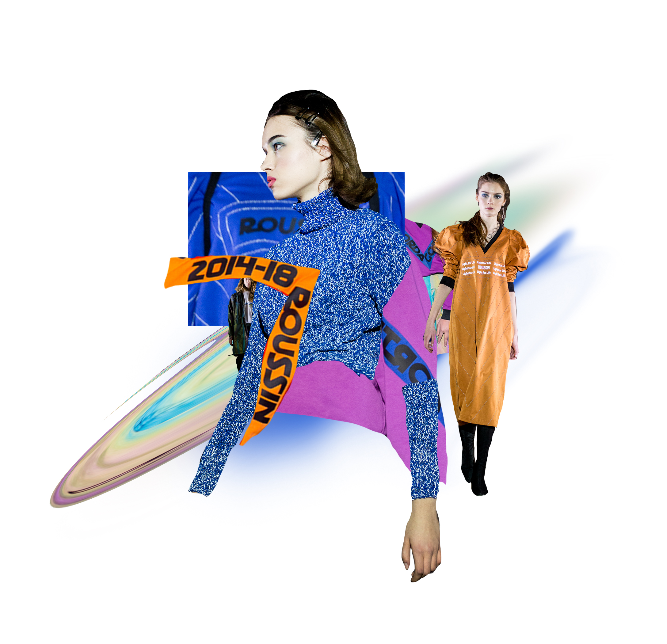 Еще один акцент в коллекции — ткань: София использует ткань-хамелеон, которая отображает свет и переливается. В этой коллекции просматривается след предыдущей линии Light for Life: ROUSSIN вновь используют светоотражающие частички и нити в отделке, тем самым продолжая тему безопасности дорожного движения. Цветовая палитра выстраивается вокруг синих и фиолетовых оттенков, которые контрастируют с красными, оранжевыми цветами и, конечно, черным.