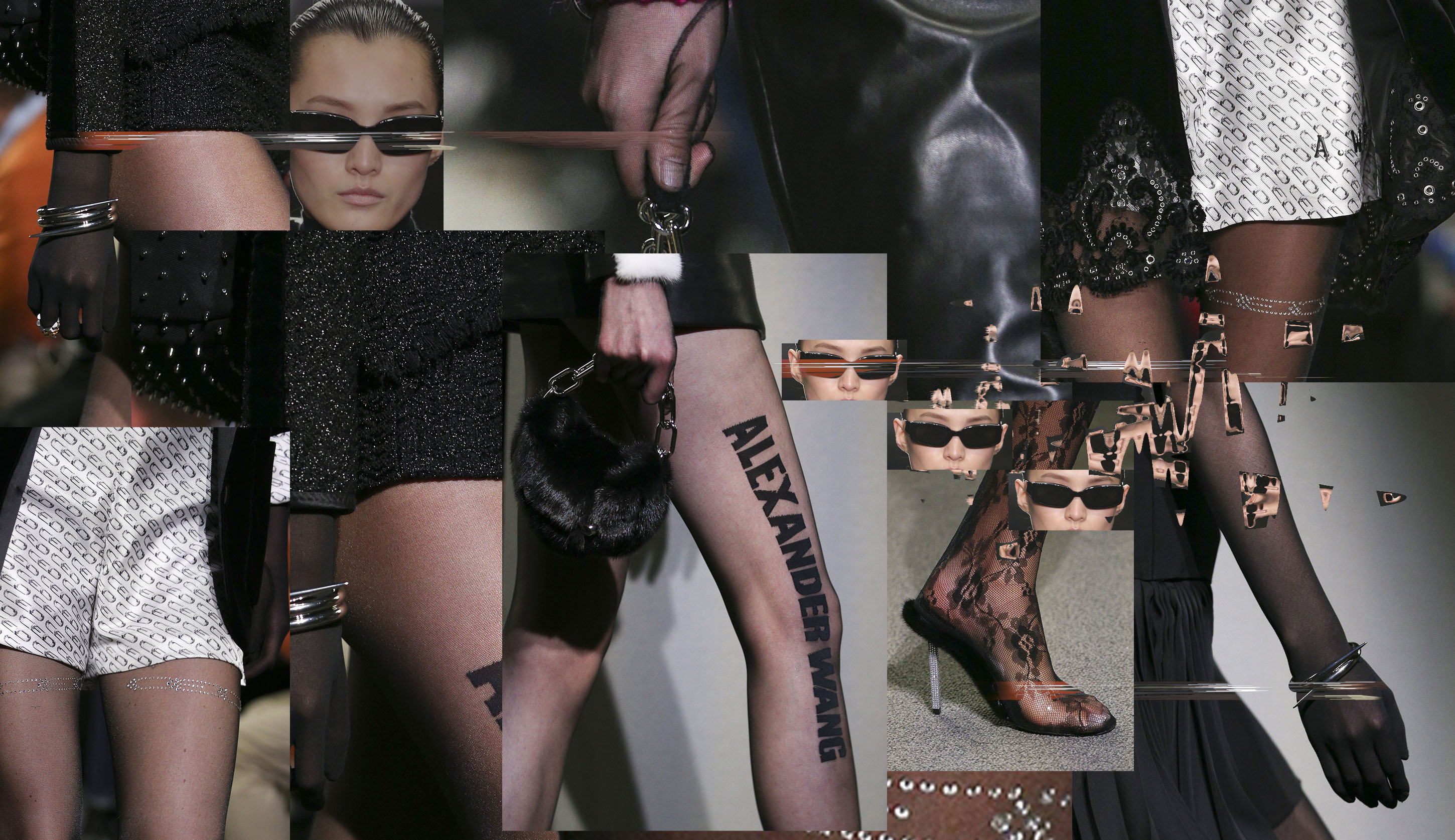 В этом сезоне дизайнер предлагает модели, украшенные цветочным узором, – он настолько по душе Вэнгу, что тот не позволяет даже обуви перекрывать флористическое плетение, надевая на моделей прозрачные мюли. Еще Александр украшает колготки огромным логотипом Alexander Wang на внешней части бедра, благодаря чему это выглядит как татуировка, и стразами на передней части. В общем-то, мы согласны с Вэнгом в том, что слишком долго капроновые колготки оказывались в тени и подвергались остракизму, – если украсить их стразами, это вполне себе стоящий аксессуар. Более стоящий, чем меховая сумка-пакет, которую тоже можно было увидеть в коллекции Alexander Wang.