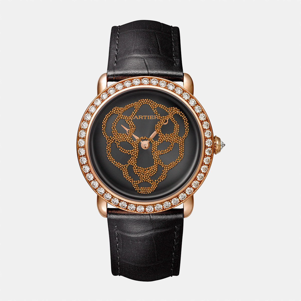 Абсолютный «Инстаграм»-хит минувшей выставки и одна из ярких новинок, модель Révélation d'une Panthère по праву заслужила все «лайки» и восторженные отзывы. Здесь, как в песочных часах, мельчайшие крупицы золота находятся в постоянном движении на запястье, а в минуты покоя складываются в портрет хищной кошки. Магический трюк, секрет которого защищают два патента на изобретения, работает благодаря специальной жидкости под стеклом и гранулированному золоту, а общий градус волшебства поддерживают классический круглый корпус диаметром 37 миллиметров и выложенные по безелю бриллианты (как заведено у Cartier, с наилучшими характеристиками).
