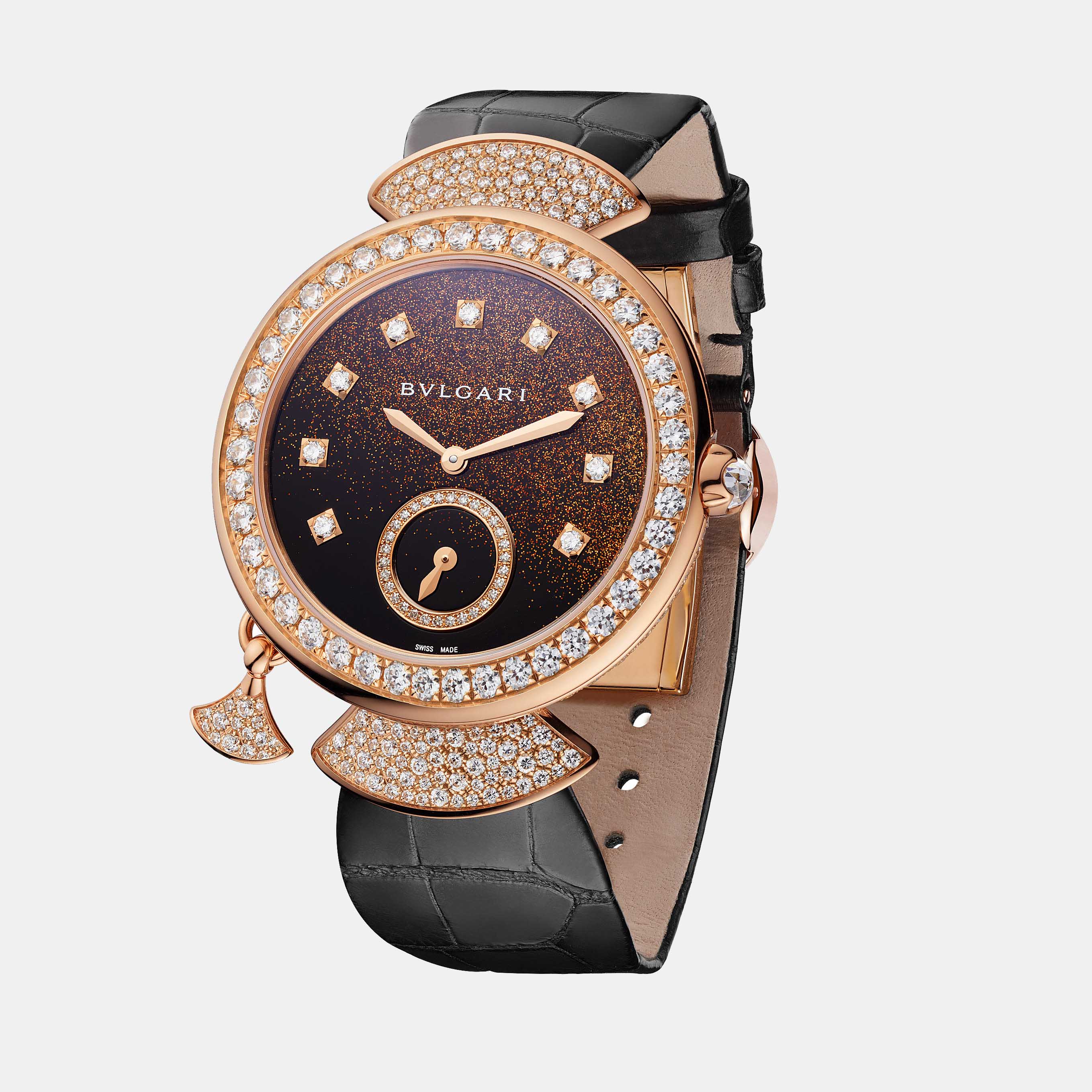 Итальянская марка Bvlgari в SIHH не участвует, но все же заскочила в Женеву, чтобы заинтриговать публику перед мартовским сезоном больших премьер в Базеле. Одна из новинок прозвучала особенно торжественно, причем в самом буквальном смысле – в коллекции Divas’ Dream появился минутный репетир. Классический круглый корпус в бриллиантовом паве неожиданно наполнился драмой – оперные страсти проявились в сочетании черного лака и пыли розового золота на циферблате, пусковую кнопку музыкального механизма заменила миниатюрная подвеска в форме веера, знаковая для всей линейки часов и украшений Divas’.